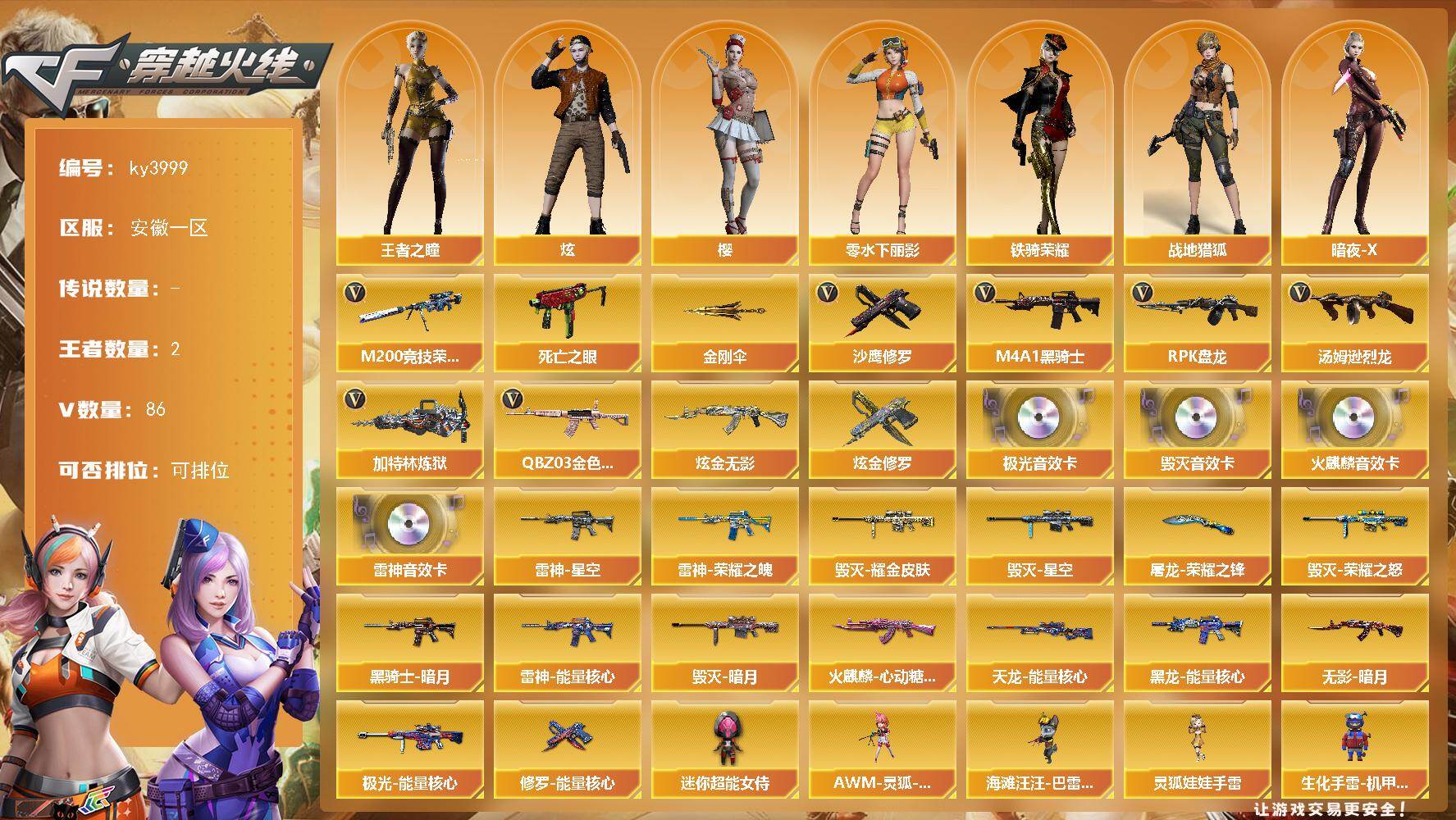 [15245276]安徽一区-86V-2王者-2炫金 【热门武器】:QBZ03-金色蔷薇,M200-竞技荣光,死亡之眼*2,M4A1-黑骑士,汤姆逊-烈龙*6,RPK-盘龙*6,加特林-炼狱,沙鹰-修罗*6,金刚伞 【王者炫金武器】:炫金无影,炫金修罗 【音效卡】:AK47-火麒麟音效卡*2,M4A1-雷神音效卡,Barrett-毁灭音效卡,Barrett-极光音效卡 【皮肤】:雷神-能量核心,雷神-荣耀之魄,雷神-星空,火麒麟-心动糖果,毁灭-暗月,毁灭-荣耀之怒,毁灭耀金皮肤,毁灭-星空,黑龙-能量核心,黑骑士-暗月,无影-暗月,天龙-能量核心,极光-能量核心,修罗-能量核心*2,屠龙-荣耀之锋*2 【角色】:樱,炫,战地猎狐,王者之瞳,暗夜-X,初恋灵狐,风暴女,嘉年华灵狐,兰-海滩派对,零-水下丽影,潘多拉-X,斯沃特-X,铁骑荣耀,兔囡囡 【人偶武器】:AWM-灵狐-15周年嘉年华,海滩汪汪-巴雷特,生化手雷-机甲核心,迷你超能女侍,灵狐娃娃手雷 【暴走生化】:死亡之眼*2 【挑战大师】:冰龙粉碎者-白马银枪,神圣爆裂者-末日III 【英雄级武器】:M4A1-千变,AK47-火麒麟*3,M4A1-黑龙,M4A1-雷神*2,M4A1-黑骑士,M4A1-死神,AK12-天启,AN94-超新星,M4A1-武圣,M4A1-雷霆,无影-神兵利器,M4A1-玫瑰精灵,QBZ03-金色蔷薇,AK-47-猩红传说,AWM-天龙*2,Barrett-毁灭*2,Barrett-极光,AWM-裁决,M200-竞技荣光,RPK-盘龙*6,加特林-炼狱,炼狱-悦蓝-觉醒版,汤姆逊-烈龙*6,沙鹰-修罗*6,沙鹰-天神*2,COP-雷霆,屠龙*4,龙啸,擎天*2,麒麟刺,擎天-竞技荣光,高爆手雷-雷霆*7,高爆手雷-竞技荣光,闪光弹-雷霆*7,闪光弹-竞技荣光,烟雾弹-雷霆*7,烟雾弹-竞技荣光,M4A1-赤狱骑士 【道具】:云山科技背包,亚洲杯纪念炫彩背包,全能枪王背包,女皇终结者-背包,战舰背包,炫彩背包,女皇终结者-魔龙之吻,救世主-黑桃战神,黄金生化钩,绿色巨人,灵魂忍者*2,变异宝贝,迷雾幽灵*2,夺命之镰,防化服*3,金色流光-枪王排位,流光-再燃火线,枪王排位29赛季金色流光,电玩兔兔表情,炽雪表情,C4-再燃火线*2,防弹头盔*4,防弹衣*4,C4工具钳*4,手雷包*4 【特殊枪械】: