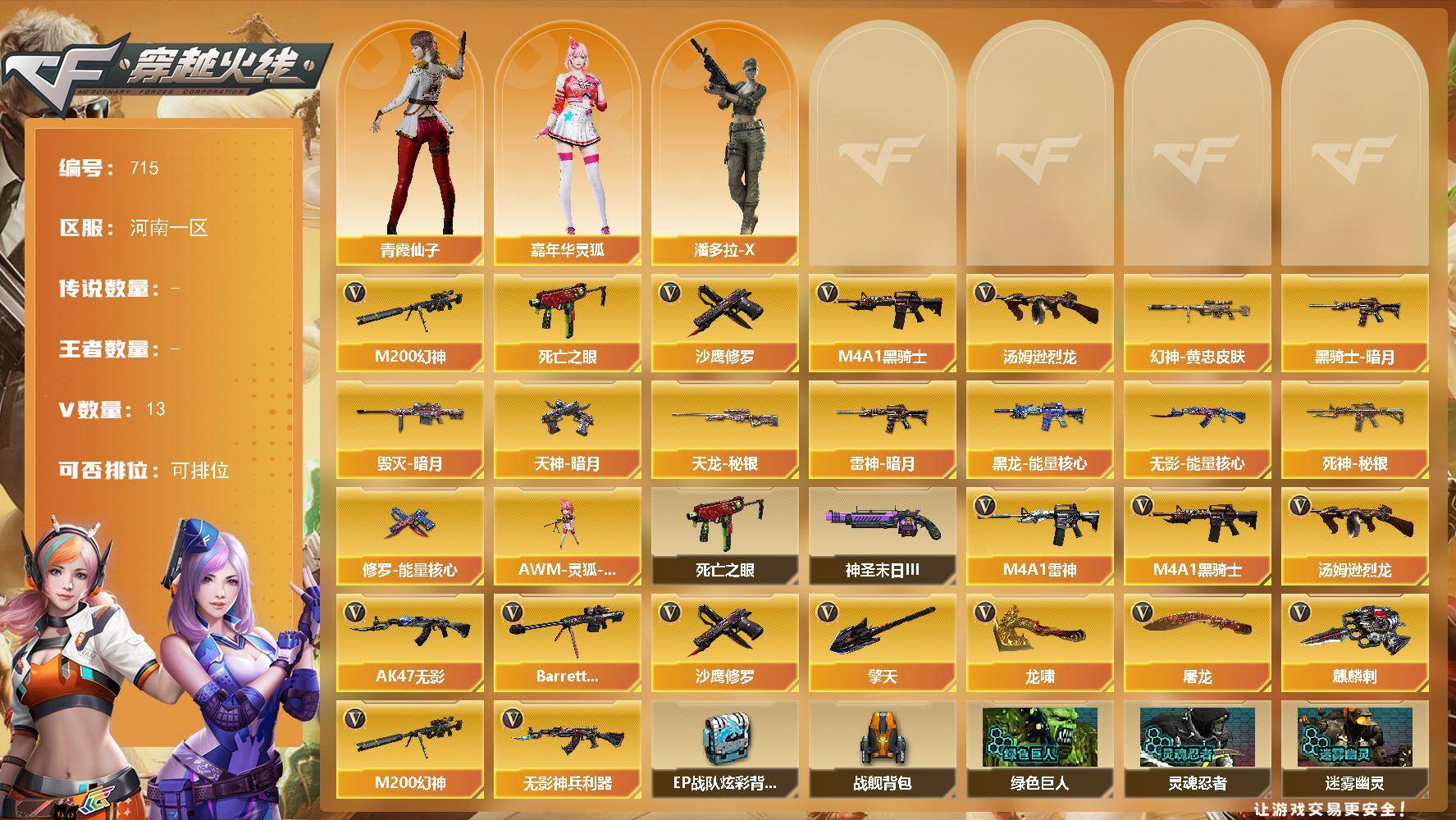 - [15243581]湖南一区-23V-3王者-1炫金 【传说武器】:传说灵眸 【热门武器】:传说灵眸,M200-竞技荣光,QBZ03-街机,沙鹰-修罗 【王者炫金武器】:炫金黑龙 【音效卡】:擎天-云海游龙音效卡,M4A1-雷神-云海游龙音效卡 【皮肤】:幻神-丹凤,雷神-宇航兔皮肤,火麒麟-心动糖果,毁灭-黑大圣皮肤,战神-粉色甜心皮肤,AK47-B-常胜将军-曹操 【角色】:王者凌霄,乔伊教练,修道士,云海玲珑,北极狐-X,初恋灵狐,电竞少女,芳心审判者,飞虎队-X,虎妞,嘉年华灵狐,0号玩家,零-水下丽影,灵狐者-X,灵狐者-七夕宝贝,灵狐者-职业经理,龙儿,曼陀罗-X,潘多拉-X,潘多拉-甜心教官,斯沃特-X,蜀雪,兔囡囡,维纳斯 【人偶武器】:AWM-灵狐-15周年嘉年华,迷你裂空之翼,迷你波特博士*2,迷你火种,生化手雷-机甲核心,迷你超能女侍 【暴走生化】:超级对讲机 【挑战大师】:神圣爆裂者III*2,冰龙粉碎者-白马银枪*2,激光毁灭者III-白马银枪*2,VEPR-12-金魔*2,激光毁灭者III,机甲撕裂者III,神圣爆裂者-末日III*2,阐释者III 【英雄级武器】:AK47-火麒麟,M4A1-雷神,无影-神兵利器,黑武士-锦绣游龙,烈火-动感闪耀,王者之城-觉醒版,M200-竞技荣光,烈龙-云海游龙,沙鹰-修罗,天神-动感闪耀,屠龙-动感闪耀,擎天-云海游龙,高爆手雷-幻灵,高爆手雷-竞技荣光,手雷-动感闪耀,手雷-云海游龙,闪光弹-竞技荣光*2,闪光弹-神工天巧,烟雾弹-竞技荣光,烟雾弹-神工天巧 【道具】:BS战队炫彩背包,CFS限定背包,云海游龙炫彩背包,全能枪王背包,女皇终结者-背包,超级背包,女皇终结者-魔龙之吻,绿色巨人,灵魂忍者*2,变异宝贝,迷雾幽灵*2,生化弹匣,夺命之镰,防化服*4,金色流光-枪王排位*2,星辰流光-枪王排位,流光-鎏金之域,枪王排位28赛季金色流光,枪王排位29赛季金色流光,电玩兔兔表情,动感闪耀表情,云海游龙表情,EP战队名片,EP战队喷图,EP战队击杀图标,防弹头盔*4,防弹衣*4,C4工具钳*4,手雷包*4 【特殊枪械】: