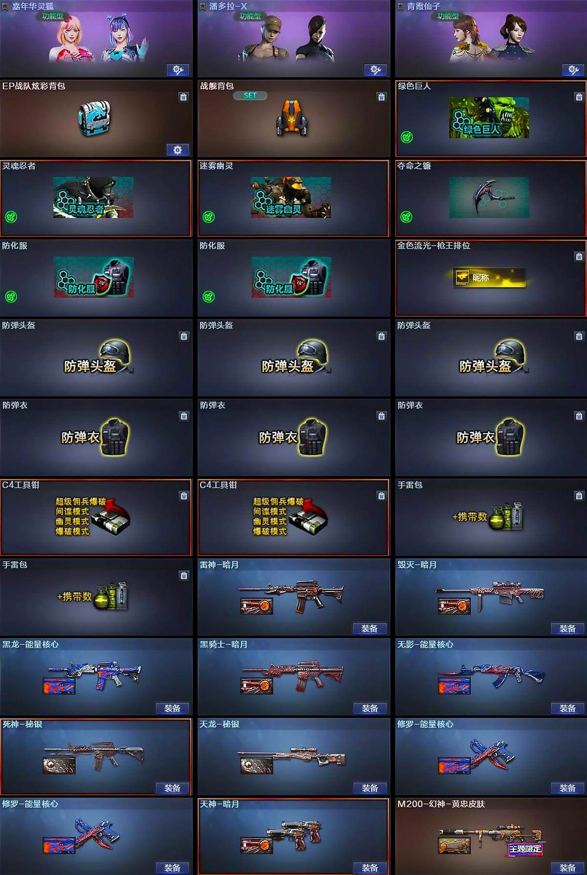【道具】:EP战队炫彩背包,战舰背包,绿色巨人,灵魂忍者,迷雾幽灵,夺命之镰,防化服*2,金色流光-枪王排位,防弹头盔*3,防弹衣*3,C4工具钳*2,手雷包*2
