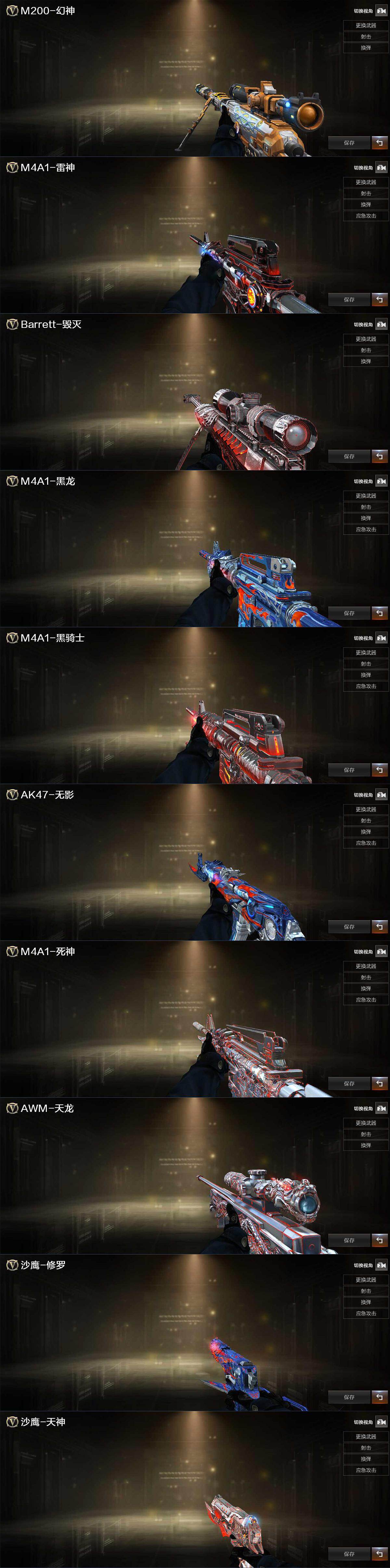 【英雄级武器】:M4A1-雷神,M4A1-黑骑士,AK47-无影,无影-神兵利器,Barrett-毁灭,M200-幻神,汤姆逊-烈龙,沙鹰-修罗,屠龙,龙啸,擎天,麒麟刺*2