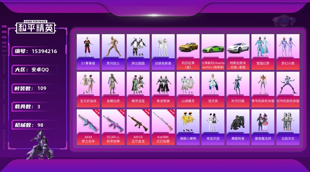 - [12165822]4粉装 8特效枪 1载具 可二次 可修改实名 连体王者 优质装备:M416墨龙九天,GROZA-镜光银凌,AUG-许七安,七级AUG-许七安,女娲灵识,星穹咏叹调,MK14-甜梦熊击,幻彩电音,MG-36-幻彩电音,Vector-最终圣卫者,Kar98K-巳巳如意 热门装扮:守护天翼 稀有枪皮:DP-28-豹影疾电 五级特效枪:五级GROZA-镜光银凌,五级Kar98K-巳巳如意,五级MG-36-幻彩电音,五级DP-28-豹影疾电,五级MK14-甜梦熊击 三级特效枪:三级M416-墨龙九天,三级Vector-最终圣卫者 紫色装扮:霓虹热舞,极速光影,云朵鹅,雪绒豹,SS33特训套装,青涩时光,顶瓜瓜,电音精灵,长空猛禽,超能勇士,无面战甲,蜜露汐语,龙魂突击队,柠萌假日,暗黑骑手,白熊同盟,多纳泰罗,星途旅人,创世·幻影,听雨铃兰,异域银装,石蕴玉辉,鱼渊荷华,燕燕于飞,巳巳如意,森林游猎者,青团波波,糖糖葫芦,街头风暴,许七安,临安公主,怀庆长公主,净心行者,智谋强哥,大橘大利,星渊小夜曲,蓝冰羽,紫幽梦,风舞幻音,恋语绒绒 优质战备:墨龙九天降落伞,龙翔九天飞行器,精灵梦叶罗丽降落伞,时空协奏降落伞,镜域双华-灵镜之阶,沙丘之主降落伞,沙丘之主天马飞行器,幻彩电音降落伞,幻星舰长飞行器,辉羽雀灵降落伞,御兔特攻飞行器,雀灵庇佑飞行器,终晖之翼飞行器,冷漠罗丽降落伞,万象金身飞行器,赛博古神降落伞,祥瑞起舞飞行器,酣梦熊熊飞行器,临安公主降落伞
