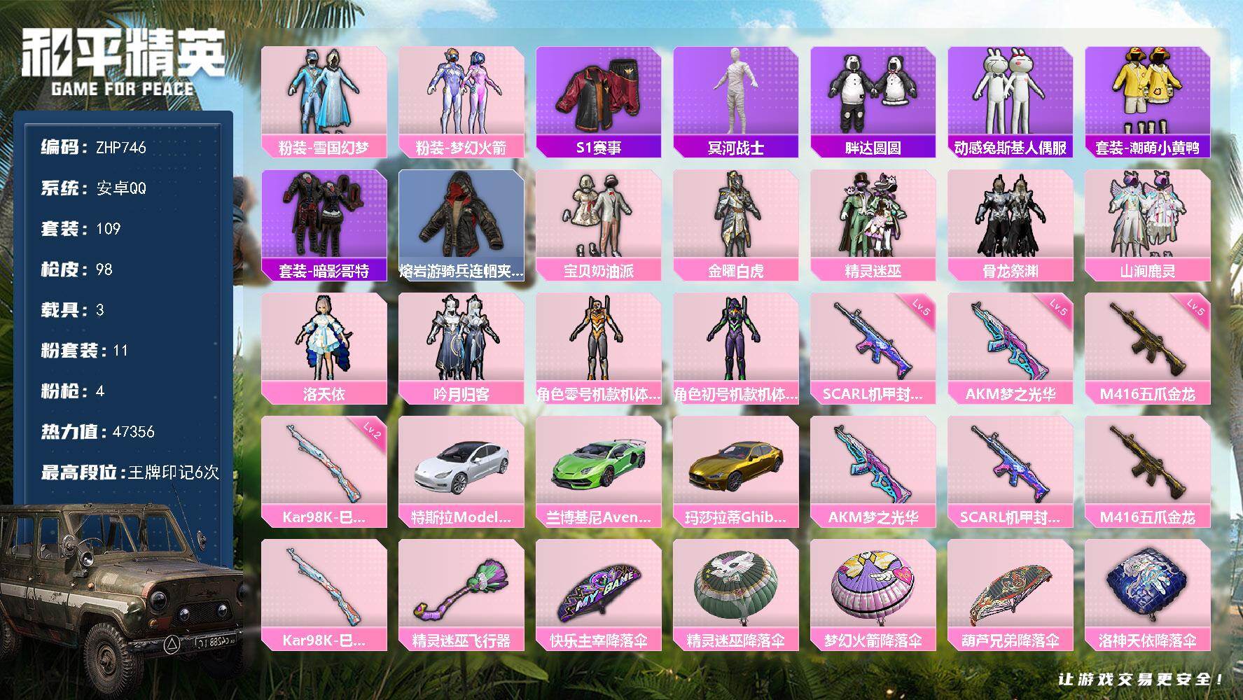[15394216]小素材号!双字ID!港澳!金玛莎绝版S1赛事木乃伊黄绿螳螂洛天依-11粉装-4特效枪-3载具-1粉色飞行器-47356热力值-6王牌印记-109套装-98枪皮 【热门品类】:粉装-雪国幻梦,粉装-梦幻火箭,套装-S1赛事,套装-冥河战士,套装-胖达圆圆,套装-动感兔斯基人偶服,套装-潮萌小黄鸭,套装-暗影哥特,熔岩游骑兵连帽夹克 【粉色套装】:粉装-宝贝奶油派,粉装-金曜白虎,粉装-雪国幻梦,粉装-精灵迷巫,粉装-梦幻火箭,粉装-骨龙祭渊,粉装-山涧鹿灵,角色-洛天依,粉装-吟月归客,角色-零号机款机体服,角色-初号机款机体服 【粉色枪皮等级】:AKM-梦之光华(五级),SCAR-L-机甲封神(五级),M416-五爪金龙(五级),Kar98K-巳巳如意(二级) 【粉色载具】:特斯拉Model 3(珍珠白),兰博基尼Aventador SVJ(翡翠绿),玛莎拉蒂Ghibli(金) 【粉色枪皮】:AKM-梦之光华,SCAR-L-机甲封神,M416-五爪金龙,Kar98K-巳巳如意 【粉色飞行器】:精灵迷巫飞行器 【粉色降落伞】:快乐主宰降落伞,精灵迷巫降落伞,梦幻火箭降落伞,葫芦兄弟降落伞,洛神天依降落伞,炙焰牛王降落伞 【稀有枪皮】:AKM-彩虹符号,AKM-生命誓言,M16A4-冥河战士,M16A4-幻世战舞者,M16A4-生命誓言,M16A4-魔法学院,SCAR-L-玉兔迎春,SCAR-L-龙宫之主,M416-仓鼠灰灰,M416-绯红前夜,M416-蓝色火焰,M416-魔法学院,GROZA-异彩先驱,GROZA-林间仙鹿,GROZA-生命誓言,GROZA-蓝莓炮弹,GROZA-黑色刀锋,AUG-凝视深渊,AUG-魔法学院,M762-快乐主宰,M762-折纸暴龙,M762-拳皇97,M762-深海曼妙,M762-瑞龙福将,M762-甜心宝贝,Mk47-洛神天依,G36C-时空追击者,AC-VAL-天降萌叽,蜜獾-天降萌叽,UZI-炫彩节奏,UZI-生命誓言,UZI-魔法学院,UMP45-时空追击者,UMP45-生命誓言,UMP45-诡娃娃,Vector-生命誓言,Vector-黑色刀锋,汤姆逊-异彩先驱,MP5K-异彩先驱,MP5K-蓝莓炮弹,Kar98K-梦幻火箭,Kar98K-洛神天依,Kar98K-炫彩节奏,Kar98K-蓝莓炮弹,M24-治愈之星,SKS-