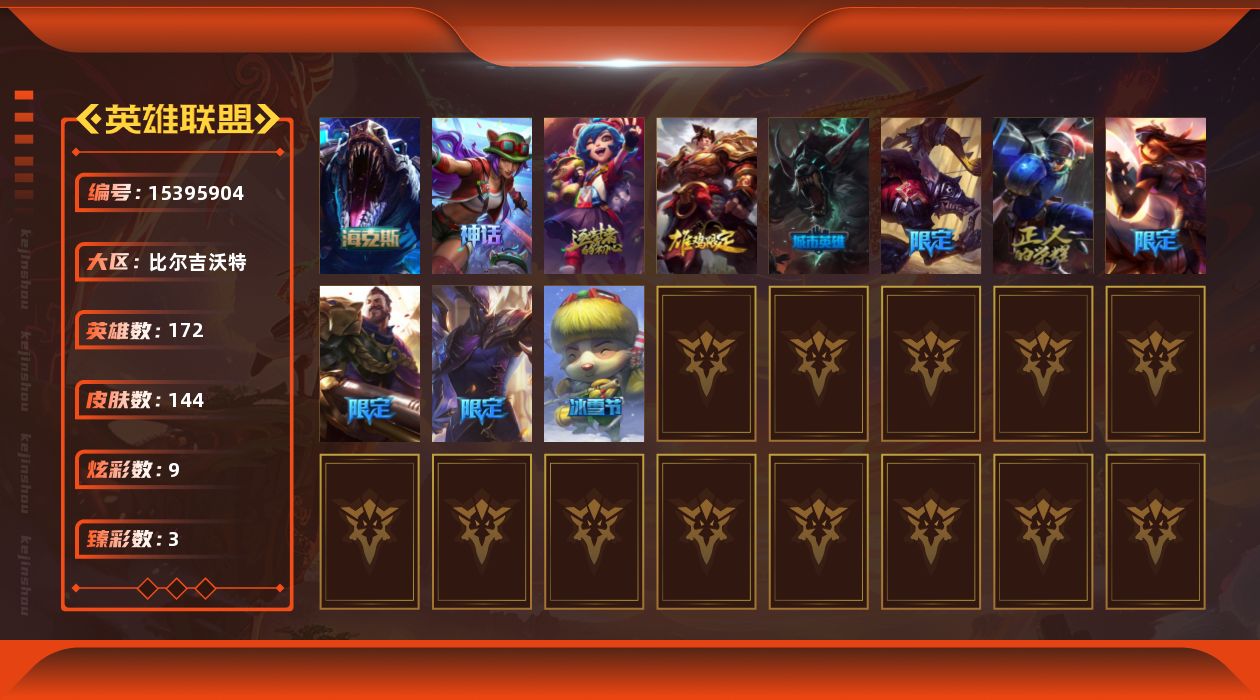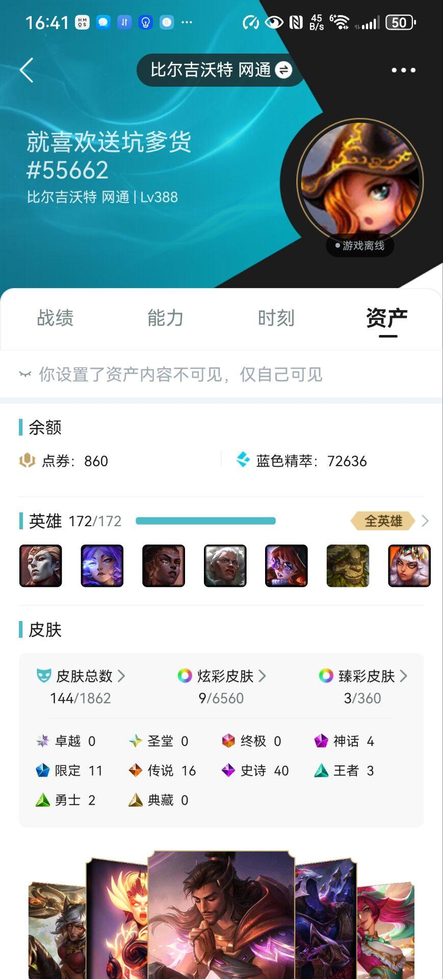 [15395904]有二次【特价出售/店主推荐】白银段位-172英雄-144皮肤-9炫彩-0终极-4神话-11限定-16传说-40史诗