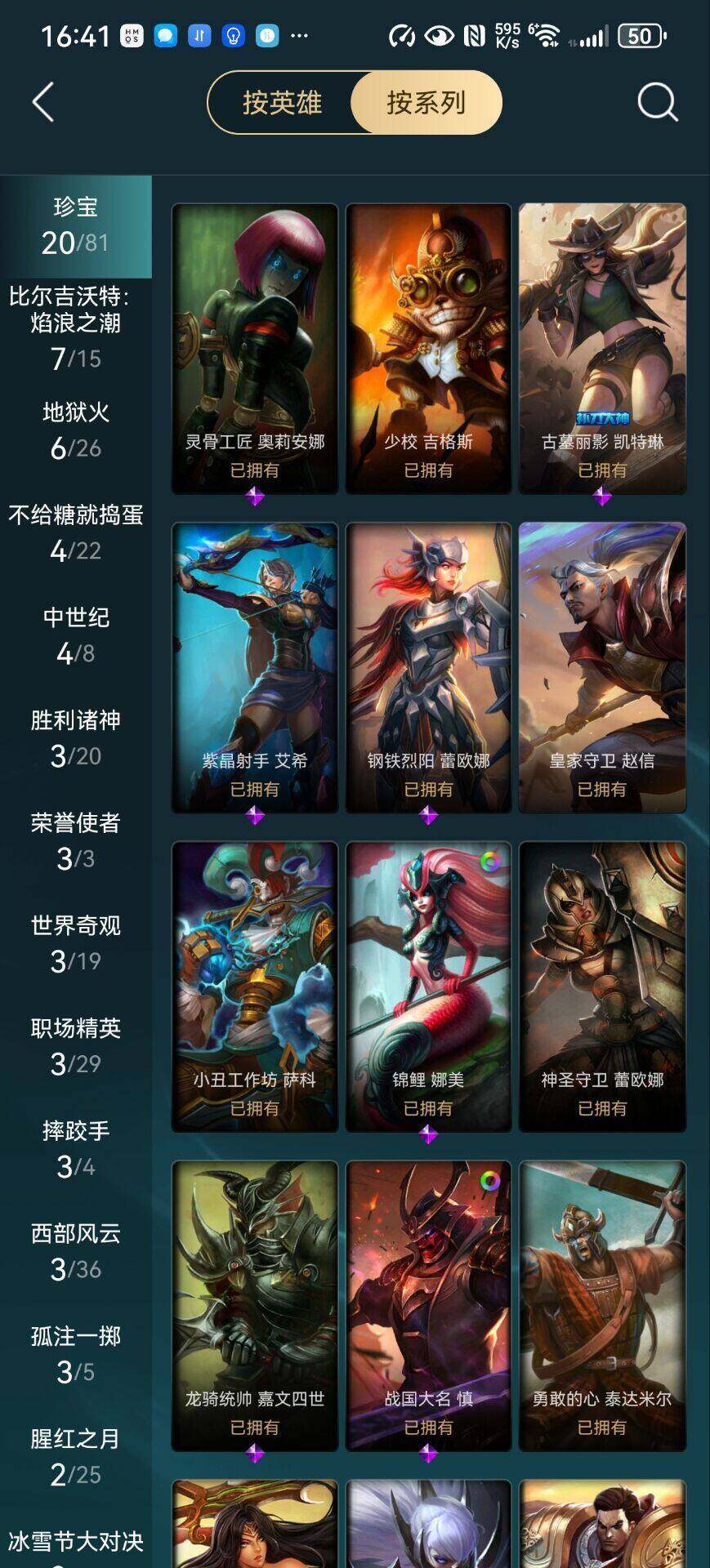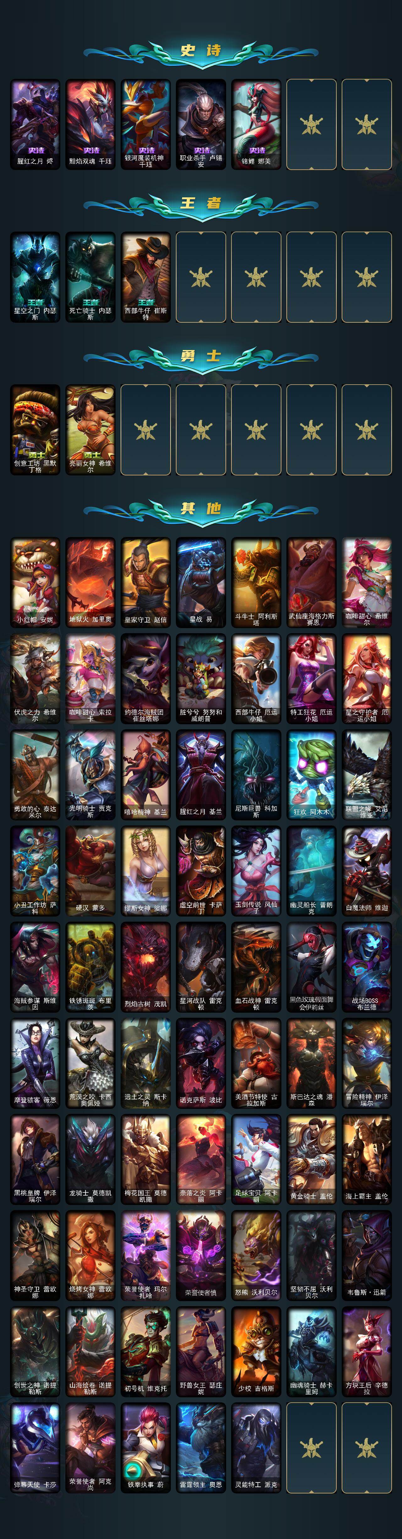 【史诗皮肤】:科学怪熊的新娘安妮,摄魂男爵弗拉基米尔,兔宝宝提莫,狼外婆沃里克,法国皇室厄运小姐,黑帮狂花厄运小姐,女船长厄运小姐,紫晶射手艾希,国王泰达米尔,死神卡尔萨斯,夜刃艾瑞莉娅,夜行义贼艾瑞莉娅,抵抗军天使凯特琳,古墓丽影凯特琳,无畏号墨菲特,海贼魅影卡特琳娜,前线指挥官卡特琳娜,龙骑统帅嘉文四世,灵骨工匠奥莉安娜,V字仇杀者布兰德,冰晶之核布兰德,屠龙勇士薇恩,法老王朝内瑟斯,铁甲雄心盖伦,钢铁烈阳蕾欧娜,源计划山蕾欧娜,战国大名慎,钢之逆鳞希瓦娜,虚空海灵菲兹,白色死神韦鲁斯,暗星韦鲁斯,夜鸦菲奥娜,奥术大师吉格斯,野火之藤婕拉,猛虎布隆,腥红之月烬,黯焰双魂千珏,银河魔装机神千珏,职业杀手卢锡安,锦鲤娜美