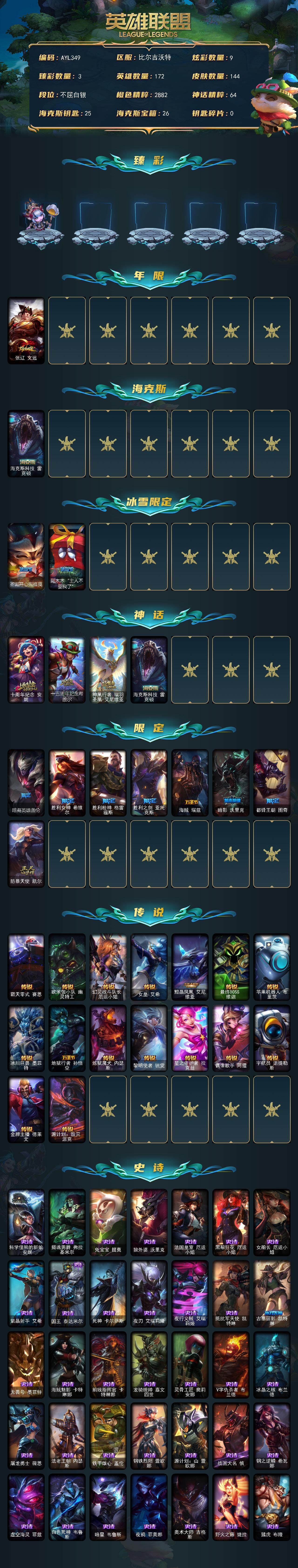 - [15337865]【店主推荐捡漏号!可直接换绑】未定级段位-172英雄-215皮肤-65炫彩-1终极-3神话-29限定-25传说-51史诗 【热门头像】:爱情之歌头像 【臻彩皮肤】:无畏骑士瑟庄妮赤子初心,冠军之刃锐雯2016凯旋圣装,玉剑传说无劫胭脂,可爱可爱粉红红布里茨,魔女阿卡丽虚荣,净雪之月莫甘娜冬虹,这货不是银狐库奇,水晶玫瑰迦娜甜蜜花蕾 【年限皮肤】:天龙之子斯莫德 【冰雪限定】:幸福女神乐芙兰,圣诞精灵崔丝塔娜,雪默丁格,雪装奈德丽,魄罗骑士瑟庄妮,北极星使者沃里克 【终极皮肤】:武装战姬厄运小姐 【神话皮肤】:十周年纪念安妮,源代码乐芙兰,灰烬骑士派克 【限定皮肤】:冠军掠夺者卡兹克,Fnatic迦娜,SKTT1阿兹尔,iG卡蜜尔,暗裔英雄盖伦,胜利女神奥莉安娜,胜利枪神卢锡安,胜利机器人布里茨,胜利女神瑟庄妮,胜利凤凰艾尼维亚,胜利之王泰达米尔,胜利巨口克格莫,胜利女神娑娜,胜利剑圣易,胜利之运崔斯特,胜利女神菲奥娜,鬼影森森茂凯,暗影沃里克,都铎王朝图奇,玉剑传说舞龙卫,防暴士兵辛吉德,防暴天使凯尔 【传说皮肤】:大天使长米迦勒凯尔,提莫约德尔人的一大步,合金巨兽努努和威朗普,女皇艾希,绅士科加斯,黯晶凤凰艾尼维亚,电玩女神娑娜,冰霜之刃艾瑞莉娅,女主播迦娜,最终BOSS维迦,上古战魂魔腾,地狱行者孙悟空,第三类接触黑默丁格,屠龙勇士潘森,源计划超体莫德凯撒,神王盖伦,焰尾妖狐阿狸,光明哨兵格雷福斯,宇航员诺提勒斯,泳池派对吉格斯,霸天异形卡兹克,灌篮高手德莱厄斯,神王德莱厄斯,星之守护者霞,灵魂莲华瑟提 【史诗皮肤】:科学怪熊的新娘安妮,皇家火枪手崔斯特,摄魂男爵弗拉基米尔,地狱火阿利斯塔,战争机器赛恩,钢铁之心希维尔,月光女神阿忒弥斯索拉卡,女船长厄运小姐,炼金狂士辛吉德,死神卡尔萨斯,小小骑士阿木木,贵族血统萨科,掠星魔刃卡萨丁,夜刃艾瑞莉娅,特种部队普朗克,恐惧新星普朗克,穿着正装的恶魔维迦,北领前线斯维因,抵抗军天使凯特琳,海贼魅影卡特琳娜,符文战神雷克顿,暗星嘉文四世,腥红之月伊莉丝,至高之拳李青,地下拳王李青,战地机甲斯卡纳,艳后奈德丽,军神战甲波比,飞车暴走族古拉加斯,死亡领主莫德凯撒,孤高游侠盖伦,帝王斑蝶克格莫,深海怪鱼克格莫,腥红之月鬼武者慎,战国大名慎,ODST地狱伞兵拉克丝,黑帮教父格雷福斯,虚空海灵菲兹,银河魔装机神菲兹,铁血猎人雷恩