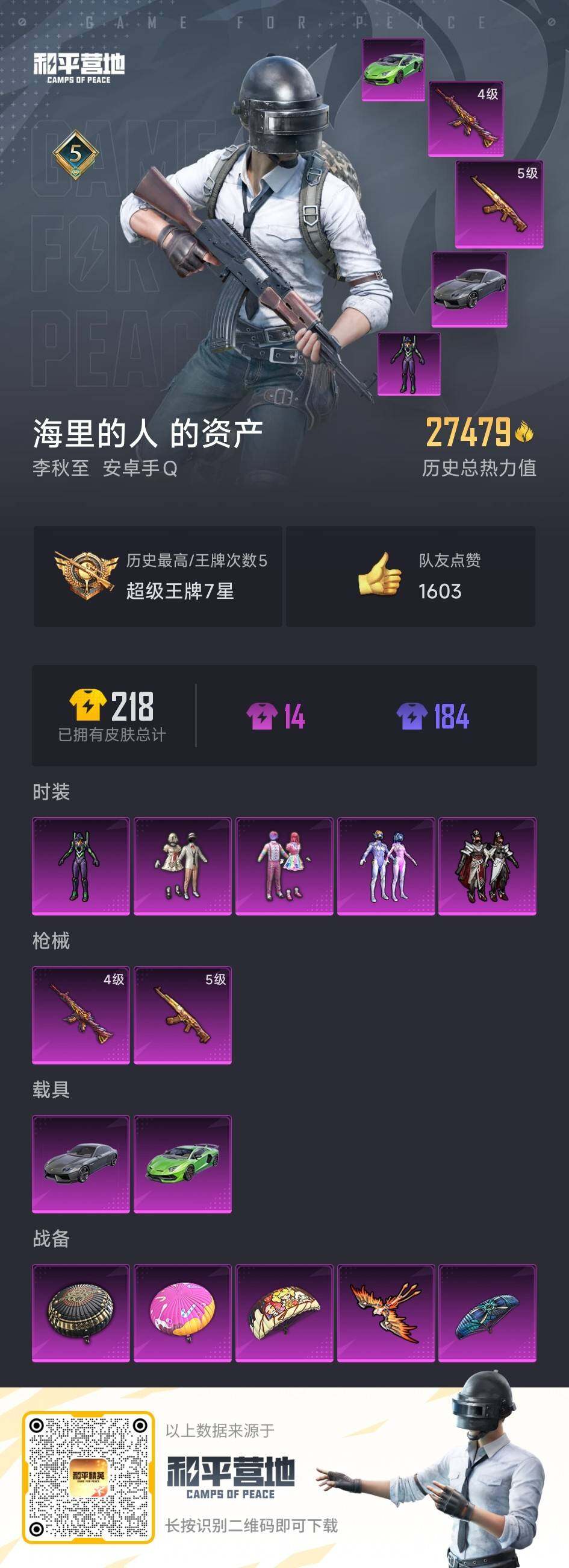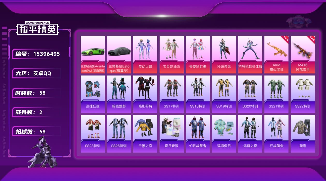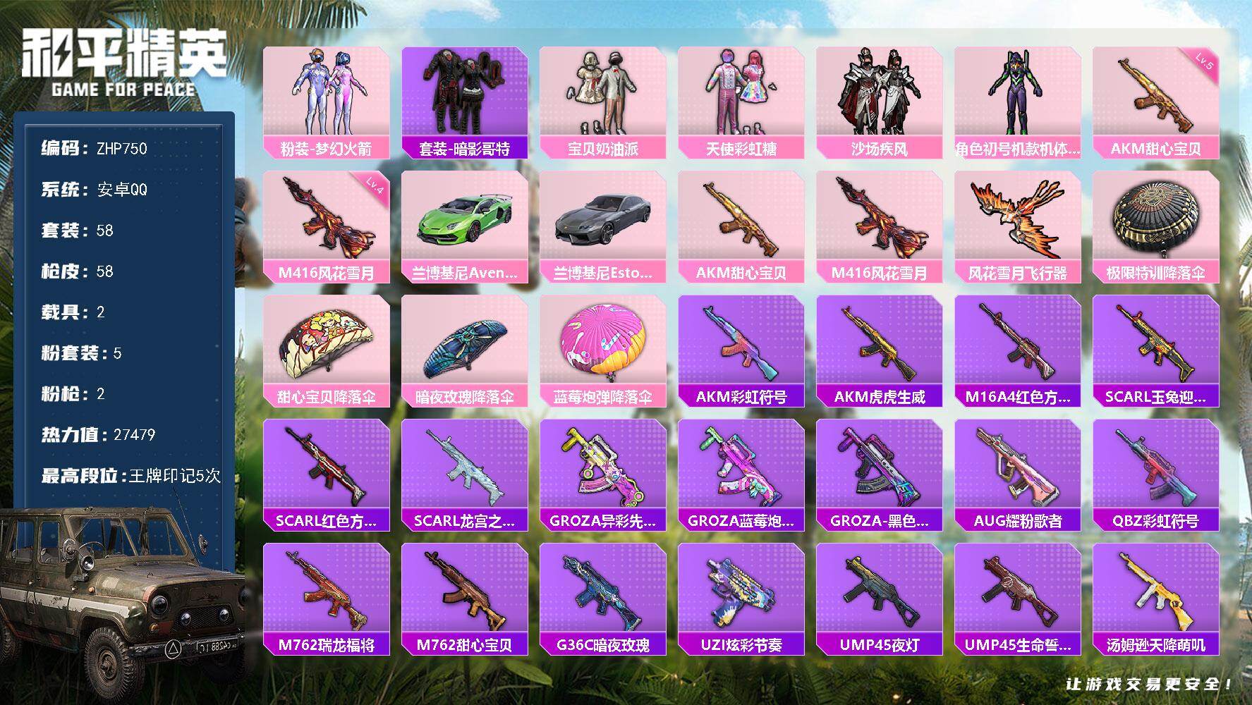 [15396495]安卓 手Q!港澳!5粉装-2特效枪-2载具-1粉色飞行器-27479热力值-5王牌印记-58套装-58枪皮