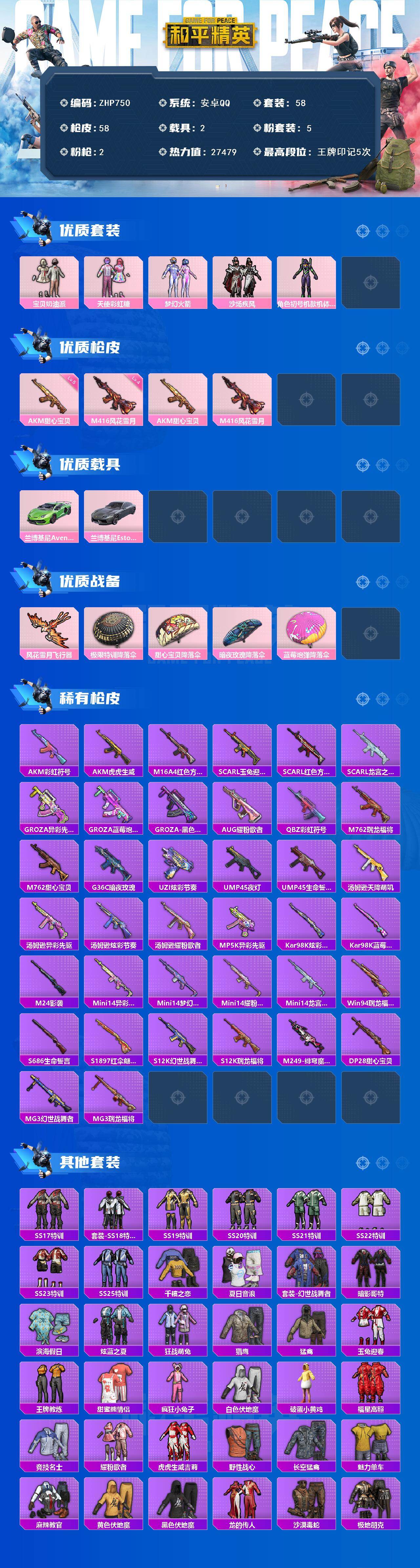 [15396495]安卓 手Q!港澳!5粉装-2特效枪-2载具-1粉色飞行器-27479热力值-5王牌印记-58套装-58枪皮 【热门品类】:粉装-梦幻火箭,套装-暗影哥特 【粉色套装】:粉装-宝贝奶油派,粉装-天使彩虹糖,粉装-梦幻火箭,粉装-沙场疾风,角色-初号机款机体服 【粉色枪皮等级】:AKM-甜心宝贝(五级),M416-风花雪月(四级) 【粉色载具】:兰博基尼Aventador SVJ(翡翠绿),兰博基尼Estoque(银翼灰) 【粉色枪皮】:AKM-甜心宝贝,M416-风花雪月 【粉色飞行器】:风花雪月飞行器 【粉色降落伞】:极限特训降落伞,甜心宝贝降落伞,暗夜玫瑰降落伞,蓝莓炮弹降落伞 【稀有枪皮】:AKM-彩虹符号,AKM-虎虎生威,M16A4-红色方程式,SCAR-L-玉兔迎春,SCAR-L-红色方程式,SCAR-L-龙宫之主,GROZA-异彩先驱,GROZA-蓝莓炮弹,GROZA-黑色刀锋,AUG-耀粉歌者,QBZ-彩虹符号,M762-瑞龙福将,M762-甜心宝贝,G36C-暗夜玫瑰,UZI-炫彩节奏,UMP45-夜灯,UMP45-生命誓言,汤姆逊-天降萌叽,汤姆逊-异彩先驱,汤姆逊-炫彩节奏,汤姆逊-耀粉歌者,MP5K-异彩先驱,Kar98K-炫彩节奏,Kar98K-蓝莓炮弹,M24-影袭,Mini14-异彩先驱,Mini14-梦幻火箭,Mini14-耀粉歌者,Mini14-龙宫之主,Win94-瑞龙福将,S686-生命誓言,S1897-红伞翩翩,S12K-瑞龙福将,S12K-幻世战舞者,M249-绯穹魔姬,DP-28-甜心宝贝,MG3-幻世战舞者,MG3-瑞龙福将 【其他套装】:套装-SS17特训,套装-SS18特训,套装-SS19特训,套装-SS20特训,套装-SS21特训,套装-SS22特训,套装-SS23特训,套装-SS25特训,套装-千禧之恋,套装-夏日音浪,套装-幻世战舞者,套装-暗影哥特,套装-滨海假日,套装-炫蓝之夏,套装-狂战萌兔,套装-猎鹰,套装-猛禽,套装-玉兔迎春,套装-王牌教练,套装-甜蜜熊情侣,套装-疯狂小兔子,套装-白色伏地魔,套装-破蛋小黄鸡,套装-福星高照,套装-竞技名士,套装-耀粉歌者,套装-虎虎生威吉莉,套装-野性战心,套装-长空猛禽,套装-魅力单车,套装-麻辣教官,套装-黄色伏地魔,套装-黑色伏地魔,套装-龙的传人,套装-