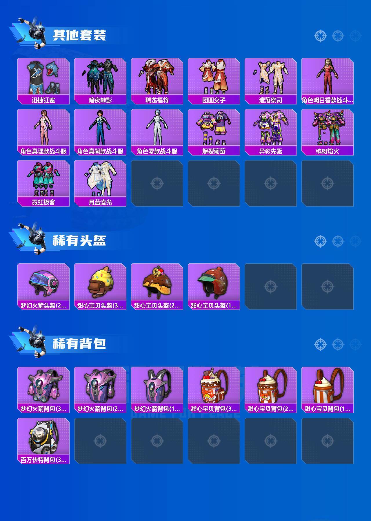 【其他套装】:套装-SS17特训,套装-SS18特训,套装-SS19特训,套装-SS20特训,套装-SS21特训,套装-SS22特训,套装-SS23特训,套装-SS25特训,套装-千禧之恋,套装-夏日音浪,套装-幻世战舞者,套装-暗影哥特,套装-滨海假日,套装-炫蓝之夏,套装-狂战萌兔,套装-猎鹰,套装-猛禽,套装-玉兔迎春,套装-王牌教练,套装-甜蜜熊情侣,套装-疯狂小兔子,套装-白色伏地魔,套装-破蛋小黄鸡,套装-福星高照,套装-竞技名士,套装-耀粉歌者,套装-虎虎生威吉莉,套装-野性战心,套装-长空猛禽,套装-魅力单车,套装-麻辣教官,套装-黄色伏地魔,套装-黑色伏地魔,套装-龙的传人,套装-