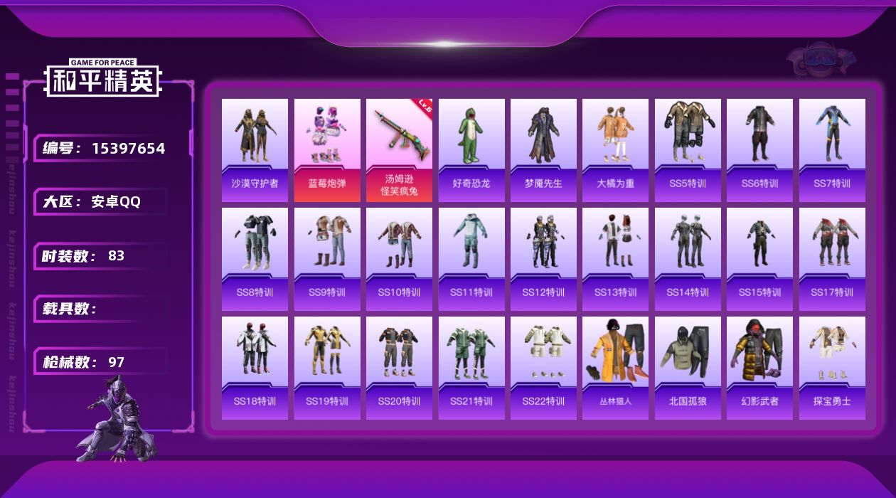 [15397654]【特价出售/店主推荐】安卓 手Q-1粉装-1特效枪-0载具-0粉色飞行器-29280热力值-1王牌印记-83套装-97枪皮【热门品类】:套装-沙漠守护者【粉色套装】:粉装-蓝莓炮弹【粉色枪皮等级】:汤姆逊-怪笑疯兔(六级)【粉色枪皮】:汤姆逊-怪笑疯兔