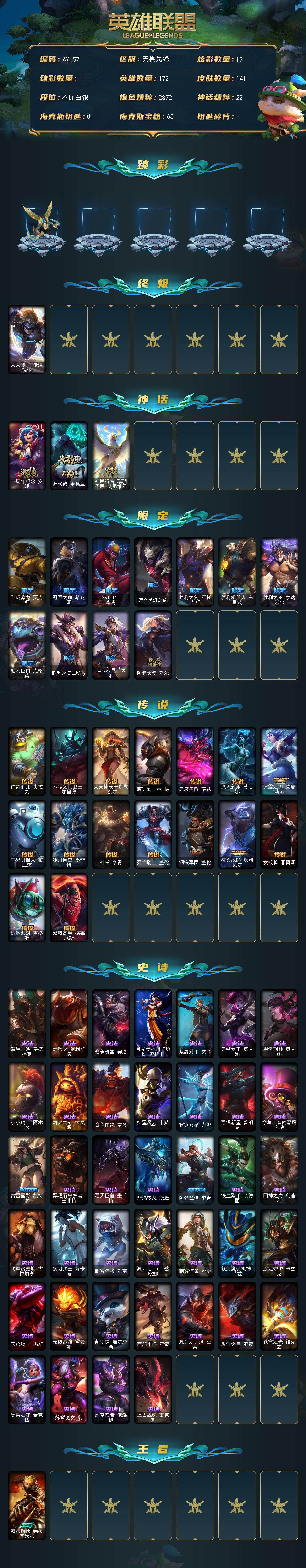 [15397880]店主推荐捡漏号!可直接换绑】白银段位-172英雄-141皮肤-19炫彩-1终极-3神话-11限定-16传说-39史诗 【臻彩皮肤】:冠军掠夺者卡兹克凯旋圣装 【终极皮肤】:未来战士伊泽瑞尔 【神话皮肤】:十周年纪念安妮,源代码乐芙兰,神凰行者瑞羽圣凰艾尼维亚 【限定皮肤】:卧虎藏龙贾克斯,冠军之血希瓦娜,SKTT1李青,暗裔英雄盖伦,胜利之剑亚托克斯,胜利机器人布里茨,胜利之王泰达米尔,胜利巨口克格莫,胜利之运崔斯特,胜利女神菲奥娜,防暴天使凯尔 【传说皮肤】:铁哥们儿奥拉夫,地狱之门卫士加里奥,大天使长米迦勒凯尔,源计划林易,恶魔男爵瑞兹,鬼魂新娘莫甘娜,冰霜之刃艾瑞莉娅,苹果机器人布里茨,冰川巨兽墨菲特,神拳李青,死亡骑士盖伦,钢铁军团盖伦,符文战熊沃利贝尔,女校长菲奥娜,泳池派对吉格斯,灌篮高手德莱厄斯 【史诗皮肤】:重生之沙费德提克,地狱火阿利斯塔,战争机器赛恩,月光女神阿忒弥斯索拉卡,紫晶射手艾希,刀锋女王莫甘娜,黑色荆棘莫甘娜,小小骑士阿木木,熔火之心拉莫斯,战争血统蒙多,掠星魔刃卡萨丁,寒冰女皇迦娜,恐惧新星普朗克,穿着正装的恶魔维迦,古墓丽影凯特琳,黑曜石守护者墨菲特,霸天巨兽墨菲特,蓝焰梦魔魔腾,防弹武僧李青,铁血猎手奈德丽,四神之力乌迪尔,飞车暴走族古拉加斯,实习护士阿卡丽,刺客信条凯南,源计划山蕾欧娜,刺客信条锐雯,银河魔装机神菲兹,沙之守护卡兹克,天启骑士杰斯,无限烈焰黛安娜,萌侦探喵尔摩斯,西部牛仔亚索,源计划风亚索,腥红之月亚索,苍穹之光维克兹,黑帮狂花金克丝,炼狱魔女蔚,虚空使者俄洛伊,上古战魂雷克塞 【王者皮肤】:霹雳游侠弗拉基米尔 【勇士皮肤】:亮丽女神希维尔 【典藏皮肤】:法老阿木木 【其他皮肤1】:黑潮弗拉基米尔,星战易,玉剑传说无极,哞利斯塔,武仙座海格力斯赛恩,腥红之月希维尔,咖啡甜心希维尔,蕉泥座人索拉卡,灵魂莲华提莫,游击队员崔丝塔娜,约德尔海贼团崔丝塔娜,勇敢的心泰达米尔,嘻哈精神基兰,腥红之月基兰,科学狂人辛吉德,横行霸道图奇,暴龙科加斯,忍龟拉莫斯,健美教练蒙多,嗜血行刑蒙多,急速前进库奇,冰壶选手维迦,绿野仙踪维迦,宇航员维迦,垃圾场特朗德尔,海贼参谋斯维因,荒野治安官凯特琳,铁锈斑斑布里茨,戴一个表布里茨,战场BOSS布里茨,银白枪骑布里茨,赏金猎人卡特琳娜,幻影梦魔魔腾,烈焰古树茂凯,血石战神雷克顿,吕布奉