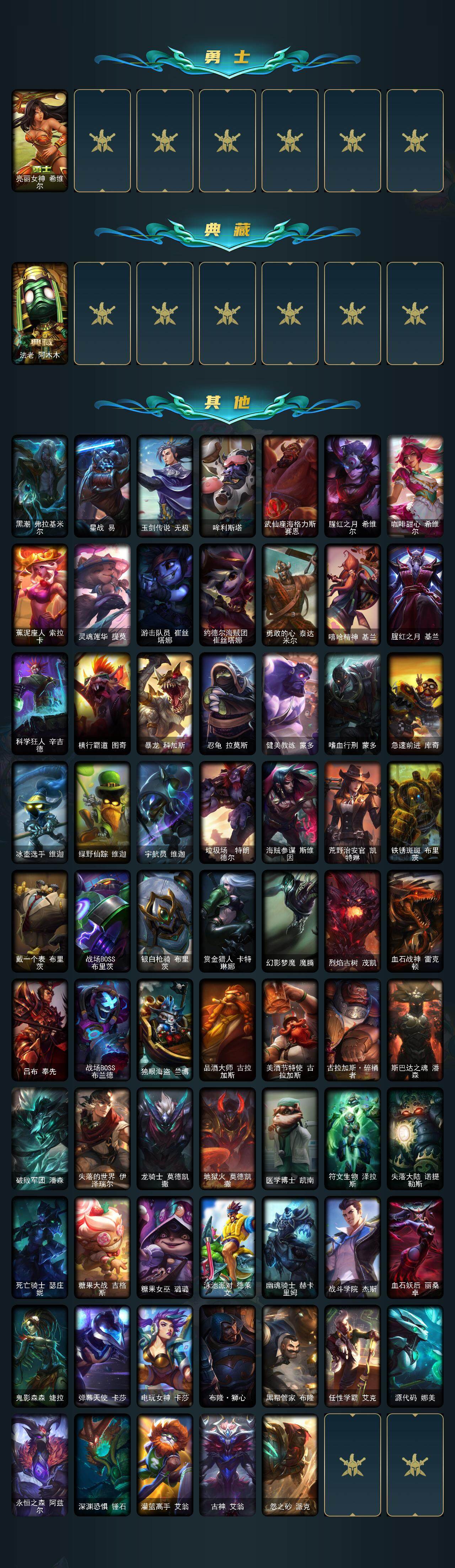 【其他皮肤1】:黑潮弗拉基米尔,星战易,玉剑传说无极,哞利斯塔,武仙座海格力斯赛恩,腥红之月希维尔,咖啡甜心希维尔,蕉泥座人索拉卡,灵魂莲华提莫,游击队员崔丝塔娜,约德尔海贼团崔丝塔娜,勇敢的心泰达米尔,嘻哈精神基兰,腥红之月基兰,科学狂人辛吉德,横行霸道图奇,暴龙科加斯,忍龟拉莫斯,健美教练蒙多,嗜血行刑蒙多,急速前进库奇,冰壶选手维迦,绿野仙踪维迦,宇航员维迦,垃圾场特朗德尔,海贼参谋斯维因,荒野治安官凯特琳,铁锈斑斑布里茨,戴一个表布里茨,战场BOSS布里茨,银白枪骑布里茨,赏金猎人卡特琳娜,幻影梦魔魔腾,烈焰古树茂凯,血石战神雷克顿,吕布奉