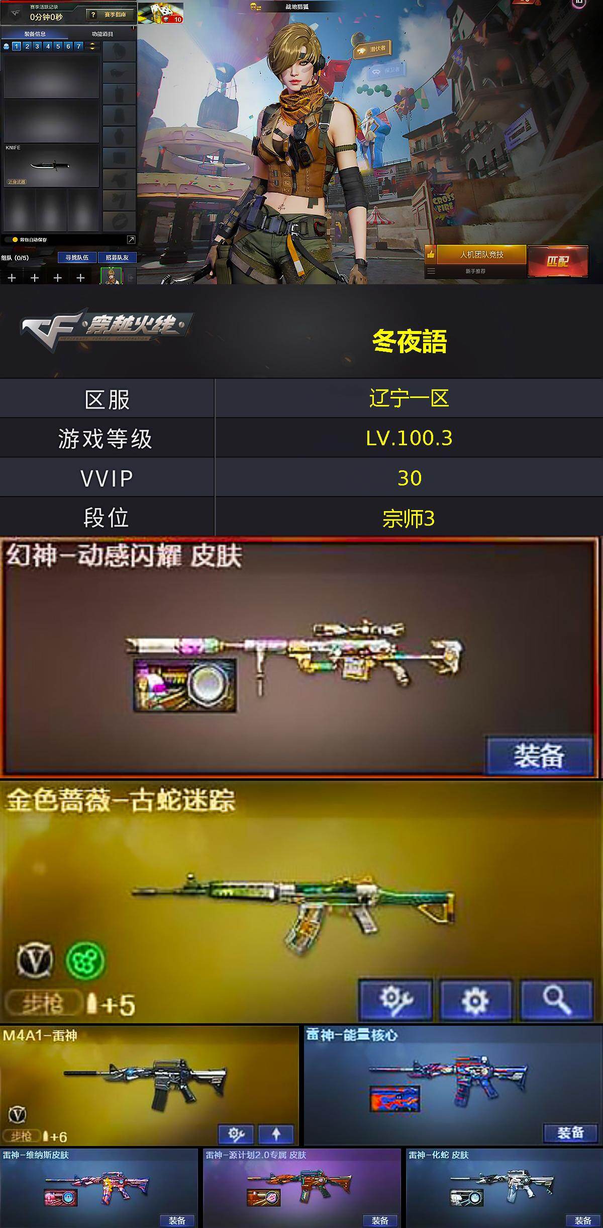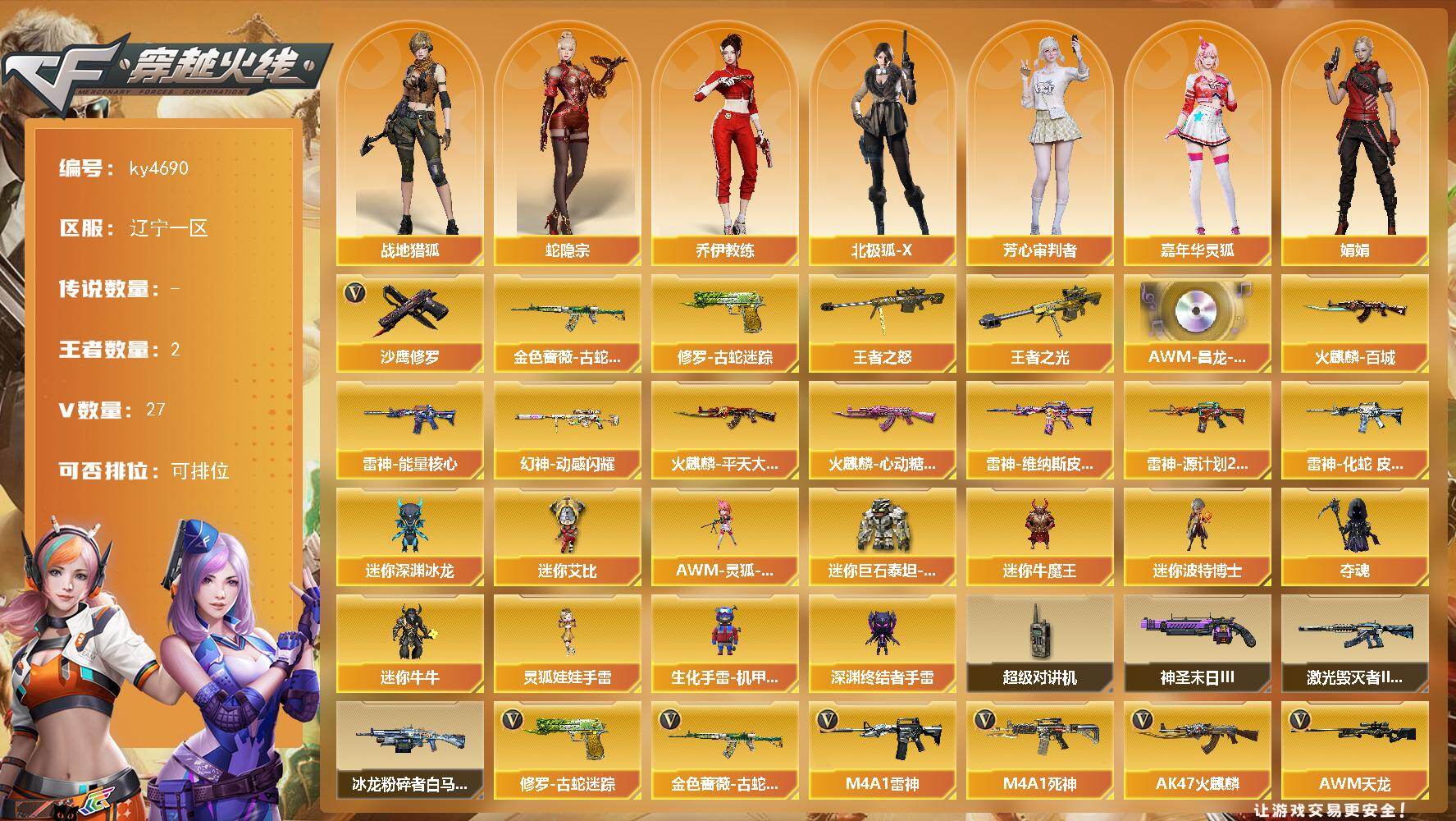 [15398410]辽宁一区-27V-2王者-0炫金 【热门武器】:金色蔷薇-古蛇迷踪,修罗-古蛇迷踪,沙鹰-修罗 【王者炫金武器】:王者之光,王者之怒 【音效卡】:AWM-昌龙-怀旧音效卡 【皮肤】:幻神-动感闪耀 皮肤,雷神-能量核心,雷神-维纳斯皮肤,雷神-源计划2.0专属 皮肤,雷神-化蛇 皮肤,火麒麟-平天大圣,火麒麟-百城,火麒麟-心动糖果 【角色】:战地猎狐,蛇隐宗,乔伊教练,北极狐-X,芳心审判者,嘉年华灵狐,娟娟,灵狐-花神,灵狐者-X,灵狐者-黄金海岸,麻雀,曼陀罗-X,潜龙队-X,蛇姬,斯沃特-X,兔囡囡,维纳斯,新娜塔莎,雪莉杨,雪莉杨-摸金校尉,樱-战斗天使,智影 【人偶武器】:AWM-灵狐-15周年嘉年华,迷你深渊冰龙,迷你牛魔王,迷你波特博士,夺魂,迷你牛牛,生化手雷-机甲核心,深渊终结者手雷,迷你艾比,迷你巨石泰坦-魔花研究所,灵狐娃娃手雷 【暴走生化】:超级对讲机 【挑战大师】:冰龙粉碎者-白马银枪,激光毁灭者III-白马银枪,神圣爆裂者-末日III 【英雄级武器】:AK47-火麒麟,M4A1-雷神,M4A1-死神,AK47-黑鲨,无影-神兵利器,黑武士-锦绣游龙,金色蔷薇-古蛇迷踪,烈火-动感闪耀,黑骑士-海王,AWM-天龙,Barrett-毁灭,沙鹰-修罗,天神-动感闪耀,修罗-古蛇迷踪,龙啸*2,擎天-竞技荣光,唐刀-神工天巧,屠龙-动感闪耀,高爆手雷-竞技荣光,高爆手雷-神工天巧,手雷-动感闪耀,高爆手雷-古蛇迷踪,闪光弹-竞技荣光,闪光弹-神工天巧,烟雾弹-竞技荣光,烟雾弹-神工天巧,烟雾弹-古蛇迷踪,M4A1-赤狱骑士,AWM-昌龙 【道具】:亚洲杯纪念炫彩背包,全能枪王背包,古蛇迷踪炫彩背包,战舰背包,背包-洛丽塔,超级背包,黑桃战神背包,哔哩哔哩名片,救世主-黑桃战神,黄金生化钩,绿色巨人,灵魂忍者,变异宝贝,迷雾幽灵,生化弹匣,夺命之镰,防化服*3,金色流光-枪王排位,流光-再燃火线,枪王排位29赛季金色流光,古蛇迷踪打击特效,蛇隐宗表情,动感闪耀表情,C4-再燃火线,防弹头盔*2,防弹衣*2,C4工具钳*2,手雷包*2 【特殊枪械】: