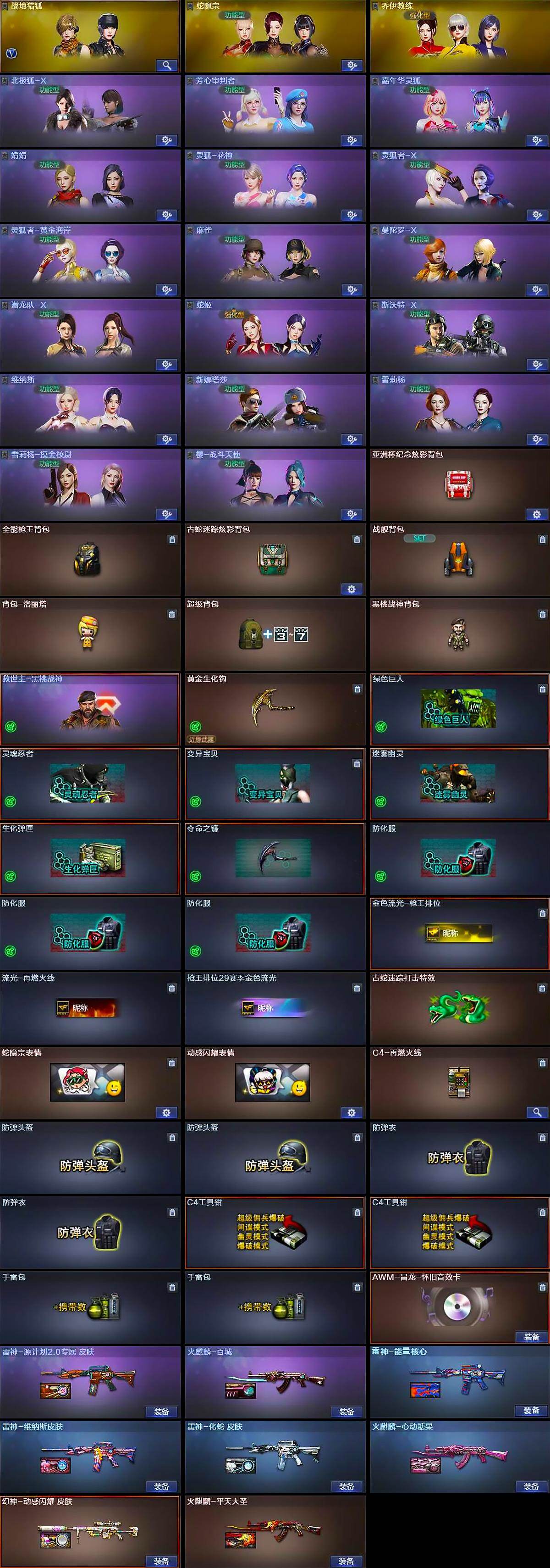【道具】:亚洲杯纪念炫彩背包,全能枪王背包,古蛇迷踪炫彩背包,战舰背包,背包-洛丽塔,超级背包,黑桃战神背包,哔哩哔哩名片,救世主-黑桃战神,黄金生化钩,绿色巨人,灵魂忍者,变异宝贝,迷雾幽灵,生化弹匣,夺命之镰,防化服*3,金色流光-枪王排位,流光-再燃火线,枪王排位29赛季金色流光,古蛇迷踪打击特效,蛇隐宗表情,动感闪耀表情,C4-再燃火线,防弹头盔*2,防弹衣*2,C4工具钳*2,手雷包*2