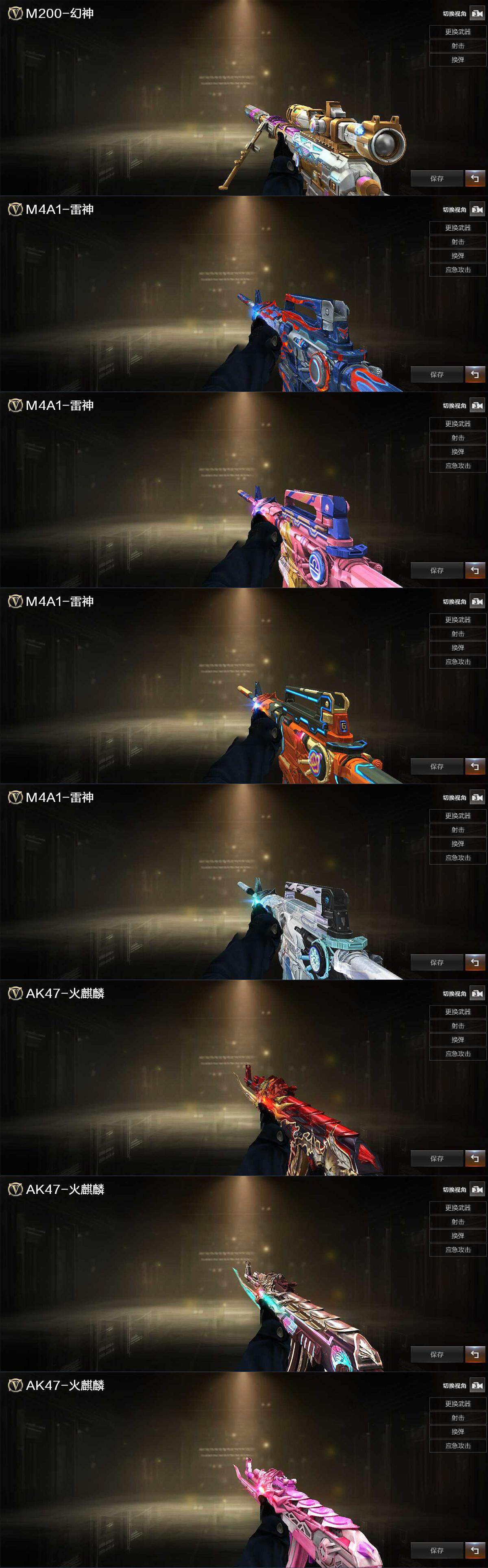 【英雄级武器】:AK47-火麒麟,M4A1-雷神,M4A1-死神,AK47-黑鲨,无影-神兵利器,黑武士-锦绣游龙,金色蔷薇-古蛇迷踪,烈火-动感闪耀,黑骑士-海王,AWM-天龙,Barrett-毁灭,沙鹰-修罗,天神-动感闪耀,修罗-古蛇迷踪,龙啸*2,擎天-竞技荣光,唐刀-神工天巧,屠龙-动感闪耀,高爆手雷-竞技荣光,高爆手雷-神工天巧,手雷-动感闪耀,高爆手雷-古蛇迷踪,闪光弹-竞技荣光,闪光弹-神工天巧,烟雾弹-竞技荣光,烟雾弹-神工天巧,烟雾弹-古蛇迷踪,M4A1-赤狱骑士,AWM-昌龙