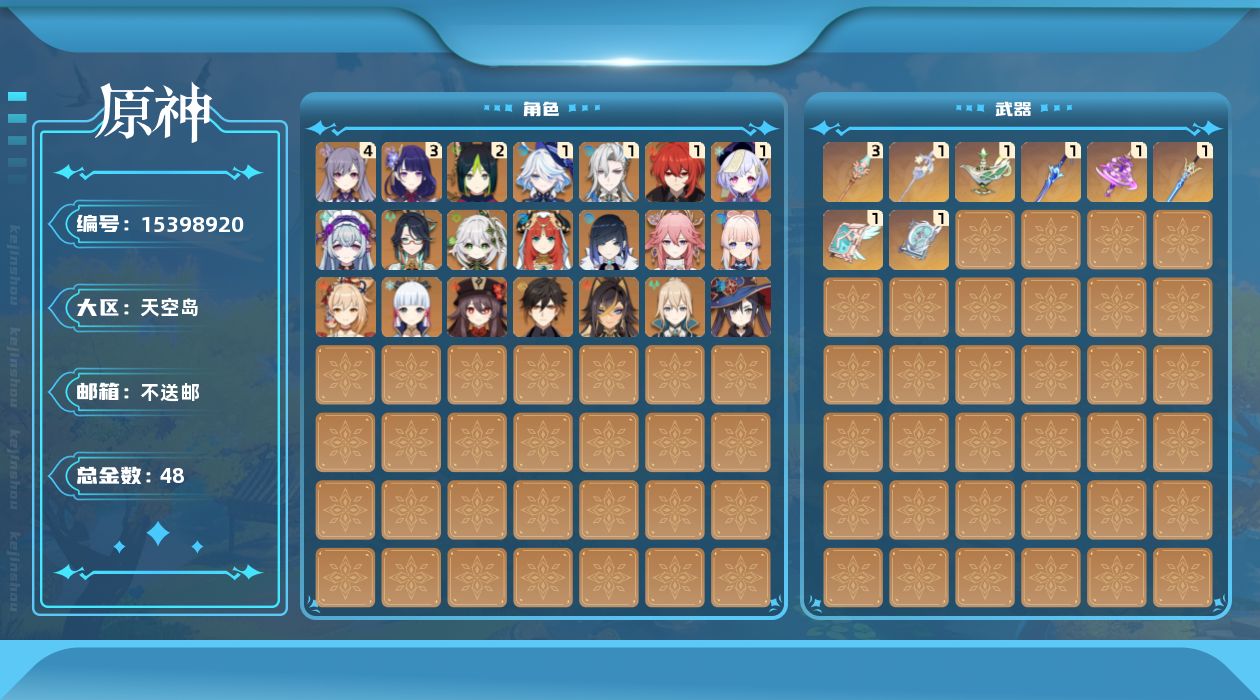 0命闲云,1命芙宁娜,1命那维莱特,0命迪希雅,0命纳西妲,0命妮露,2命提纳里,0命夜兰,0命八重神子,3命雷电将军,0命神里绫华,0命钟离,0命胡桃,0命宵宫,0命珊瑚宫心海,4命刻晴,1命七七,0命琴,0命莫娜,1命迪卢克,0命梦见月瑞希,0命菲林斯,精1千夜浮梦,精1波乱月白经津,精1神乐之真意,精1苍古自由之誓,精1四风原典,精3天空之脊,精1天空之卷,精1柔灯挽歌,精1血染荒城