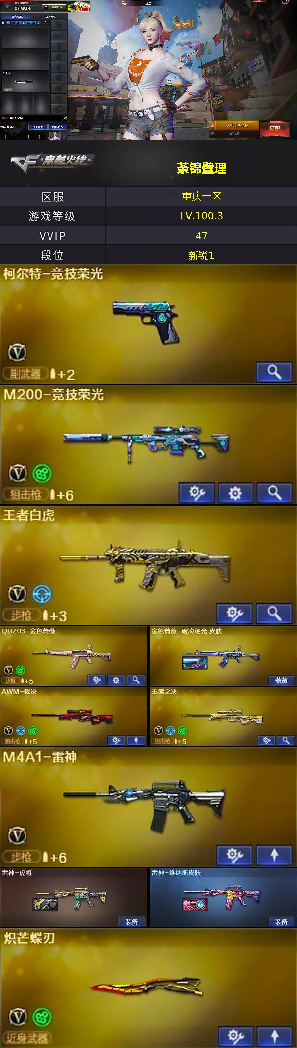 [15399509]重庆一区-47V-3王者-0炫金 【热门武器】:QBZ03-金色蔷薇,M200-竞技荣光,M4A1-黑骑士*3,沙鹰-修罗*2,炽芒蝶刃,炽芒蝶刃-破浪逐光 皮肤 【王者炫金武器】:王者之城 【音效卡】:M4A1-黑骑士音效卡 【皮肤】:金色蔷薇-破浪逐光 皮肤,雷神-虎将,雷神-维纳斯皮肤,火麒麟-心动糖果,毁灭-风暴,黑骑士-暗月,AK47-B-常胜将军-孙权,修罗耀金皮肤,炽芒蝶刃-破浪逐光 皮肤 【角色】:迷迭香,电竞教官-云悠悠,修道士,暗夜-X,电竞少女,芳心审判者,风暴女,嘉年华灵狐,娟娟,0号玩家,灵狐者-X,龙儿,麻雀,潘多拉-X,斯沃特-X,蜀雪,兔囡囡,雪莉杨,雪莉杨-摸金校尉,夜玫瑰-宠粉 【人偶武器】:AWM-灵狐-15周年嘉年华,迷你波特博士,迷你曼提柯尔,夺魂,迷你火种,生化手雷-机甲核心*2,深渊终结者手雷,闪光弹-貂蝉,高爆手雷-大乔 【暴走生化】:超级对讲机 【挑战大师】:神圣爆裂者III,激光毁灭者III-白马银枪,机甲撕裂者III,试炼破坏者III,KAC-圣炎切割者III*2,神圣爆裂者-末日III,惩戒者III 【英雄级武器】:AK47-火麒麟*2,M4A1-雷神,M4A1-黑骑士*3,AK12-天启,无影-神兵利器,QBZ03-金色蔷薇,黑骑士-海王*2,AK47-B-常胜将军,王者白虎-觉醒版,Barrett-毁灭,AWM-裁决,M200-竞技荣光,王者之决-觉醒版,沙鹰-修罗*2,柯尔特-竞技荣光,屠龙,擎天,擎天-竞技荣光*2,炽芒蝶刃,高爆手雷-竞技荣光*7,闪光弹-竞技荣光*7,烟雾弹-竞技荣光*4 【道具】:CFS限定背包,亚洲杯纪念炫彩背包,次元之矛-黄金背包,老虎背包,超级背包,黄金巨石泰坦-魔花研究所背包,黄金曼提柯尔的背包,救世主-黑桃战神,绿色巨人,灵魂忍者,迷雾幽灵,生化弹匣,夺命之镰,防化服*2,金色流光-枪王排位*2,星辰流光-枪王排位,枪王排位28赛季金色流光,枪王排位29赛季金色流光,EP战队名片,EP战队喷图,EP战队击杀图标,防弹头盔*6,防弹衣*7,C4工具钳*6,手雷包*6 【特殊枪械】:3黑骑士