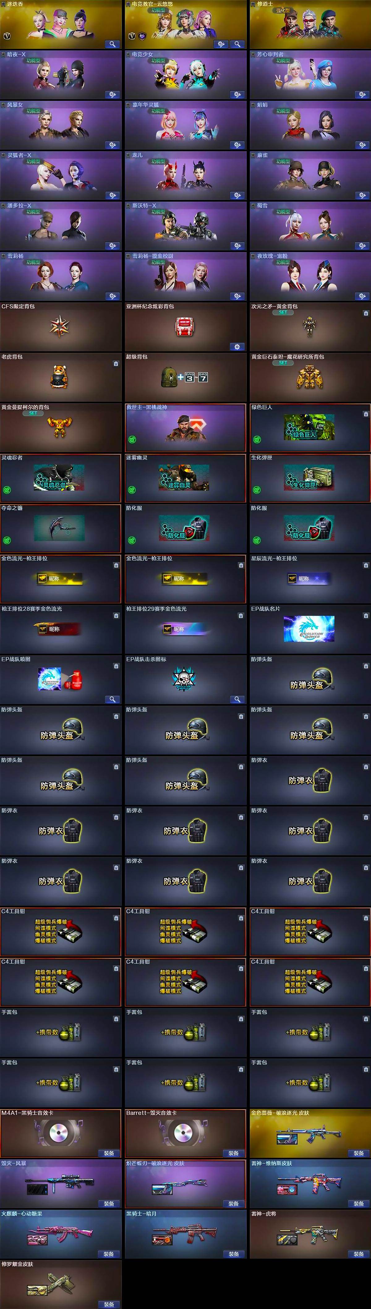 【道具】:CFS限定背包,亚洲杯纪念炫彩背包,次元之矛-黄金背包,老虎背包,超级背包,黄金巨石泰坦-魔花研究所背包,黄金曼提柯尔的背包,救世主-黑桃战神,绿色巨人,灵魂忍者,迷雾幽灵,生化弹匣,夺命之镰,防化服*2,金色流光-枪王排位*2,星辰流光-枪王排位,枪王排位28赛季金色流光,枪王排位29赛季金色流光,EP战队名片,EP战队喷图,EP战队击杀图标,防弹头盔*6,防弹衣*7,C4工具钳*6,手雷包*6