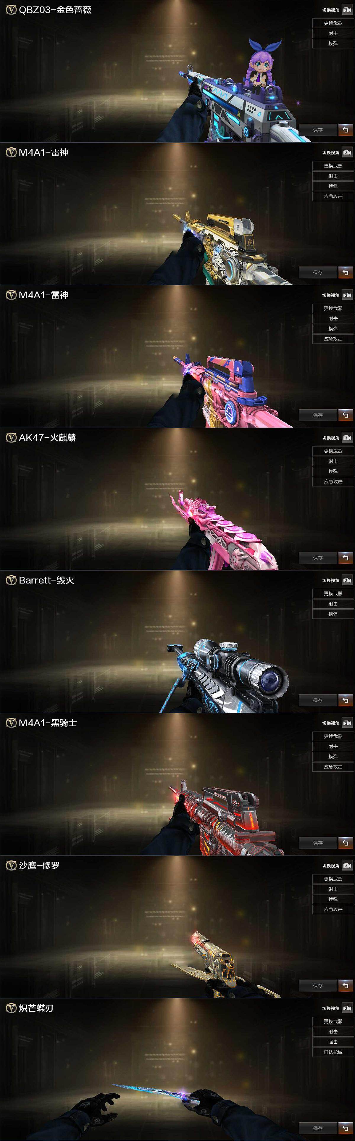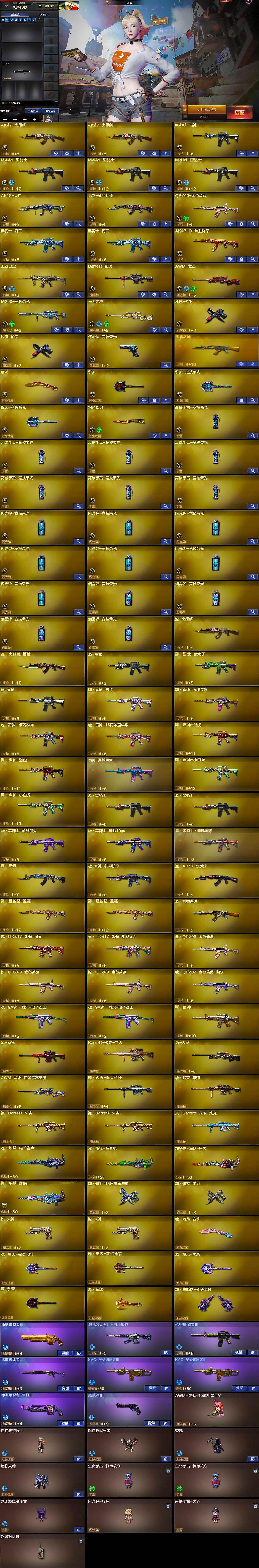 【热门武器】:QBZ03-金色蔷薇,M200-竞技荣光,M4A1-黑骑士*3,沙鹰-修罗*2,炽芒蝶刃,炽芒蝶刃-破浪逐光 皮肤