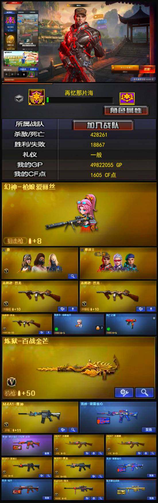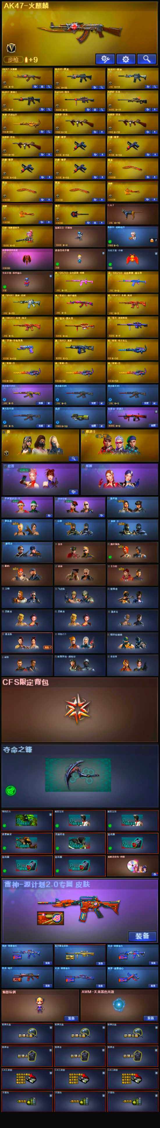 【英雄级武器】:AK47-火麒麟*2,M4A1-黑龙,M4A1-雷神,M4A1-黑骑士,AWM-天龙,Barrett-毁灭,炼狱-百战金芒,汤姆逊-烈龙*3,沙鹰-修罗*4,屠龙*3,龙啸*2,擎天,麒麟刺-百战金芒