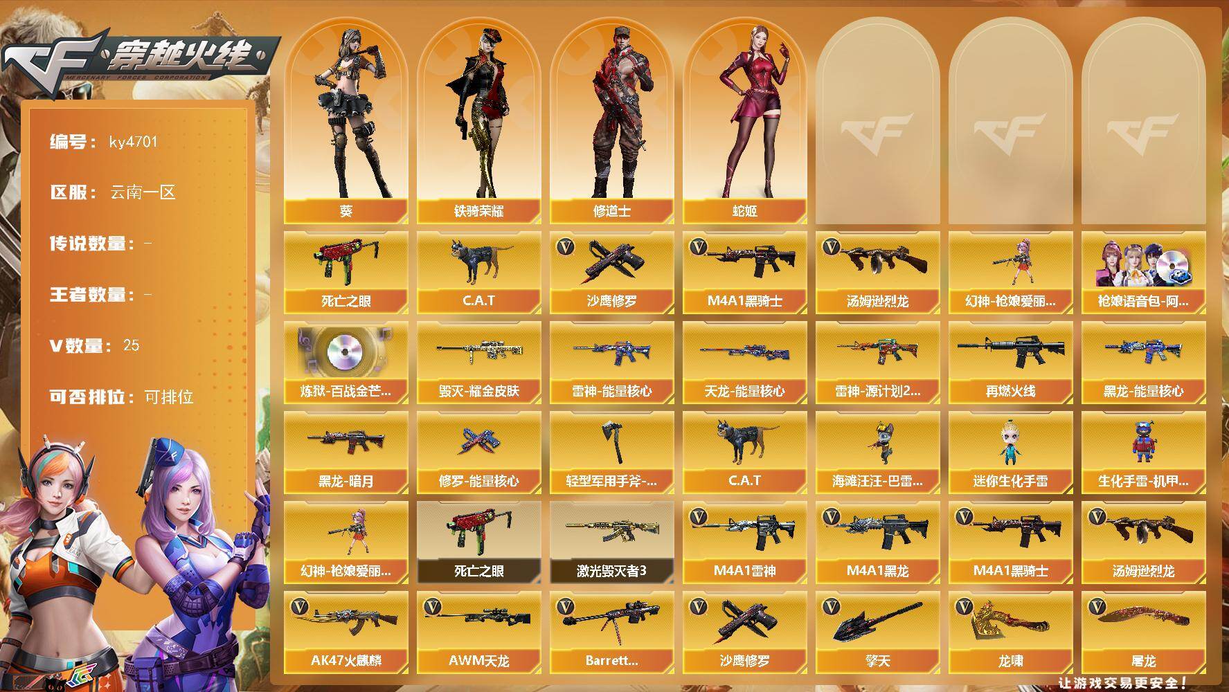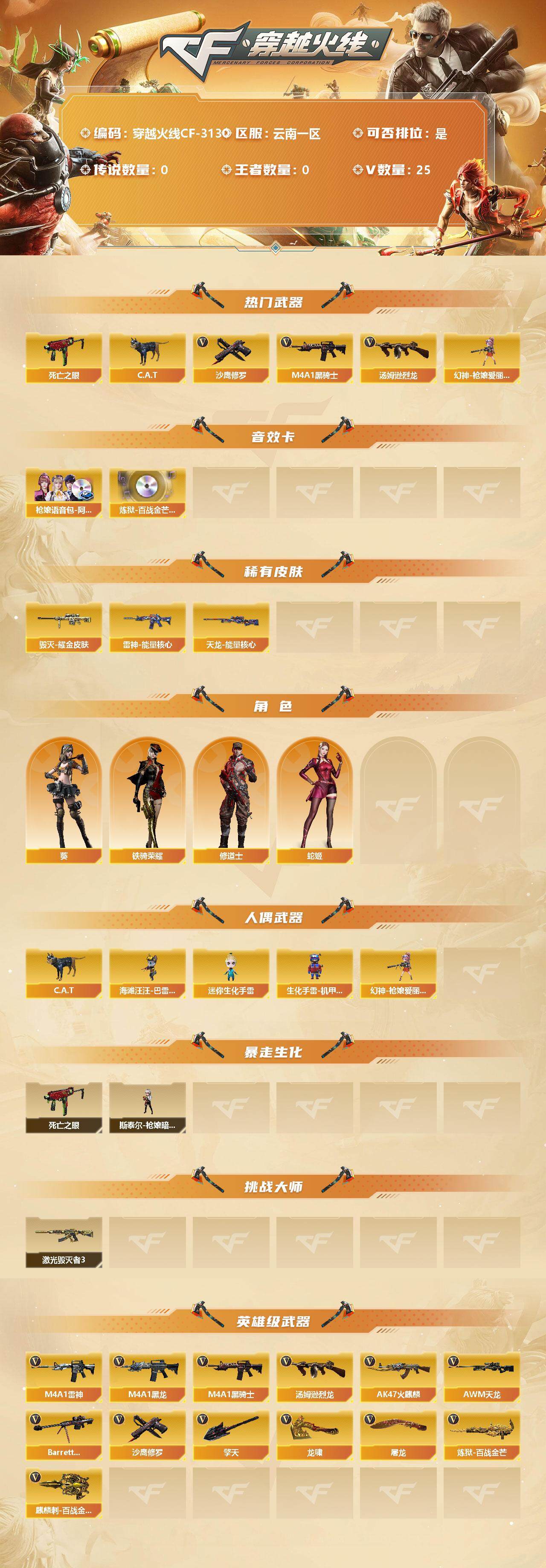 [15399915]云南一区-25V-0王者-0炫金 【热门武器】:死亡之眼,C.A.T,M4A1-黑骑士,汤姆逊-烈龙*3,幻神-枪娘爱丽丝,沙鹰-修罗*4 【音效卡】:枪娘语音包-阿敏,炼狱-百战金芒-庆典舞曲音效卡 【皮肤】:雷神-能量核心,雷神-源计划2.0专属 皮肤,M4A1-再燃火线,毁灭耀金皮肤,黑龙-能量核心,黑龙-暗月,天龙-能量核心,修罗-能量核心,轻型军用手斧-再燃火线 【角色】:葵,修道士,蛇姬,铁骑荣耀 【人偶武器】:幻神-枪娘爱丽丝,海滩汪汪-巴雷特,C.A.T,迷你生化手雷,生化手雷-机甲核心 【暴走生化】:斯泰尔-枪娘暗刃,死亡之眼 【挑战大师】:激光毁灭者III 【英雄级武器】:AK47-火麒麟*2,M4A1-黑龙,M4A1-雷神,M4A1-黑骑士,AWM-天龙,Barrett-毁灭,炼狱-百战金芒,汤姆逊-烈龙*3,沙鹰-修罗*4,屠龙*3,龙啸*2,擎天,麒麟刺-百战金芒 【特殊枪械】:1黑骑士,3烈龙