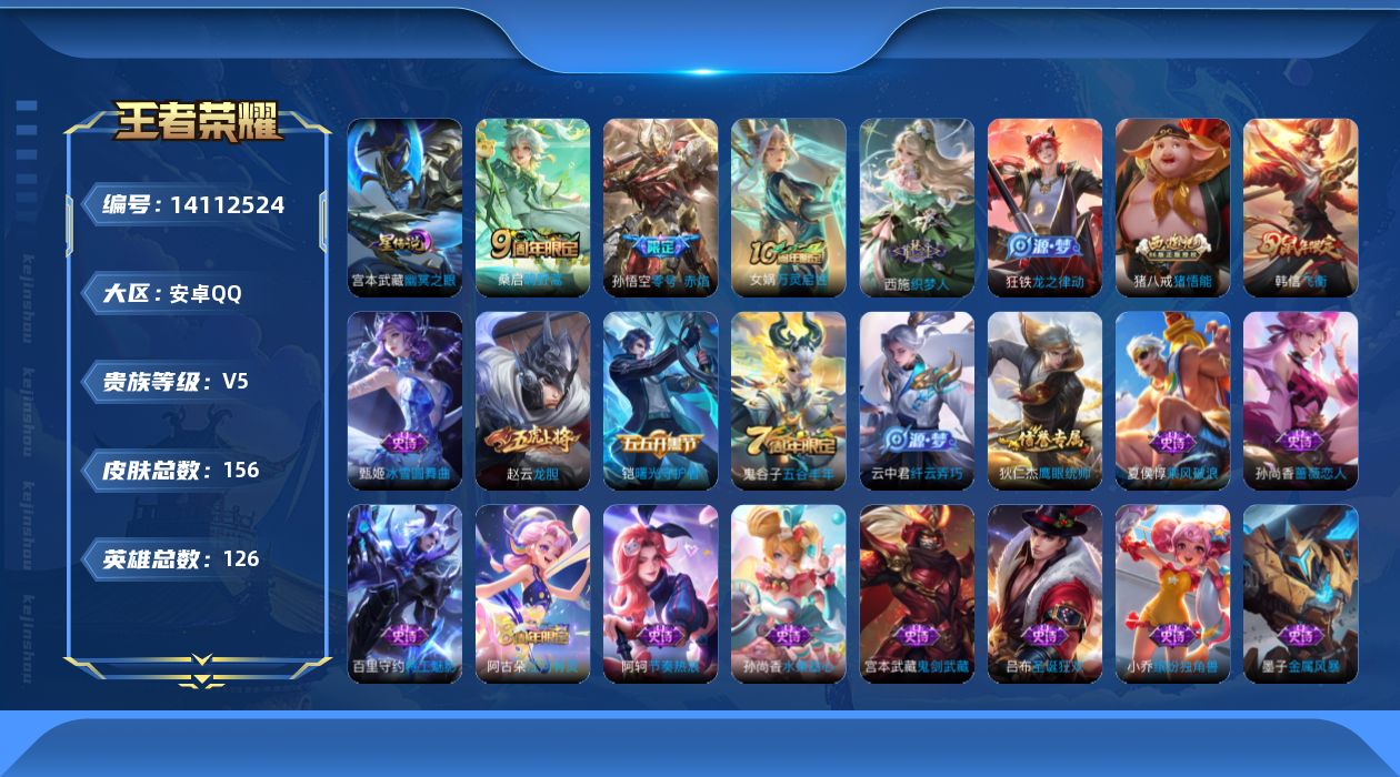 - [12141402]V10 5典藏 5无双 8珍品传说 64传说 125英雄 509皮肤 可修改实名 优质装备:鸣剑·曳影,全息碎影(猴子典藏),九霄神辉(木兰典藏),银白咏叹调(倪克斯侍卫),弑枪猎影(韩信典藏),真我赫兹(瑶)(瑶无双),小乔时之魔女(小乔无双),韩信群星魔术团(韩信无双),器灵·螭龙剑,天机白泽,江户川柯南,怪盗基德,器灵·落星盏,酷洛米之心,大耳狗之梦,朽木白哉,黑崎一护,黄金狮子座,黄金射手座,冠军飞将,云鹰飞将(小将军),绛天战甲(鸡嘴战神),猫影幻舞,久胜战神,炽阳神光,一念神魔,末日机甲-孙尚香(绿蚂蚱),地狱火,仲夏夜之梦(大飞蛾),音你心动-小乔,零号·赤焰,海洋之心,地狱之眼,音你心动-周瑜,胖达荣荣,李逍遥,乞巧织情,时之恋人-刘备(电焊工),淬星耀世,超时空战士-狄仁杰,末日机甲-孙策,挚爱之约,无双飞将,音你闪耀(rap皮),碎云,浮生妄,记忆之芯(机甲兔),妄想实况,妄想奇谈,惊梅引,澜逐花归海,艾琳觅芳踪,千劫归真,诡秘之主,千山共赴,涂山容容 珍品传说:时之奇旅-孙策 传说皮:典韦战鼓燎原,落雪白狼,死亡执政官,九山相柳,星之鸣奏,祥瑞亨通,幻光神枪 珍宝阁皮:万物之道,蔷薇恋人,女武神 限定皮:愿照·九州拓(澜年限),愿照·福禄聚(蔡文姬年限),愿照·岁时盈(虞姬年限),愿照·山河定(司空震年限),愿照·众生和(妲己年限),愿照·千秋盛(女娲年限),逐霄战戟,鸣野蒿,至尊宝,白虎志(电光耗子),武陵仙君(小桃花),傲雪梅枪,绯月行,白鹤梁神女,时雨天司(水龙头),神威(电光马子),飞衡(韩信年限),山海·碧波行(瑶年限),至美·乘鲤谣,至美·化雀舞,遇见飞天,高山流水,诗剑行,怒海麟威,五谷丰年,武圣,游园惊梦,梁祝,逐梦之翼,天狼溯光者,虎魄,天狼征服者,天狼绘梦者,李小龙,逐梦之影,朱雀志(守约年限),永曜之星,辉光之辰,孙行者,猪悟能,大圣娶亲,引擎之心,乒乒小将,蜜橘之夏,寅虎·御盾(廉颇年限),百木心枪,玉兔公主,启示之音,深海之息(深海大菠萝),山海·玄木吟(马可年限),冰霜神祇 史诗皮:赞萌露比,鸭鸭历险记-刘禅,苍鳞隐世,器灵·浮梦炉,糖绘人间,瑰影绮梦,化蝶舞,灵蛊蚀心,星界战将,龙之律动,雪豹·霜爪,布丁狗之誓,小牛鸭,石田雨龙,百相守梦-周瑜,戍鼓铭心,茶境仙,幻珠鲛人,怒海争锋,破空之剑,战舞者,涂山红红,