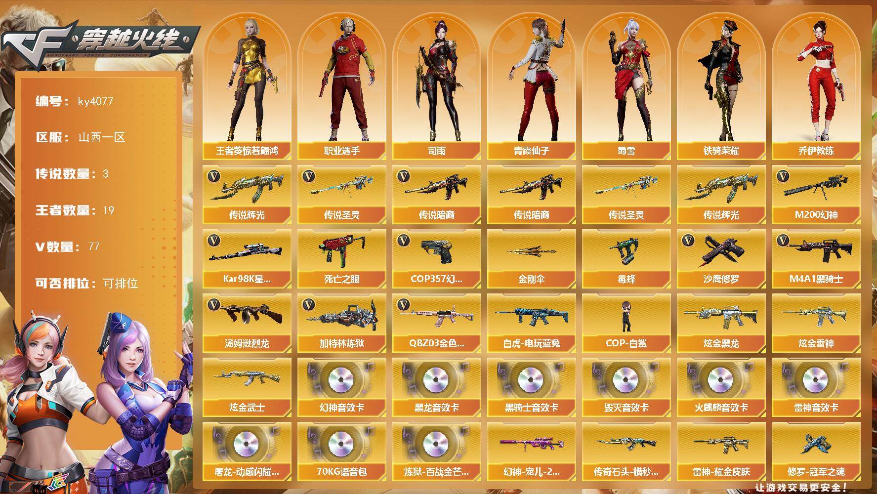 [15400583]山西一区-77V-19王者-3炫金 【传说武器】:传说暗裔,传说辉光,传说圣灵 【热门武器】:传说暗裔,传说圣灵,传说辉光,QBZ03-金色蔷薇,M200-幻神,死亡之眼,白虎-电玩蓝兔,Kar98K-星神,毒蜂,M4A1-黑骑士,汤姆逊-烈龙*5,加特林-炼狱,COP-白鲨,COP 357-幻灵,沙鹰-修罗*3,金刚伞 【王者炫金武器】:炫金黑龙,炫金雷神,炫金武士 【音效卡】:屠龙-动感闪耀 音效卡,M200-幻神音效卡,AK47-火麒麟音效卡,M4A1-雷神音效卡,M4A1-黑龙音效卡,M4A1-黑骑士音效卡,Barrett-毁灭音效卡,70KG语音包,炼狱-百战金芒-庆典舞曲音效卡 【皮肤】:幻神-宠儿-2021MVP,金色蔷薇-纸灯龙皮肤,QBZ03-荣耀世冠EP 皮肤,雷神-暗月,雷神-耀金皮肤,雷神-R.LGD-CFPLS18冠军,M4A1-再燃火线,火麒麟-雷神,传奇石头-横秒之巅,火麒麟-平天大圣,火麒麟-百城,火麒麟-巅峰荣耀,火麒麟-心动糖果,毁灭-黑大圣皮肤,毁灭-风暴,毁灭-魔灵皮肤,M4A1-千变-孔明皮肤,黑龙-墨子皮肤,黑骑士-破浪10年皮肤,天罚-课桌奇兵 皮肤,战神-粉色甜心皮肤,战神-紫绶金章皮肤,AK47-B-常胜将军-曹操,AK47-B-常胜将军-刘备,AK47-B-常胜将军-孙权,极光-能量核心,修罗-冠军之魂*2,屠龙-荣耀之锋,屠龙-春桃 皮肤,龙啸-冠军之啸,轻型军用手斧-再燃火线,擎天-冠军之击 【角色】:司雨,妮妮,王者葵-惊若翩鸿,乔伊教练,云海玲珑,空,初恋灵狐,电竞少女,芳心审判者,风暴女,虎妞,嘉年华灵狐,娟娟,卡塔琳娜,兰-新年限定,兰妹妹,猎狐者-追月,灵狐者-X,灵狐者-七夕宝贝,龙儿,麻雀,曼陀罗-X,玫瑰花神,潘多拉-X,潘多拉-甜心教官,青霞仙子,蜀雪,铁骑荣耀,兔囡囡,新娜塔莎,雪莉杨,职业选手 【人偶武器】:COP-白鲨,迷你宝贝,AWM-灵狐-15周年嘉年华,M37-葵,迷你深渊冰龙,迷你裂空之翼,迷你波特博士*4,夺魂,迷你火种*2,迷你生化手雷,生化手雷-机甲核心*2,深渊终结者手雷*2,闪光弹-貂蝉,高爆手雷-大乔,迷你艾比,迷你超能女侍,灵狐娃娃手雷 【暴走生化】:毒蜂,死亡之眼 【挑战大师】:冰龙粉碎者-白马银枪,激光毁灭者III-白马银枪*2,激光毁灭者III,试炼破坏者I