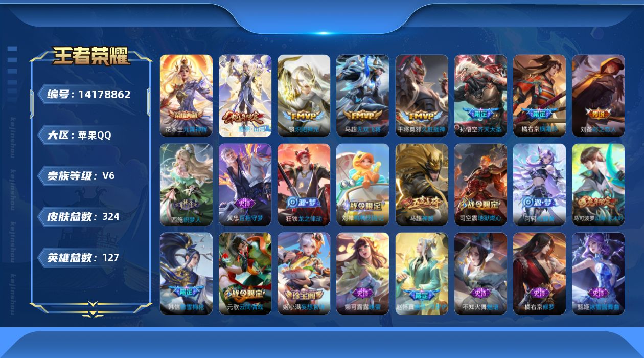 [14178862]苹果Q-323皮肤-1典藏皮肤-8传说-81史诗 【英雄全皮】:橘右京全皮,鬼谷子全皮,蒙恬全皮,司空震全皮,戈娅全皮,影全皮 【荣耀典藏】:花木兰九霄神辉 【传说皮肤】:后羿神树通天,司空震愿照山河定,孙悟空齐天大圣,橘右京枫霜尽,马超无双飞将,镜炽阳神光,刘备时之恋人,干将莫邪久胜战神 【限定皮肤】:白起狰,蔡文姬夏日便利店,虞姬夏日便利店,姜子牙天穹之誓,狄仁杰阴阳师,赵云皇家上将,墨子神迹守卫,嬴政优雅恋人,孙尚香蔷薇恋人,庄周高山流水,高渐离死亡摇滚,芈月重明,元歌云间偶戏,元歌无心,夏侯惇朔风刀,曹操烛龙,典韦穷奇,马可波罗山海玄木吟,狄仁杰魔术师,狄仁杰万华元夜,达摩沙漠行僧,项羽海滩派对,老夫子醍醐杖,老夫子航海奇遇记,程咬金演武夺筹,韩信逐梦之影,韩信傲雪梅枪,兰陵王金庭之子,橘右京枫霜尽,亚瑟潮玩骑士王,孙悟空齐天大圣,牛魔御旌,后羿圣弓游侠,李元芳云中旅人,钟馗驱傩正仪,杨戬潮玩骑兵,女娲朔望之晖,干将莫邪真爱魔法,雅典娜黎明之约,蔡文姬繁星吟游,太乙真人华丽摇滚,鬼谷子原初探秘者,鬼谷子五谷丰年,苏烈千军破阵,百里玄策原初追逐者,弈星混沌棋,梦奇顽趣,沈梦溪大漠名商,明世隐疑决卦,裴擒虎李小龙,裴擒虎擒涛扼浪,狂铁御狮,米莱狄御霄,云中君纤云弄巧,盾山御銮,上官婉儿梁祝,嫦娥拒霜思,嫦娥暖冬兔眠,西施玲珑珍味,鲁班大师探海日志,桑启海盐诗旅,暃星界游侠,戈娅驭风魔法,艾琳女武神,艾琳流音漫舞,司空震地狱燃心,阿古朵江河有灵,张良古海寻踪,蒙犽百解令,蒙恬荣光圣徽,高渐离燃音魔法,妲己灵卜魔法,鬼谷子天穹祈灯,姬小满妄想食味,沈梦溪龙舞盛年,鲁班七号蔬乡物语,李元芳蔬乡物语,刘邦剑破天穹,程咬金群星魔术团,镜青焰无极,项羽苍威无极,刘备异域游侠,周瑜熔金海岸 【年限皮肤】:马超神威,马可波罗山海玄木吟 【赛季限定】:白起狰,芈月重明,夏侯惇朔风刀,曹操烛龙,典韦穷奇,狄仁杰万华元夜,达摩沙漠行僧,老夫子醍醐杖,程咬金演武夺筹,兰陵王金庭之子,张良古海寻踪,牛魔御旌,李元芳云中旅人,钟馗驱傩正仪,雅典娜黎明之约,鬼谷子原初探秘者,苏烈千军破阵,百里玄策原初追逐者,弈星混沌棋,梦奇顽趣,沈梦溪大漠名商,明世隐疑决卦,裴擒虎擒涛扼浪,狂铁御狮,米莱狄御霄,盾山御銮,鲁班大师探海日志,桑启海盐诗旅,鬼谷子天穹祈灯,蒙恬荣光圣徽,刘邦剑破天穹,姜子牙天