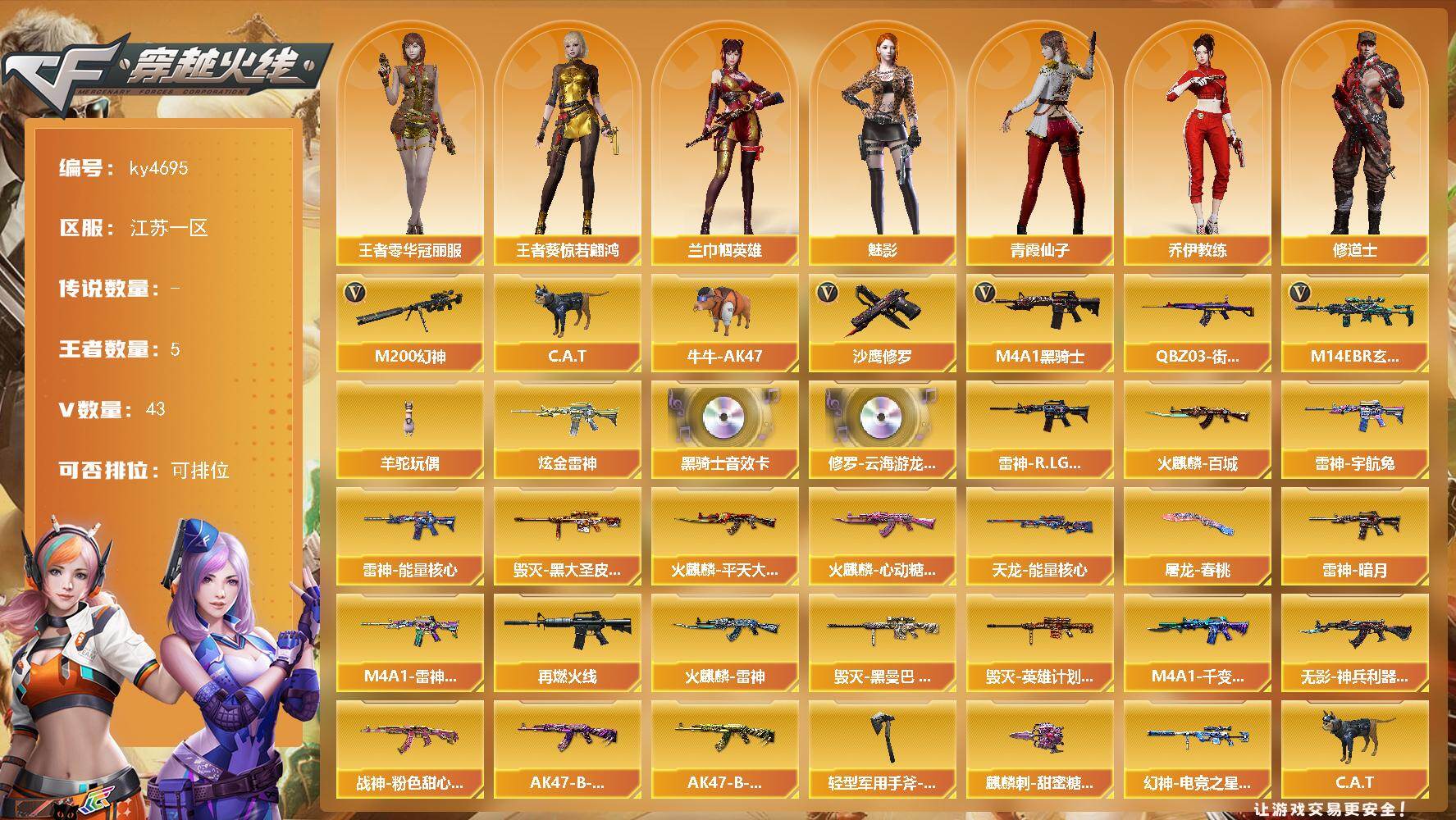 [15400646]江苏一区-43V-5王者-1炫金 【热门武器】:M14EBR-玄武,M200-幻神,QBZ03-街机,C.A.T,牛牛-AK47,M4A1-黑骑士,羊驼玩偶,沙鹰-修罗 【王者炫金武器】:炫金雷神 【音效卡】:修罗-云海游龙音效卡,M4A1-黑骑士音效卡 【皮肤】:幻神-电竞之星 皮肤,雷神-暗月,雷神-能量核心,雷神-R.LGD-CFPLS18冠军,雷神-宇航兔皮肤,M4A1-雷神-巅峰荣耀皮肤,M4A1-再燃火线,火麒麟-雷神,火麒麟-平天大圣,火麒麟-百城*2,火麒麟-心动糖果,毁灭-黑大圣皮肤,毁灭-黑曼巴 皮肤,毁灭-英雄计划 皮肤,M4A1-千变-孔明皮肤,无影-神兵利器 皮肤,战神-粉色甜心皮肤,AK47-B-常胜将军-曹操,AK47-B-常胜将军-孙权,天龙-能量核心,屠龙-春桃 皮肤,轻型军用手斧-再燃火线,麒麟刺-甜蜜糖果 皮肤 【角色】:魅影,兰-巾帼英雄,王者零-华冠丽服,王者葵-惊若翩鸿,奇洋探员,乔伊教练,修道士,云海玲珑,空,电竞少女,飞虎队-X,风暴女,虎妞,嘉年华灵狐,娟娟,兰-新年限定,灵狐-花神,龙儿,麻雀,萌儿,潘多拉-X,潘多拉-甜心教官,潜龙队-X,青霞仙子,斯沃特-X,兔囡囡,雪莉杨-摸金校尉,樱-战斗天使,影武者-X 【人偶武器】:M4A1-雷神-精英刀锋,AWM-灵狐-15周年嘉年华*2,海滩汪汪-巴雷特,C.A.T,牛牛-AK47,迷你波特博士,迷你火种,生化手雷-机甲核心*2,深渊终结者手雷*2,迷你超能女侍 【暴走生化】:黑龙吞噬者,超级对讲机 【挑战大师】:冰龙粉碎者-白马银枪,神圣爆裂者-末日III 【英雄级武器】:AK47-火麒麟*2,M4A1-雷神,M4A1-黑骑士,AK47-无影,AK47-黑武士,AK12-天启,M14EBR-玄武,无影-神兵利器,烈火-动感闪耀,王者之魄-觉醒版,天启-悦智-觉醒版,AK-47-猩红传说*2,王者芳薇-觉醒版,AWM-天龙,Barrett-毁灭*2,M200-幻神,Barrett-朱雀,烈龙-云海游龙*2,沙鹰-修罗,沙鹰-天神,天神-动感闪耀,龙啸,麒麟刺,屠龙-动感闪耀,擎天-云海游龙,麒麟刺-百战金芒,高爆手雷-幻灵,手雷-动感闪耀,手雷-云海游龙,手雷-热带奇洋,高爆手雷-玄豹,闪光弹-幻灵,闪光弹-玄豹,烟雾弹-幻灵 【道具】:BS战队炫彩背包,云海游龙