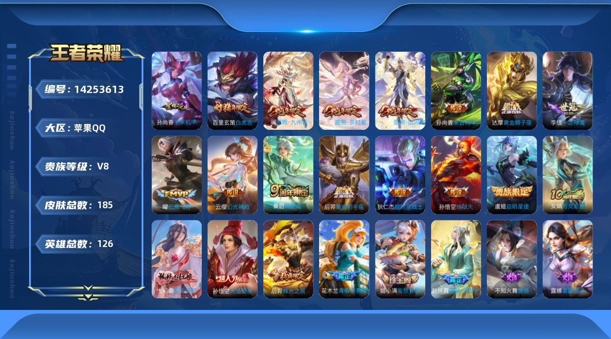 [14253613]金标后裔苹果Q-185皮肤-14传说-45史诗 【传说皮肤】:司空震愿照山河定,澜愿照九州拓,虞姬愿照岁时盈,云缨幻光神枪,桑启鸣野蒿,虞姬启明星使,曜云鹰飞将,李信一念神魔,达摩黄金狮子座,百里玄策白虎志,后羿黄金射手座,孙尚香末日机甲,孙悟空地狱火,狄仁杰超时空战士 【限定皮肤】:白起狰,蒙犽顽岩魄,姜子牙天穹之誓,狄仁杰阴阳师,赵云皇家上将,妲己热情桑巴,芈月重明,甄姬游园惊梦,曹操烛龙,典韦穷奇,狄仁杰魔术师,狄仁杰万华元夜,达摩沙漠行僧,项羽海滩派对,老夫子醍醐杖,程咬金演武夺筹,韩信逐梦之影,兰陵王金庭之子,花木兰青春决赛季,孙悟空大圣娶亲,牛魔御旌,后羿辉光之辰,李元芳银河之约,虞姬启明星使,钟馗驱傩正仪,女娲朔望之晖,太乙真人饕餮,鬼谷子原初探秘者,百里玄策白虎志,百里玄策原初追逐者,弈星混沌棋,沈梦溪星空之诺,沈梦溪大漠名商,明世隐疑决卦,裴擒虎李小龙,米莱狄御霄,云中君纤云弄巧,盾山御銮,上官婉儿梁祝,姬小满妄想食味,沈梦溪龙舞盛年,刘邦剑破天穹,周瑜熔金海岸 【年限皮肤】:百里玄策白虎志,后羿辉光之辰 【赛季限定】:白起狰,芈月重明,曹操烛龙,典韦穷奇,狄仁杰万华元夜,达摩沙漠行僧,老夫子醍醐杖,程咬金演武夺筹,兰陵王金庭之子,牛魔御旌,钟馗驱傩正仪,太乙真人饕餮,鬼谷子原初探秘者,百里玄策原初追逐者,弈星混沌棋,沈梦溪大漠名商,明世隐疑决卦,米莱狄御霄,盾山御銮,刘邦剑破天穹,姜子牙天穹之誓 【战令限定】:李元芳银河之约,女娲朔望之晖,沈梦溪星空之诺 【史诗皮肤】:项羽苍穹之光,露娜紫霞仙子,赵云皇家上将,赵云未来纪元,貂蝉圣诞恋歌,狄仁杰魔术师,宫本武藏鬼剑武藏,孙尚香水果甜心,吕布圣诞狂欢,刘禅绅士熊喵,曹操幽灵船长,李白千年之狐,妲己热情桑巴,花木兰水晶猎龙者,刘邦德古拉伯爵,韩信逐梦之影,夏侯惇乘风破浪,小乔缤纷独角兽,兰陵王暗隐猎兽者,诸葛亮黄金分割率,甄姬游园惊梦,亚瑟心灵战警,安琪拉心灵骇客,后羿辉光之辰,花木兰青春决赛季,百里守约特工魅影,铠曙光守护者,蔡文姬舞动绿茵,李元芳逐浪之夏,孙悟空大圣娶亲,狄仁杰鹰眼统帅,上官婉儿梁祝,李元芳银河之约,小乔青蛇,不知火舞魅语,百里玄策原初追逐者,裴擒虎李小龙,云中君纤云弄巧,姬小满妄想食味,蒙犽顽岩魄,大司命东方月初,姬小满战舞者,亚连破空之剑,赵怀真器灵浮梦炉,女娲万灵启世 【其
