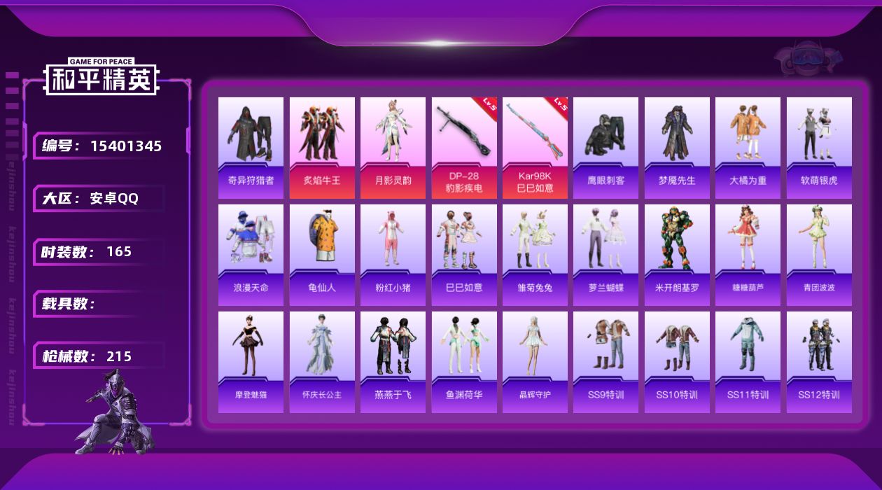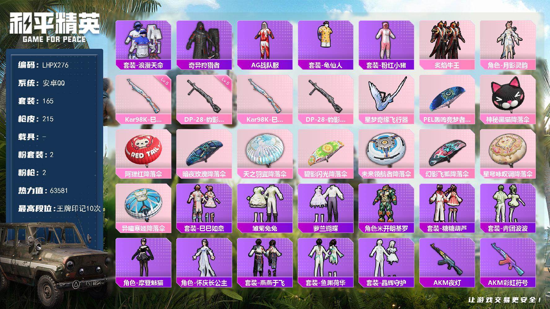 [15401345]【特价出售/店主推荐】 地铁满天赋 安卓 手Q-2粉装-2特效枪-0载具-2粉色飞行器-6.3w热力值-10王牌印记-165套装-215枪皮【热门品类】:套装-浪漫天命,套装-奇异狩猎者,套装-AG战队服,套装-龟仙人,套装-粉红小猪【粉色套装】:粉装-炙焰牛王,角色-月影灵韵【粉色枪皮等级】:Kar98K-巳巳如意(五级),DP-28-豹影疾电(五级)【粉色枪皮】:Kar98K-巳巳如意,DP-28-豹影疾电【粉色飞行器】:星梦奇缘飞行器