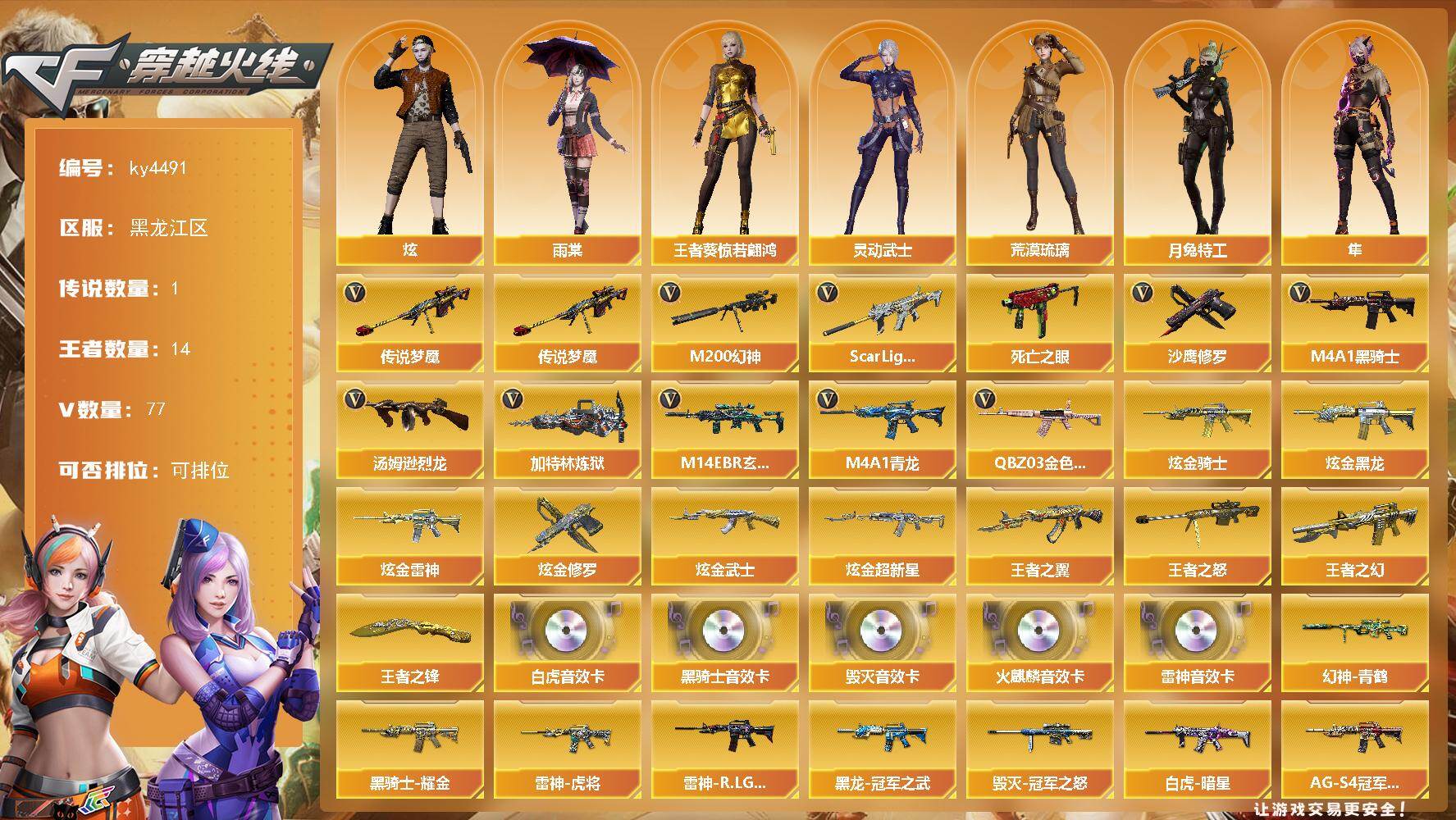 [15401426]黑龙江区-77V-14王者-8炫金 【传说武器】:传说梦魇 【热门武器】:传说梦魇,QBZ03-金色蔷薇,M14EBR-玄武,Scar Light-白虎,M4A1-青龙,M200-幻神,死亡之眼,M4A1-黑骑士,汤姆逊-烈龙,加特林-炼狱,沙鹰-修罗*3 【王者炫金武器】:王者之幻,王者之翼,王者之怒,王者之锋,炫金骑士,炫金黑龙,炫金雷神,炫金武士*2,炫金超新星*2,炫金修罗 【音效卡】:AK47-火麒麟音效卡,M4A1-雷神音效卡,M4A1-黑骑士音效卡,Barrett-毁灭音效卡,Scar Light-白虎音效卡 【皮肤】:幻神-青鹤,Scar Light-白虎-暗星,裁决-胜者为王 皮肤,雷神-虎将,雷神-R.LGD-CFPLS18冠军,火麒麟-雷神,毁灭-冠军之怒,黑龙-能量核心*2,黑龙-冠军之武,黑骑士耀金皮肤,黑骑士-AG-S4冠军典藏,战神-紫绶金章皮肤 【角色】:葵,炫,雨棠,月兔特工,荒漠琉璃,隼,王者葵-惊若翩鸿,乔伊教练,空,暗夜-X,嘉年华灵狐,娟娟,葵-赛博朋克,兰-海滩派对,灵动武士,女战神,新娜塔莎 【暴走生化】:死亡之眼,超级对讲机 【挑战大师】:冰龙粉碎者-白马银枪,激光毁灭者III 【英雄级武器】:AK47-火麒麟,M4A1-黑龙,M4A1-雷神*2,M4A1-黑骑士,M4A1-死神,AK47-黑武士,AK47-黑鲨,M4A1-龙血,M4A1-雷霆,M4A1-青龙,Scar Light-白虎,M14EBR-玄武,黑武士-锦绣游龙,QBZ03-金色蔷薇,M4A1-猎神,王者之魄-觉醒版,AK-47-猩红传说,王者冰魄-觉醒版,王者火魄-觉醒版,王者风势-觉醒版,Barrett-毁灭*4,Barrett-极光,AWM-裁决*2,M200-幻神,王者风神-觉醒版,加特林-炼狱,汤姆逊-烈龙,沙鹰-修罗*3,COP-雷霆,王者之魂-觉醒版,屠龙*6,擎天,麒麟刺*4,高爆手雷-雷霆*7,闪光弹-雷霆*7,烟雾弹-雷霆*7 【道具】:AG战队炫彩背包,BS战队炫彩背包,EP战队炫彩背包,KZ战队炫彩背包,Q9战队炫彩背包,炫彩背包,超级背包,女皇终结者-魔龙之吻,绿色巨人,灵魂忍者,变异宝贝,迷雾幽灵,夺命之镰,防化服*3,金色流光-枪王排位*2,星辰流光-枪王排位,流光-鎏金之域,枪王排位28赛季金色流光,电玩兔兔表情,动感闪耀