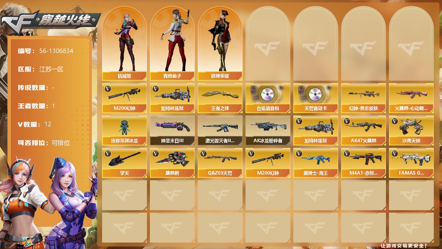 [15401651]江苏一区-12V-1王者-0炫金 【热门武器】:M200-幻神,加特林-炼狱 【王者炫金武器】:王者之锋 【音效卡】:QBZ03-天罚音效卡,白鲨语音包 【稀有皮肤】:M200-幻神-黄忠皮肤,火麒麟-心动糖果 【角色】:机械姬,铁骑荣耀,青霞仙子 【人偶武器】:迷你深渊冰龙 【挑战大师】:神圣爆裂者-末日III,激光毁灭者III-白马银枪,AK47-冰龙粉碎者 【英雄级武器】: