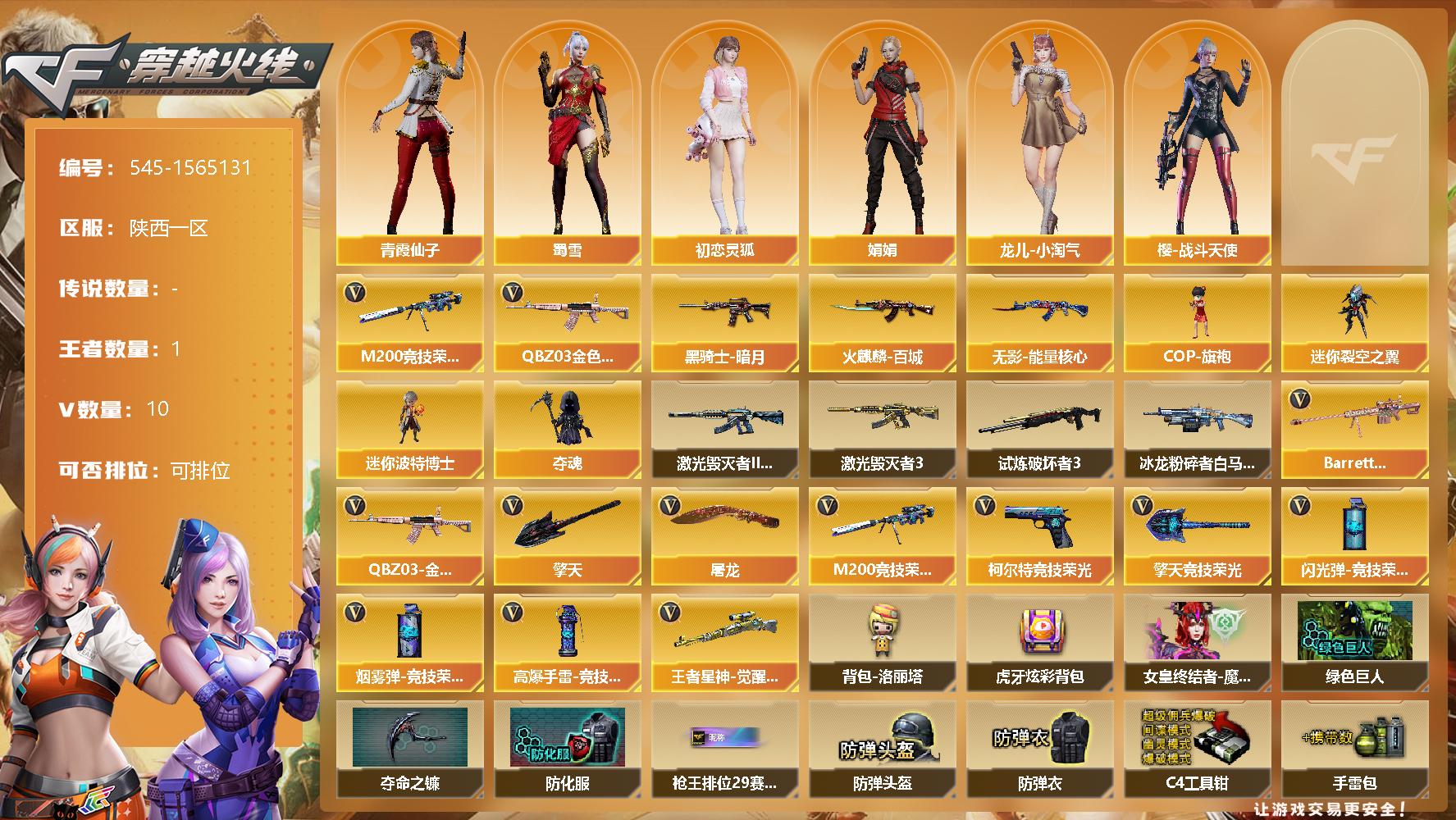 - [15251395]湖南一区-70V-51王者-3炫金 【传说武器】:传说破晓,传说幽冥 【传说角色】:传说女帝,传说影煞 【热门武器】:传说破晓,传说幽冥,QBZ03-金色蔷薇,M200-幻神,金色蔷薇-古蛇迷踪,修罗-古蛇迷踪,M200-竞技荣光,死亡之眼,白虎-电玩蓝兔,QBZ03-街机,金色小号,C.A.T,牛牛-AK47,M4A1-黑骑士,汤姆逊-烈龙*2,加特林-炼狱,USP-雷暴,COP 357-雷霆王者,沙鹰-修罗,金刚伞 【王者炫金武器】:王者青龙,王者猎神,王者雷怒,Barrett-雷霆王者,COP 357-雷霆王者,雷霆王者之锋*3,王者玉锋,炫金火麒麟,炫金武士,炫金毁灭 【音效卡】:M200-幻神音效卡,AK47-火麒麟音效卡,M4A1-雷神音效卡,M4A1-黑骑士音效卡,Barrett-毁灭音效卡,AWM-裁决音效卡,Barrett-碧霄极光音效卡,炼狱-百战金芒-庆典舞曲音效卡 【皮肤】:M200-幻神-黄忠皮肤,幻神-周瑜皮肤,裁决-运输船 皮肤,裁决-胜者为王 皮肤,雷神-暗月,雷神-荣耀之魄,雷神-虎将,雷神-烈虎皮肤,雷神-机甲刑天皮肤,雷神-源计划2.0专属 皮肤,M4A1-再燃火线,火麒麟-雷神,火麒麟-平天大圣,火麒麟-盘古,火麒麟-百城,毁灭耀金皮肤,毁灭-风暴,毁灭-百城浙江 皮肤,M4A1-千变-孔明皮肤,黑龙-能量核心,黑骑士-暗月,黑骑士-冠军之势,黑骑士-地狱火,黑骑士-伏羲,超新星-深海萌鲨 皮肤,战神-粉色甜心皮肤,战神-紫绶金章皮肤,AK47-B-常胜将军-曹操*3,AK47-B-常胜将军-刘备,AK47-B-常胜将军-孙权*2,天龙-秘银,天龙-能量核心,AWM-再燃火线,极光-能量核心,修罗-CF STAR,屠龙-春桃 皮肤,轻型军用手斧-再燃火线,龙啸-青青莓果 皮肤 【角色】:电竞教官-云悠悠,蛇隐宗,奇洋探员,乔伊教练,修道士,云海玲珑,暗夜-X,北极狐-X,电竞少女,芳心审判者,风暴女*2,虎妞,娟娟,猎狐者-追月,0号玩家,零-热舞青春,灵狐者-X,龙儿-小淘气,潘多拉-X,潘多拉-甜心教官,潜龙队-X,青霞仙子,蛇姬,维纳斯,雪莉杨-摸金校尉,樱-战斗天使,影武者-X,幽,智影,雅典娜 【人偶武器】:天龙-乔伊教练,加特林-机械猎手,AWM-灵狐-15周年嘉年华,C.A.T,牛牛-AK47,迷你生化手雷,深