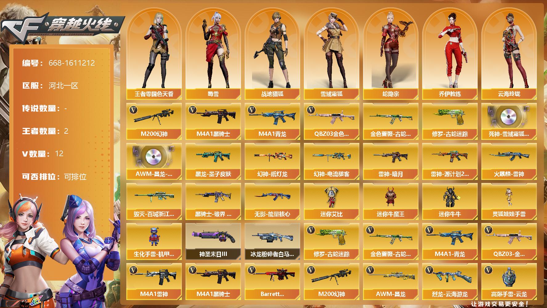 [15401714]河北一区-12V-2王者-0炫金 【热门武器】:QBZ03-金色蔷薇,M4A1-青龙,M200-幻神,金色蔷薇-古蛇迷踪,修罗-古蛇迷踪,M4A1-黑骑士 【音效卡】:死神-雪域霜狐-怀旧音效卡,AWM-昌龙-怀旧音效卡 【皮肤】:幻神-纸灯龙皮肤,幻神-电流骇客 皮肤,雷神-暗月,雷神-源计划2.0专属 皮肤,火麒麟-雷神,毁灭-百城浙江 皮肤,黑龙-墨子皮肤,黑骑士-破界 皮肤,无影-能量