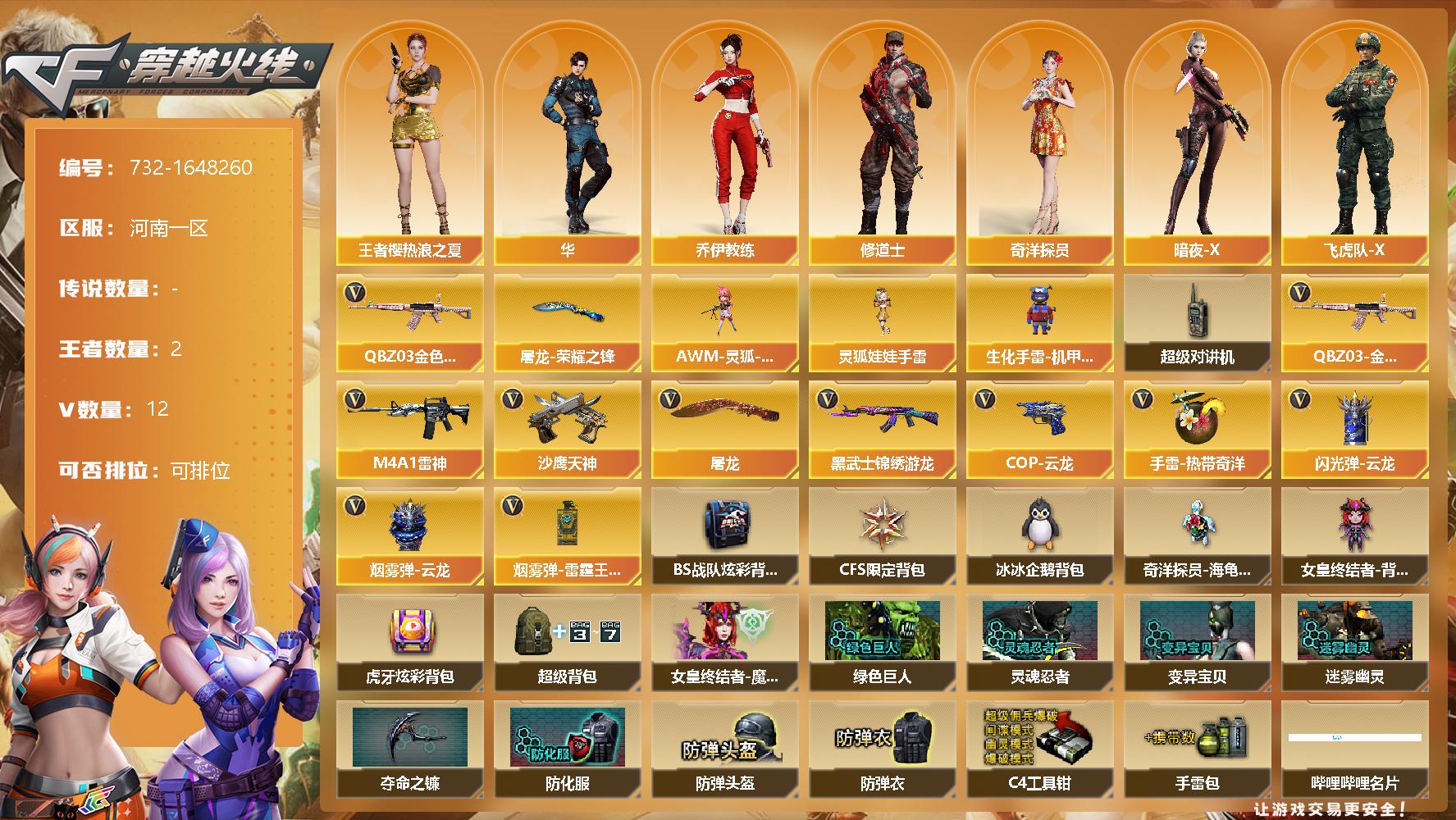 [15401730]河南一区-12V-2王者-0炫金 【热门武器】:QBZ03-金色蔷薇 【皮肤】:屠龙-荣耀之锋 【角色】:华,王者樱-热浪之夏,奇洋探员,乔伊教练,修道士,暗夜-X,飞虎队-X,0号玩家,龙儿-小淘气,潘多拉-X,潘多拉-甜心教官,游珑儿 【人偶武器】:AWM-灵狐-15周年嘉年华,生化手雷-机甲核心,灵狐娃娃手雷 【暴走生化】:超级对讲机 【英雄级武器】:M4A1-雷神,黑武士-锦绣游龙,Q