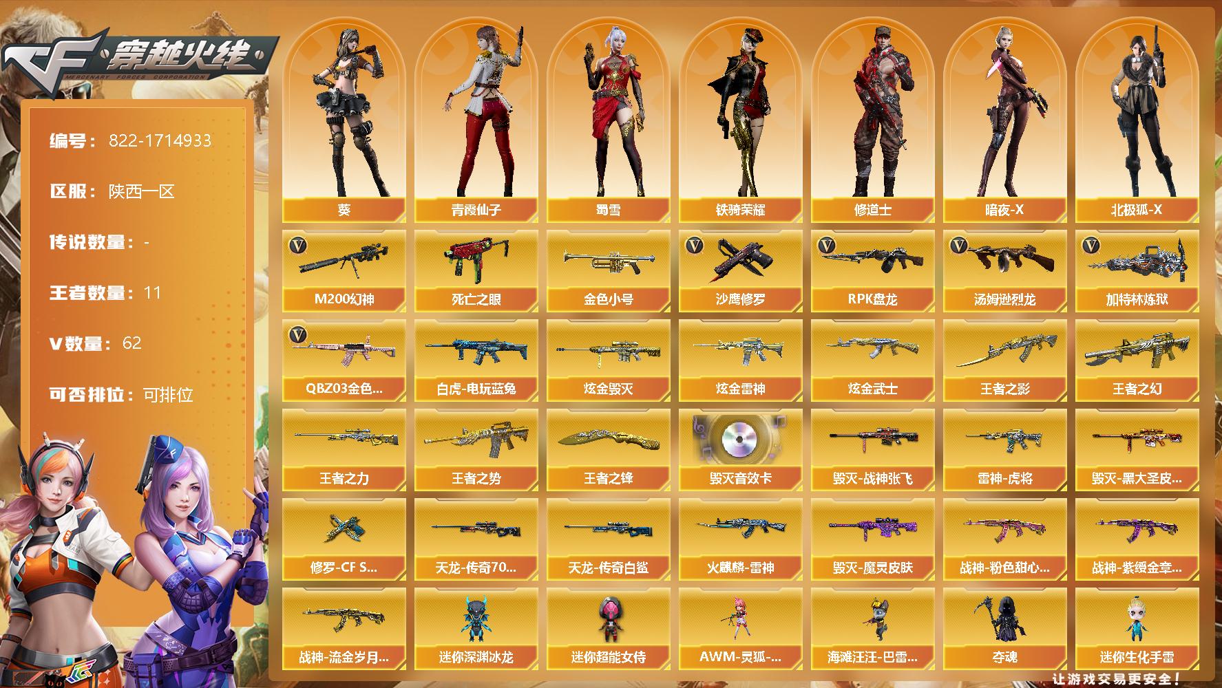 [15401777]陕西一区-62V-11王者-3炫金 【热门武器】:QBZ03-金色蔷薇,M200-幻神,死亡之眼,白虎-电玩蓝兔,金色小号,汤姆逊-烈龙*7,RPK-盘龙*6,加特林-炼狱,沙鹰-修罗*4 【王者炫金武器】:王者之幻,王者之势,王者之影,王者之力,王者之锋,炫金雷神,炫金武士,炫金毁灭 【音效卡】:Barrett-毁灭音效卡 【皮肤】:雷神-虎将,火麒麟-雷神,毁灭-战神张飞,毁灭-黑大圣皮肤