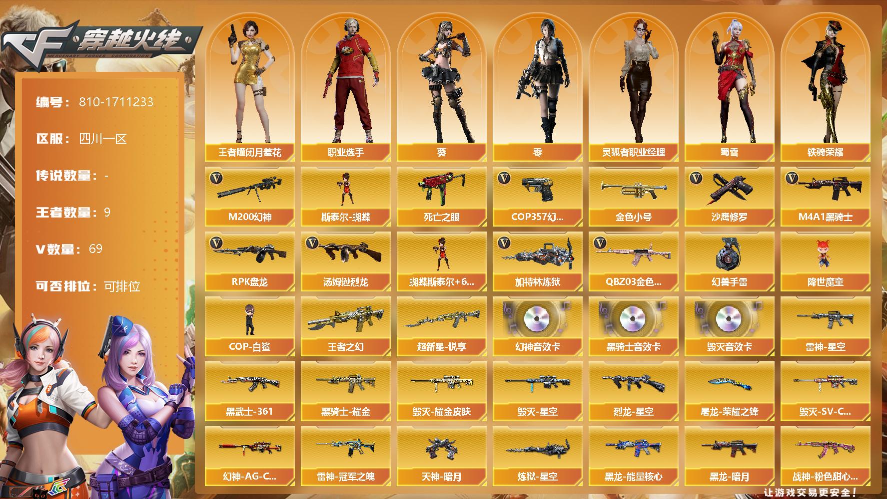 [15401770]四川一区-69V-9王者-0炫金 【热门武器】:QBZ03-金色蔷薇,M200-幻神,死亡之眼,金色小号,M4A1-黑骑士,汤姆逊-烈龙*6,RPK-盘龙*6,加特林-炼狱,斯泰尔-蝴蝶,降世魔童,COP-白鲨,COP 357-幻灵,沙鹰-修罗*2,高爆手雷-幻兽 【王者炫金武器】:超新星-悦享,王者之幻 【音效卡】:M200-幻神音效卡,M4A1-黑骑士音效卡,Barrett-毁灭音效卡 【