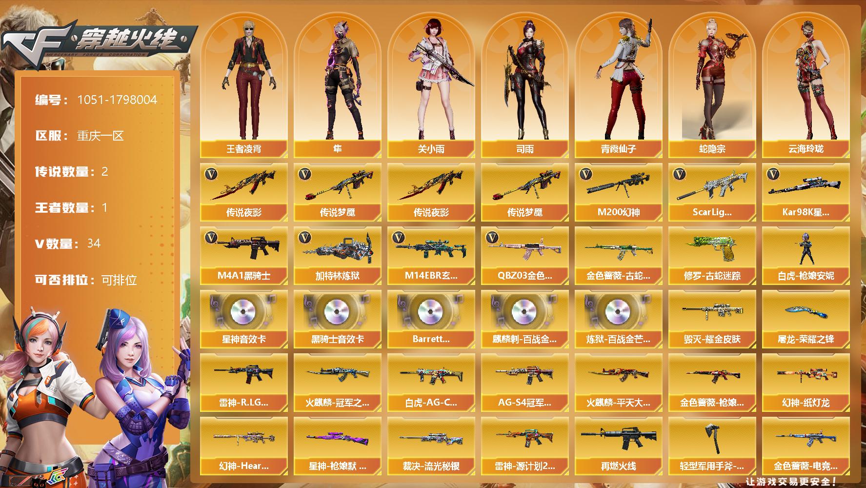 [15401886]重庆一区-34V-1王者-0炫金 【传说武器】:传说夜影,传说梦魇 【热门武器】:传说梦魇,传说夜影,QBZ03-金色蔷薇,M14EBR-玄武,Scar Light-白虎,M200-幻神,金色蔷薇-古蛇迷踪,修罗-古蛇迷踪,Kar98K-星神,M4A1-黑骑士,加特林-炼狱,白虎-枪娘安妮 【音效卡】:M4A1-黑骑士音效卡,Kar98K-星神音效卡,Barrett-碧霄极光音效卡,麒麟刺-百
