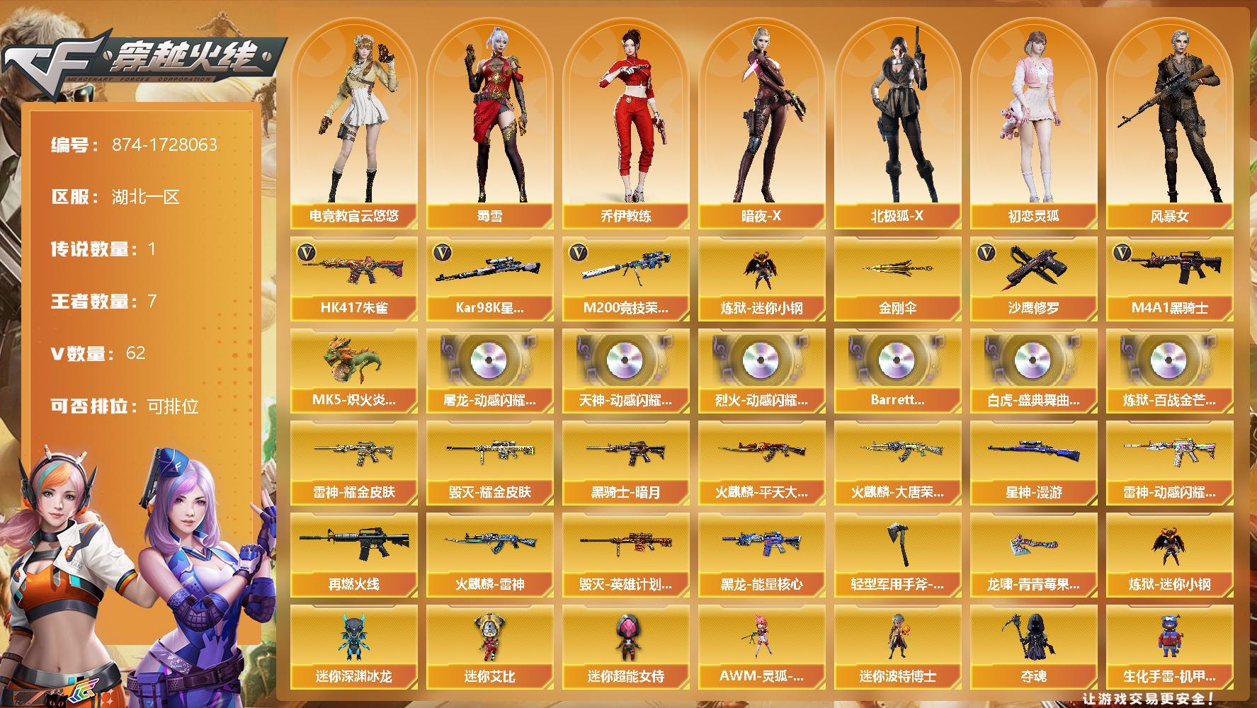 - [15240028]吉林一区-34V-0王者-0炫金 【热门武器】:白虎-电玩蓝兔 【皮肤】:火麒麟-心动糖果,战神-粉色甜心皮肤*2,AK47-B-常胜将军-孙权 【角色】:初恋灵狐,虎妞,嘉年华灵狐,麻雀,曼陀罗-X,潘多拉-X,斯沃特-X,兔囡囡,樱-战斗天使 【人偶武器】:天龙-曼陀罗,AWM-灵狐-15周年嘉年华,迷你裂空之翼,迷你波特博士,夺魂,生化手雷-机甲核心,深渊终结者手雷*3,迷你超能女侍 【挑战大师】:神圣爆裂者III,VEPR-12-金魔,激光毁灭者III,神圣爆裂者-末日III,阐释者III 【英雄级武器】:AK47-火麒麟,AK47-无影,无影-神兵利器,AK-47-猩红传说*3,白虎-电玩蓝兔,USP-神工天巧,唐刀-神工天巧*2,高爆手雷-竞技荣光*2,高爆手雷-神工天巧*7,闪光弹-神工天巧*7,烟雾弹-神工天巧*6 【道具】:背包-洛丽塔,超级背包,黄金曼提柯尔的背包,救世主-黑桃战神,绿色巨人,灵魂忍者,迷雾幽灵,夺命之镰,防化服*2,金色流光-枪王排位,枪王排位29赛季金色流光,电玩兔兔表情,EP战队名片,防弹头盔*3,防弹衣*3,C4工具钳*3,手雷包*3 【特殊枪械】: