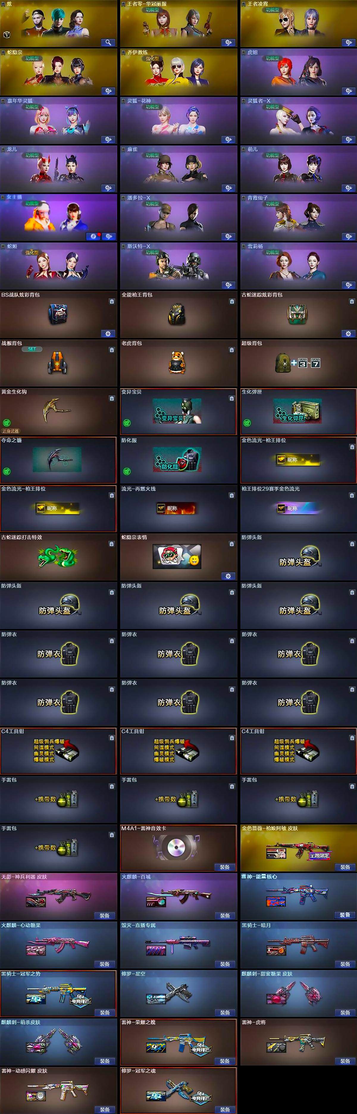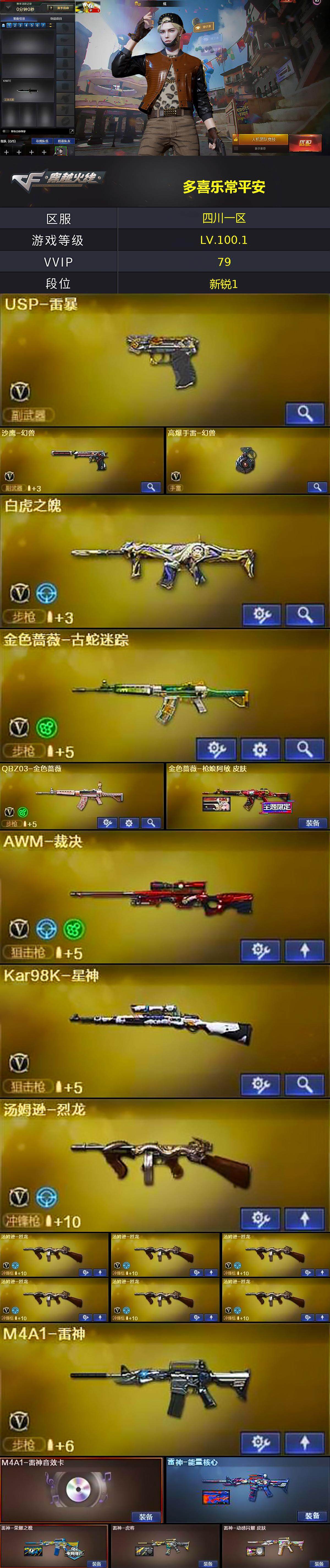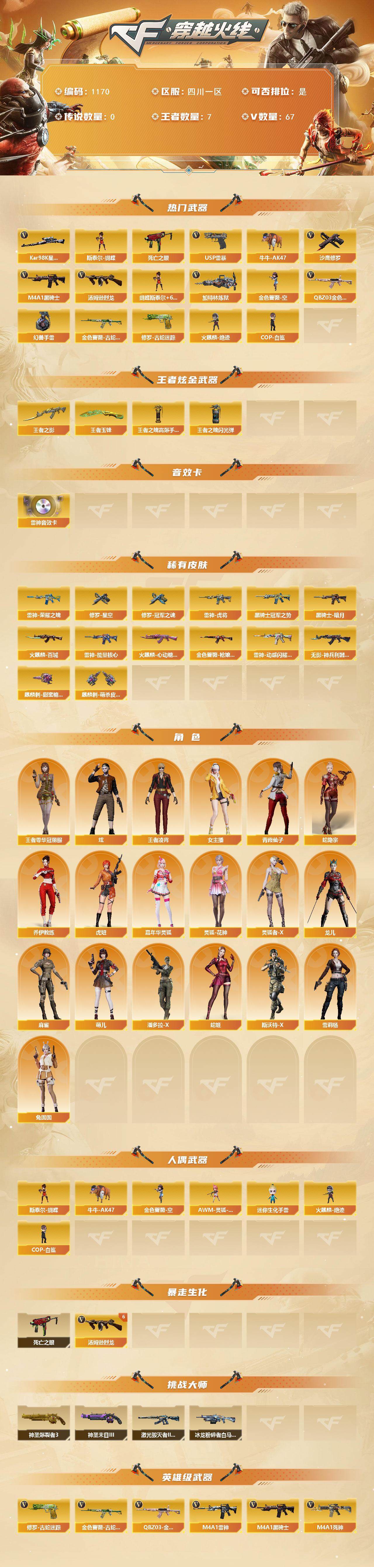 [14983227]四川一区-67V-7王者-0炫金 【热门武器】:QBZ03-金色蔷薇,金色蔷薇-古蛇迷踪,修罗-古蛇迷踪,死亡之眼,Kar98K-星神,牛牛-AK47,M4A1-黑骑士,汤姆逊-烈龙*7,加特林-炼狱*2,金色蔷薇-空,斯泰尔-蝴蝶,火麒麟-绝迹,COP-白鲨,USP-雷暴,沙鹰-修罗,高爆手雷-幻兽 【王者炫金武器】:王者之影,王者玉锋,王者之魄高爆手雷,王者之魄闪光弹 【音效卡】:M4A1-雷神音效卡 【皮肤】:金色蔷薇-枪娘阿敏 皮肤,雷神-能量核心,雷神-荣耀之魄,雷神-虎将,雷神-动感闪耀 皮肤,火麒麟-百城,火麒麟-心动糖果,黑骑士-暗月,黑骑士-冠军之势,无影-神兵利器 皮肤,修罗-星空,修罗-冠军之魂,麒麟刺-甜蜜糖果 皮肤,麒麟刺-萌杀皮肤 【角色】:炫,王者零-华冠丽服,王者凌霄,蛇隐宗,乔伊教练,虎妞,嘉年华灵狐,灵狐-花神,灵狐者-X,龙儿,麻雀,萌儿,女主播,潘多拉-X,青霞仙子,蛇姬,斯沃特-X,兔囡囡,雪莉杨 【人偶武器】:火麒麟-绝迹,COP-白鲨,金色蔷薇-空,斯泰尔-蝴蝶,AWM-灵狐-15周年嘉年华,牛牛-AK47,迷你生化手雷 【暴走生化】:死亡之眼 【挑战大师】:神圣爆裂者III,冰龙粉碎者-白马银枪,激光毁灭者III-白马银枪,神圣爆裂者-末日III 【英雄级武器】:AK47-火麒麟,M4A1-雷神,M4A1-黑骑士,AK47-无影,M4A1-死神,AK47-黑武士,AK12-天启,AN94-超新星,AK47-机械迷城,M4A1-龙血,AK47-雷暴,QBZ03-天罚,无影-神兵利器,金色蔷薇-古蛇迷踪,QBZ03-金色蔷薇,王者之影-觉醒版,白虎之魄-觉醒版,黑武士-CF网剧冠军,AWM-天龙,Barrett-毁灭,AWM-裁决,Kar98K-星神,加特林-炼狱*2,汤姆逊-烈龙*7,沙鹰-修罗,USP-雷暴,沙鹰-幻兽,修罗-古蛇迷踪,天神-CF网剧冠军,屠龙*2,龙啸*5,擎天,麒麟刺*2,幻灵之锋,斩神刀-雷暴,女皇利刃-幻兽,擎天-CF网剧冠军,王者之锋-觉醒版,高爆手雷-幻兽,高爆手雷-雷暴*5,手雷-动感闪耀,高爆手雷-古蛇迷踪,闪光弹-幻兽,闪光弹-雷暴*5,烟雾弹-幻兽,烟雾弹-雷暴*5,烟雾弹-古蛇迷踪 【道具】:BS战队炫彩背包,全能枪王背包,古蛇迷踪炫彩背包,战舰背包,老虎背包,超级背包,黄金生化