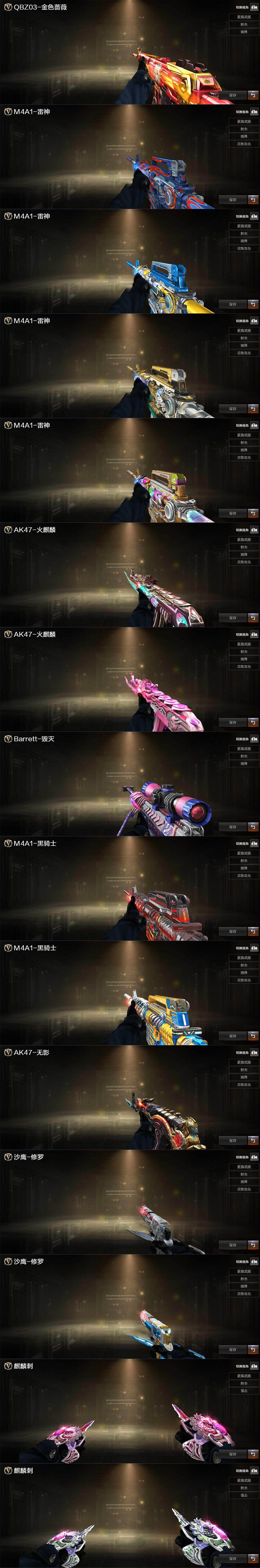 【英雄级武器】:AK47-火麒麟,M4A1-雷神,M4A1-黑骑士,AK47-无影,M4A1-死神,AK47-黑武士,AK12-天启,AN94-超新星,AK47-机械迷城,M4A1-龙血,AK47-雷暴,QBZ03-天罚,无影-神兵利器,金色蔷薇-古蛇迷踪,QBZ03-金色蔷薇,王者之影-觉醒版,白虎之魄-觉醒版,黑武士-CF网剧冠军,AWM-天龙,Barrett-毁灭,AWM-裁决,Kar98K-星神,加特林-炼狱*2,汤姆逊-烈龙*7,沙鹰-修罗,USP-雷暴,沙鹰-幻兽,修罗-古蛇迷踪,天神-CF网剧冠军,屠龙*2,龙啸*5,擎天,麒麟刺*2,幻灵之锋,斩神刀-雷暴,女皇利刃-幻兽,擎天-CF网剧冠军,王者之锋-觉醒版,高爆手雷-幻兽,高爆手雷-雷暴*5,手雷-动感闪耀,高爆手雷-古蛇迷踪,闪光弹-幻兽,闪光弹-雷暴*5,烟雾弹-幻兽,烟雾弹-雷暴*5,烟雾弹-古蛇迷踪