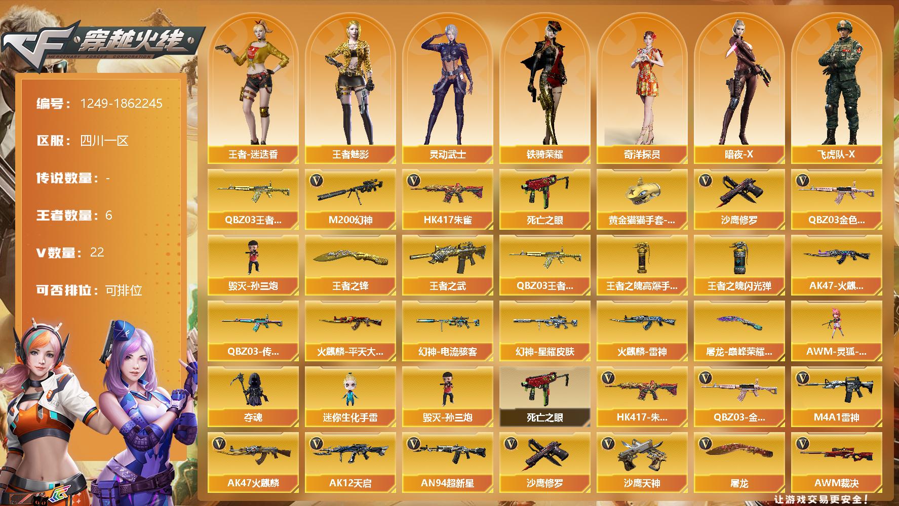 [15402019]四川一区-22V-6王者-0炫金 【热门武器】:QBZ03-金色蔷薇,HK417-朱雀,M200-幻神,QBZ-03-王者蔷薇,死亡之眼,毁灭-孙三炮,沙鹰-修罗,黄金猫猫手套-白鲨 【王者炫金武器】:王者之武,QBZ-03-王者蔷薇,王者之锋,王者之魄高爆手雷,王者之魄闪光弹 【皮肤】:幻神-星耀 皮肤,幻神-电流骇客 皮肤,QBZ03-传奇宠儿,火麒麟-雷神,AK47-火麒麟-传奇EVEN