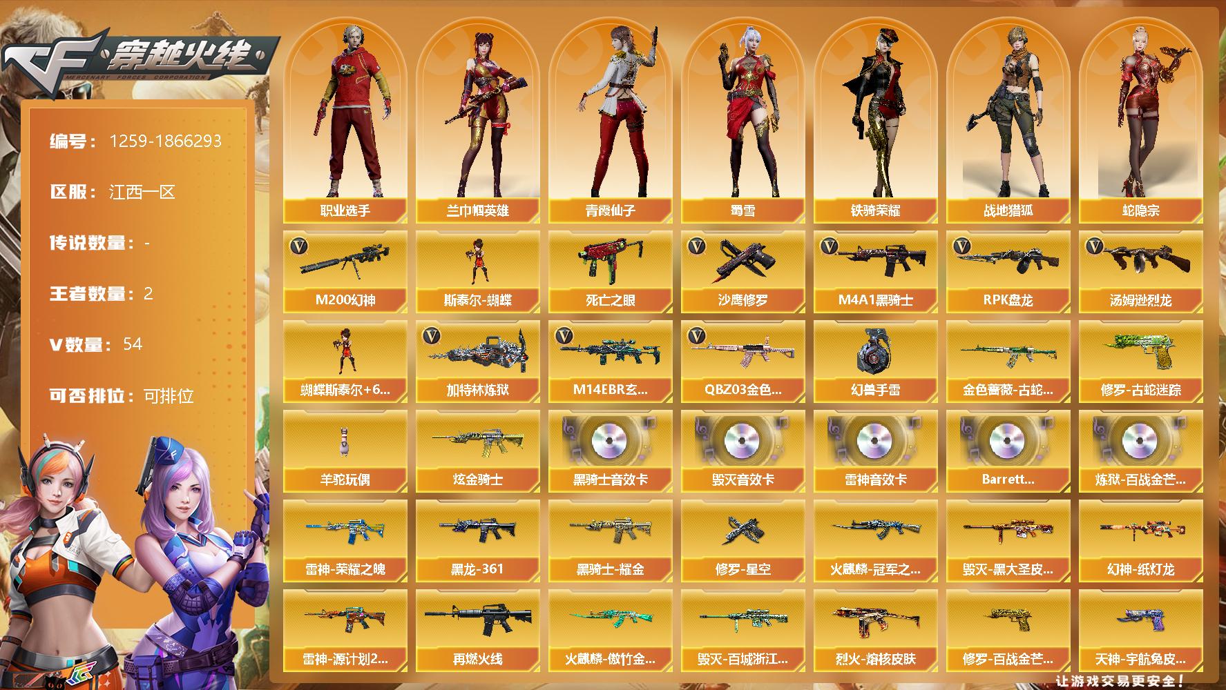 [15402030]江西一区-54V-2王者-1炫金 【热门武器】:QBZ03-金色蔷薇,M14EBR-玄武,M200-幻神,金色蔷薇-古蛇迷踪,修罗-古蛇迷踪,死亡之眼,M4A1-黑骑士,汤姆逊-烈龙*6,RPK-盘龙*5,加特林-炼狱,斯泰尔-蝴蝶,羊驼玩偶,沙鹰-修罗*4,高爆手雷-幻兽 【王者炫金武器】:炫金骑士 【音效卡】:M4A1-雷神音效卡,M4A1-黑骑士音效卡,Barrett-毁灭音效卡,Bar