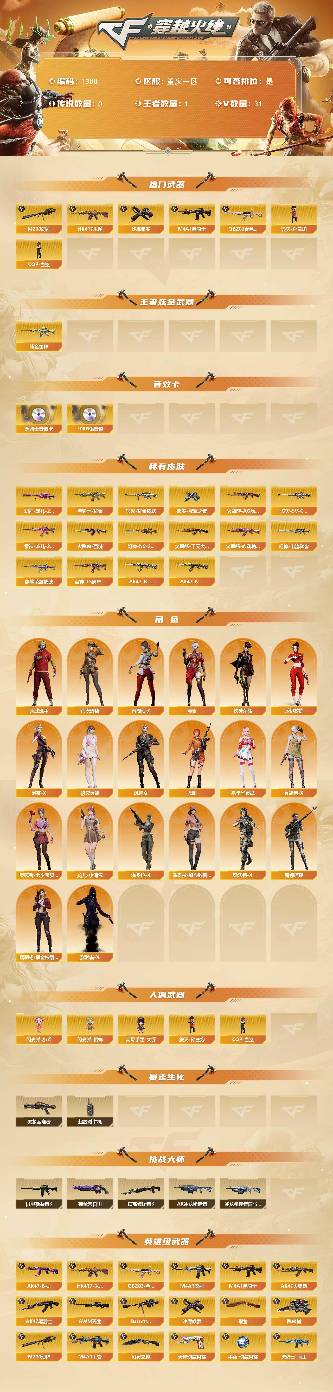 [15199811]重庆一区-31V-1王者-1炫金 【热门武器】:QBZ03-金色蔷薇,HK417-朱雀,M200-幻神,M4A1-黑骑士*2,毁灭-孙三炮,COP-白鲨,沙鹰-修罗*2 【王者炫金武器】:炫金雷神 【音效卡】:M4A1-黑骑士音效卡,70KG语音包 【皮肤】:幻神-宠儿-2021MVP,M200-幻神-N9-2022MVP,幻神-电流骇客 皮肤,QBZ03-巅峰荣耀皮肤,雷神-宠儿-2019MVP,雷神-15周年嘉年华 皮肤,火麒麟-AG战队皮肤,火麒麟-平天大圣,火麒麟-百城,火麒麟-心动糖果,毁灭耀金皮肤,毁灭-SV-CFPLS16冠军,黑骑士耀金皮肤,AK47-B-常胜将军-刘备,AK47-B-常胜将军-孙权,修罗-冠军之魂 【角色】:荒漠琉璃,乔伊教练,暗夜-X,初恋灵狐,风暴女,虎妞,嘉年华灵狐,灵狐者-X,灵狐者-七夕宝贝,龙儿-小淘气,潘多拉-X,潘多拉-甜心教官,青霞仙子,斯沃特-X,蜀雪,铁骑荣耀,新娜塔莎,雪莉杨-摸金校尉,影武者-X,职业选手 【人偶武器】:COP-白鲨,毁灭-孙三炮,闪光弹-小乔,闪光弹-貂蝉,高爆手雷-大乔 【暴走生化】:黑龙吞噬者,超级对讲机 【挑战大师】:AK47-冰龙粉碎者,冰龙粉碎者-白马银枪*2,机甲撕裂者III,试炼破坏者III,神圣爆裂者-末日III*2 【英雄级武器】:M4A1-千变,AK47-火麒麟*2,M4A1-雷神,M4A1-黑骑士*2,AK47-黑武士,HK417-朱雀,QBZ03-金色蔷薇,王者之势-觉醒版,AK-47-猩红传说,黑骑士-海王,AK47-B-常胜将军,AWM-天龙,Barrett-毁灭,M200-幻神,沙鹰-修罗*2,天神-动感闪耀,屠龙*2,麒麟刺,幻灵之锋,高爆手雷-幻灵*2,手雷-动感闪耀,闪光弹-幻灵*2,烟雾弹-幻灵 【道具】:炫彩背包,超级背包,生化弹匣,夺命之镰,防化服,金色流光-枪王排位*2,星辰流光-枪王排位,枪王排位28赛季金色流光,防弹头盔*4,防弹衣*6,C4工具钳*5,手雷包*4 【特殊枪械】:2黑骑士