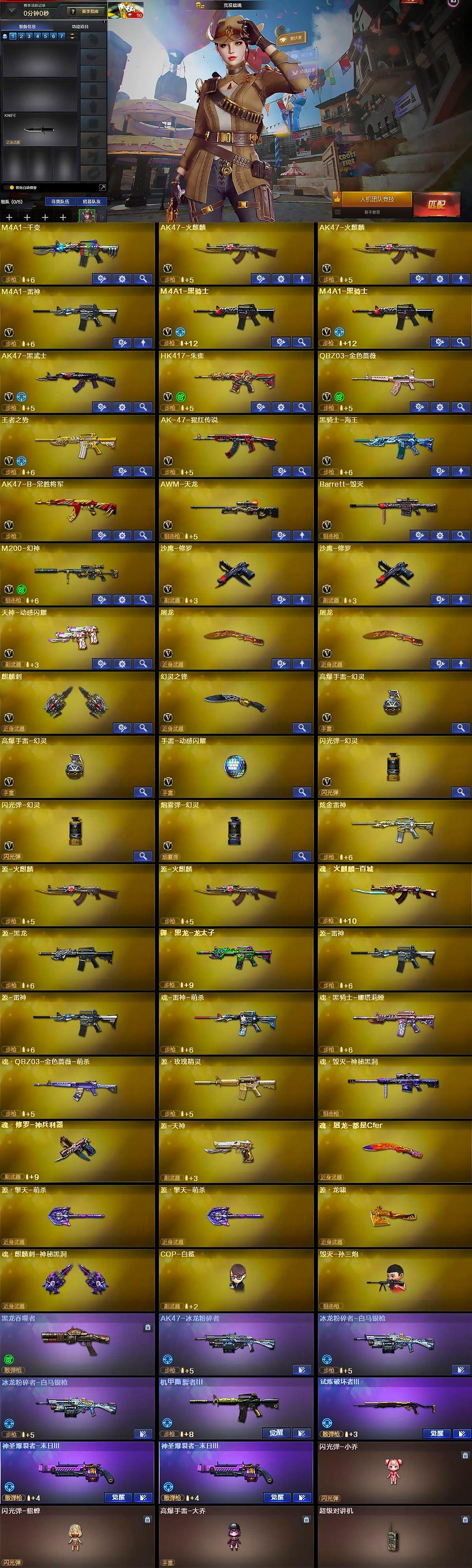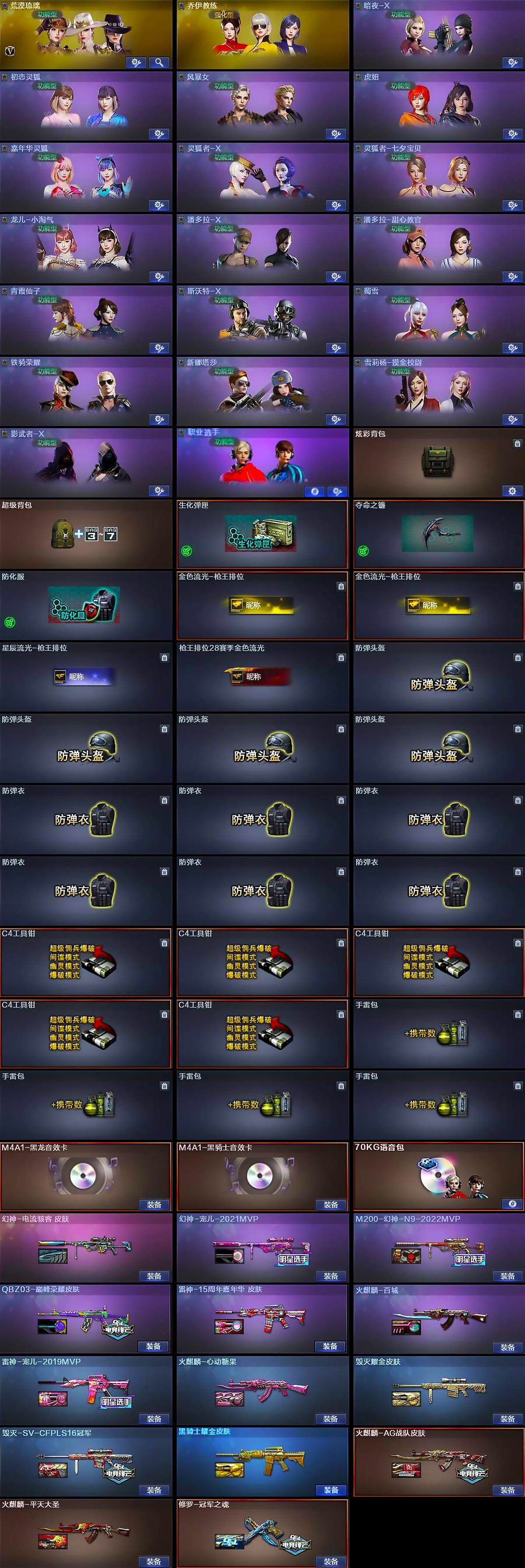 - [11526391]3粉装 5特效枪 12印记 可二次 可修改实名 优质装备:M16A4垂柳戏鸭,SCAR-L-锦绣绵绵,M416电玩时刻,Kar98K-巳巳如意 热门装扮:朗月武圣,未来歌姬,创世·救赎,鹰眼刺客,梦魇先生 稀有枪皮:DP-28-豹影疾电 五级特效枪:五级Kar98K-巳巳如意,五级DP-28-豹影疾电,五级M416-电玩时刻,五级SCAR-L-锦绣绵绵,五级M16A4-垂柳戏鸭 紫色装扮:田园牧歌,轻风白浪,SS22特训,SS23特训,幻彩翩翩,妙红点点,龙舌兰冰茶,白兰地假日,娇憨猪猪,萌趣咩咩,SS21特训,浪漫假日,SS31特训套装,云霄猎人,人气偶像,军械专家,冰川特警,冷焰舞者,旭日情侣,SS33特训套装,顶瓜瓜,SS20特训,猎梦纪元,SS19特训,甜心亚梦,虚音幻奏,SS18特训,都市魅力,酒红色名流,野性战心,长空猛禽,雨林探路者,雪山征服者,霓虹街区,霸义无双,青年教官,青春校园,风暴特警,缤纷果语,苍穹猎鹰,荣耀,蓝彩潮人,蓝色运动,血色贵族,街头潮人,超能勇士,绛羽幽主,飞行日记,龙腾端午,魅力单车,鹤鸣,麻辣教官,黄色伏地魔,黄色名流,黄色运动,黑色伏地魔,龙的传人,龟仙人,冰河战士,蝶变,香桃花海,沙漠毒蛇,极地朋克,极速红龙,柠萌假日,橘黑制服,沙漠兵团,活力之心,派对绅士,海岛探路者,涂山之恋,深蓝色名流,清新柠檬,幻影武者,坚韧舞者,完美偶像,帅气教官,幻世战舞者,战地督导,探宝勇士,湖蓝色名流,绮丽涂鸦,甜蜜菠萝,白熊同盟,白色伏地魔,破晓战魂,破蛋小黄鸡,甜蜜告白,空岛之星,空投萌叽,竞技达人朋克,红色运动,王牌教练,牛气冲天,灰色格斗者,灼焰舞者,炫蓝之夏,热血骑手,燃烧卡路里,牛气满满,猛禽,特战英豪,特殊使命,特训学院,猎鹰,SS29特训,拉斐尔,星途旅人,创世·幻影,纯真浪花,热情海星,SS28特训,卖崽青蛙,创世·追猎,冰公主,红潮炫舞,鱼渊荷华,玉兔迎春,燕燕于飞,竞技名士,许七安,情公主,惊鸿侠骨,甜梦熊熊,神气柴柴,懵萌河马,SS24特训(SS24特训套装),SS25特训,绝对偶像,锦衣飞扬,粉红小猪,焰鹰斗篷,幻羽潜行,SS27特训,SS26特训,春光漫游,快闪甜心,贝斯之夜,智谋强哥,精神漫游,格斗专家,核芯基因,大橘大利,耀粉歌者,SS32特训服(SS32特训套装),青玉碎影,绯格组合,萌黄之夏,白糯汤圆,恋