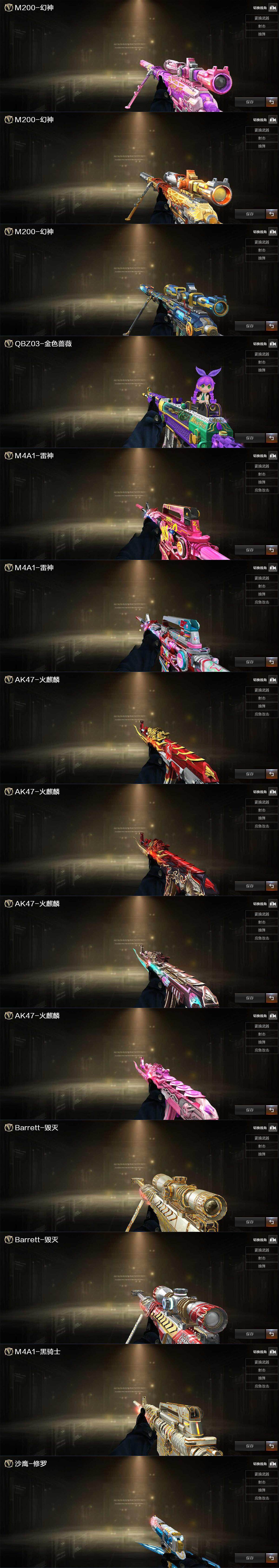 【皮肤】:幻神-宠儿-2021MVP,M200-幻神-N9-2022MVP,幻神-电流骇客 皮肤,QBZ03-巅峰荣耀皮肤,雷神-宠儿-2019MVP,雷神-15周年嘉年华 皮肤,火麒麟-AG战队皮肤,火麒麟-平天大圣,火麒麟-百城,火麒麟-心动糖果,毁灭耀金皮肤,毁灭-SV-CFPLS16冠军,黑骑士耀金皮肤,AK47-B-常胜将军-刘备,AK47-B-常胜将军-孙权,修罗-冠军之魂