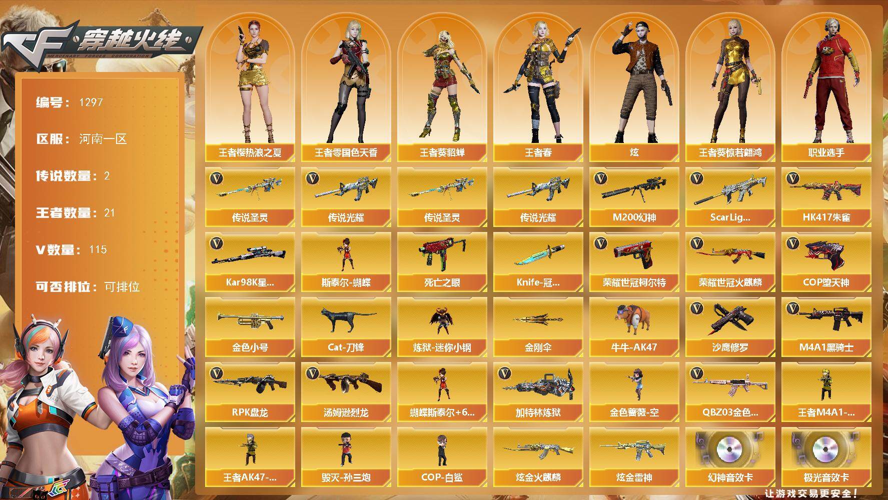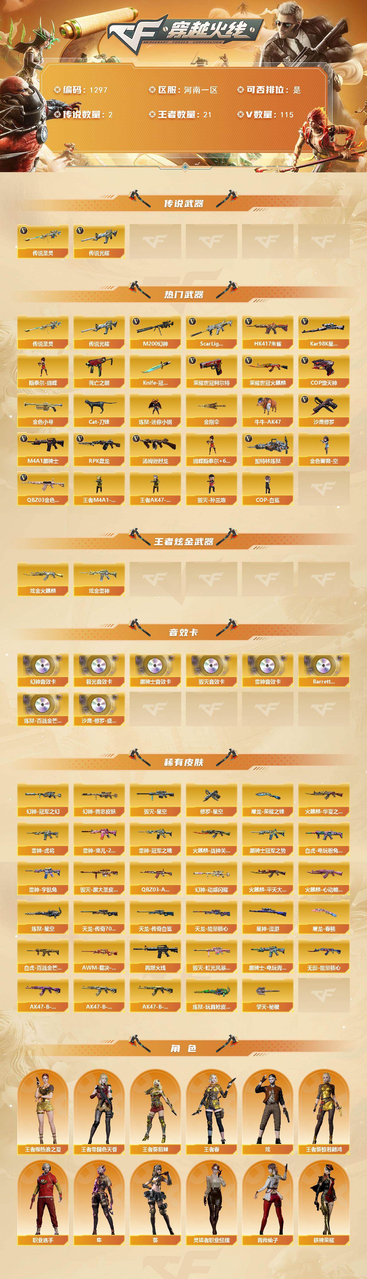 [15199037]河南一区-115V-21王者-2炫金 【传说武器】:传说光耀,传说圣灵 【热门武器】:传说光耀,传说圣灵,QBZ03-金色蔷薇,Scar Light-白虎,HK417-朱雀,M200-幻神,死亡之眼,荣耀世冠-火麒麟,荣耀世冠-柯尔特,Kar98K-星神,金色小号,Cat-刀锋,炼狱-迷你小钢,牛牛-AK47,M4A1-黑骑士*2,汤姆逊-烈龙*6,RPK-盘龙*6,加特林-炼狱,金色蔷薇-空,斯泰尔-蝴蝶,王者M4A1-萌萌金发刀锋,王者AK47-萌萌银发刀锋,毁灭-孙三炮,COP-白鲨,COP-堕天神,沙鹰-修罗*2,Knife-冠军之刃,金刚伞 【王者炫金武器】:炫金火麒麟,炫金雷神 【音效卡】:M200-幻神音效卡,M4A1-雷神音效卡*2,M4A1-黑骑士音效卡,Barrett-毁灭音效卡,Barrett-极光音效卡,Barrett-碧霄极光音效卡,炼狱-百战金芒-庆典舞曲音效卡,沙鹰-修罗-盛典舞曲音效卡 【皮肤】:M200-幻神-黄忠皮肤,幻神-冠军之幻,幻神-动感闪耀 皮肤,白虎-电玩粉兔皮肤,白虎-百战金芒 皮肤,QBZ03-AG-CFPLS19冠军,AWM-裁决-凤灵皮肤,星神-漫游,雷神-虎将,雷神-冠军之魄,雷神-宠儿-2019MVP,雷神-宇航兔皮肤,M4A1-再燃火线,火麒麟-华夏之心,火麒麟-战神关羽,火麒麟-平天大圣*2,火麒麟-心动糖果,毁灭-星空,毁灭-黑大圣皮肤*2,毁灭-虹光风暴 皮肤,黑骑士-冠军之势,黑骑士-电玩青兔皮肤,无影-能量核心*2,AK47-B-常胜将军-曹操,AK47-B-常胜将军-刘备,AK47-B-常胜将军-孙权,天龙-能量核心,AWM-天龙-传奇70KG,AWM-天龙-传奇白鲨,炼狱-星空,炼狱-玩具枪皮肤,修罗-星空,屠龙-荣耀之锋*2,屠龙-春桃 皮肤,擎天-秘银 【角色】:葵,炫,隼,战地猎狐,王者樱-热浪之夏,王者-零-国色天香,王者-葵-貂蝉,王者葵-惊若翩鸿,王者春,雪域霜狐,乔伊教练,云海玲珑,暗夜-X,初恋灵狐,芳心审判者,嘉年华灵狐,猎狐者-追月,灵狐者-X,灵狐者-七夕宝贝,灵狐者-职业经理,麻雀,曼陀罗-X,曼陀罗-礼服,玫瑰花神,潘多拉-X,潘多拉-甜心教官,青霞仙子,铁骑荣耀,兔囡囡,雪莉杨-摸金校尉,夜玫瑰-幻能朋克,影武者-X,游珑儿,职业选手 【人偶武器】:COP-白鲨,