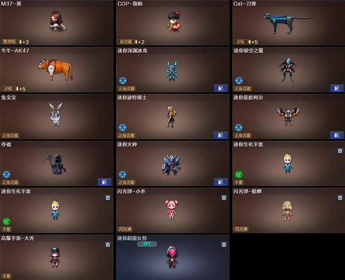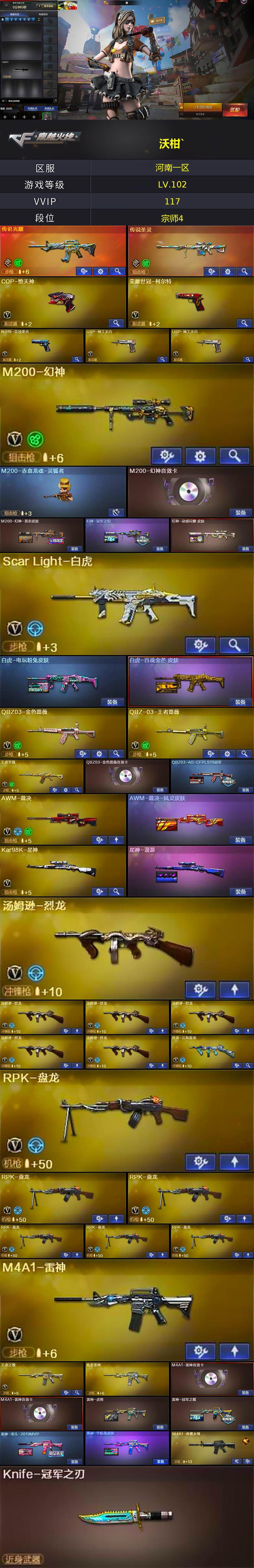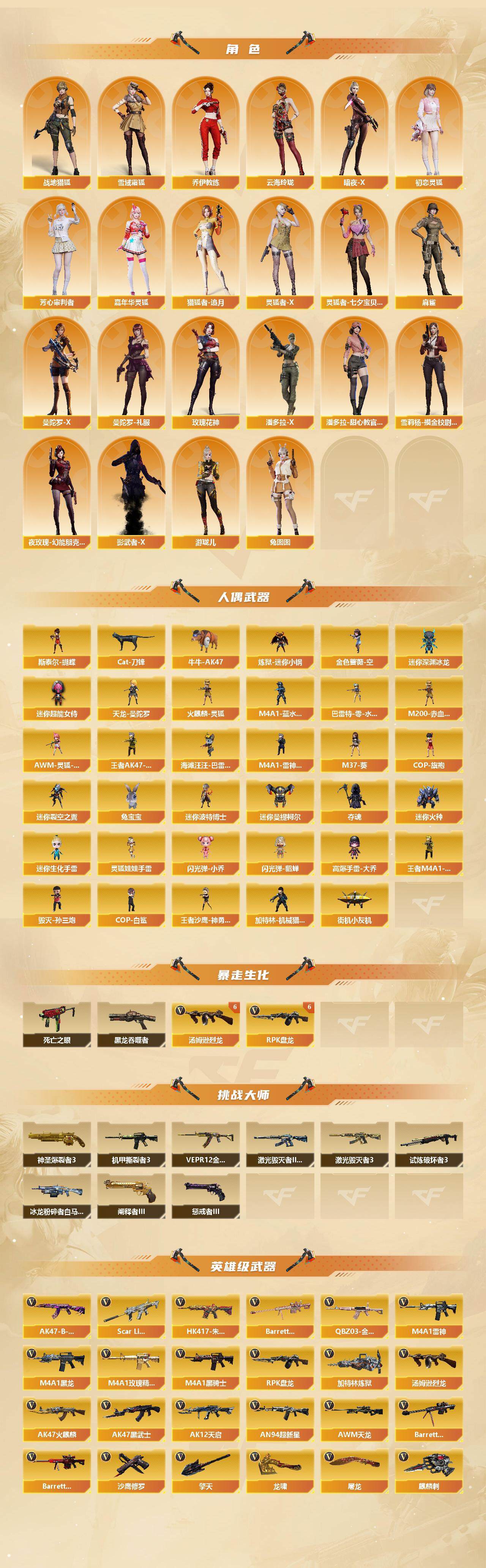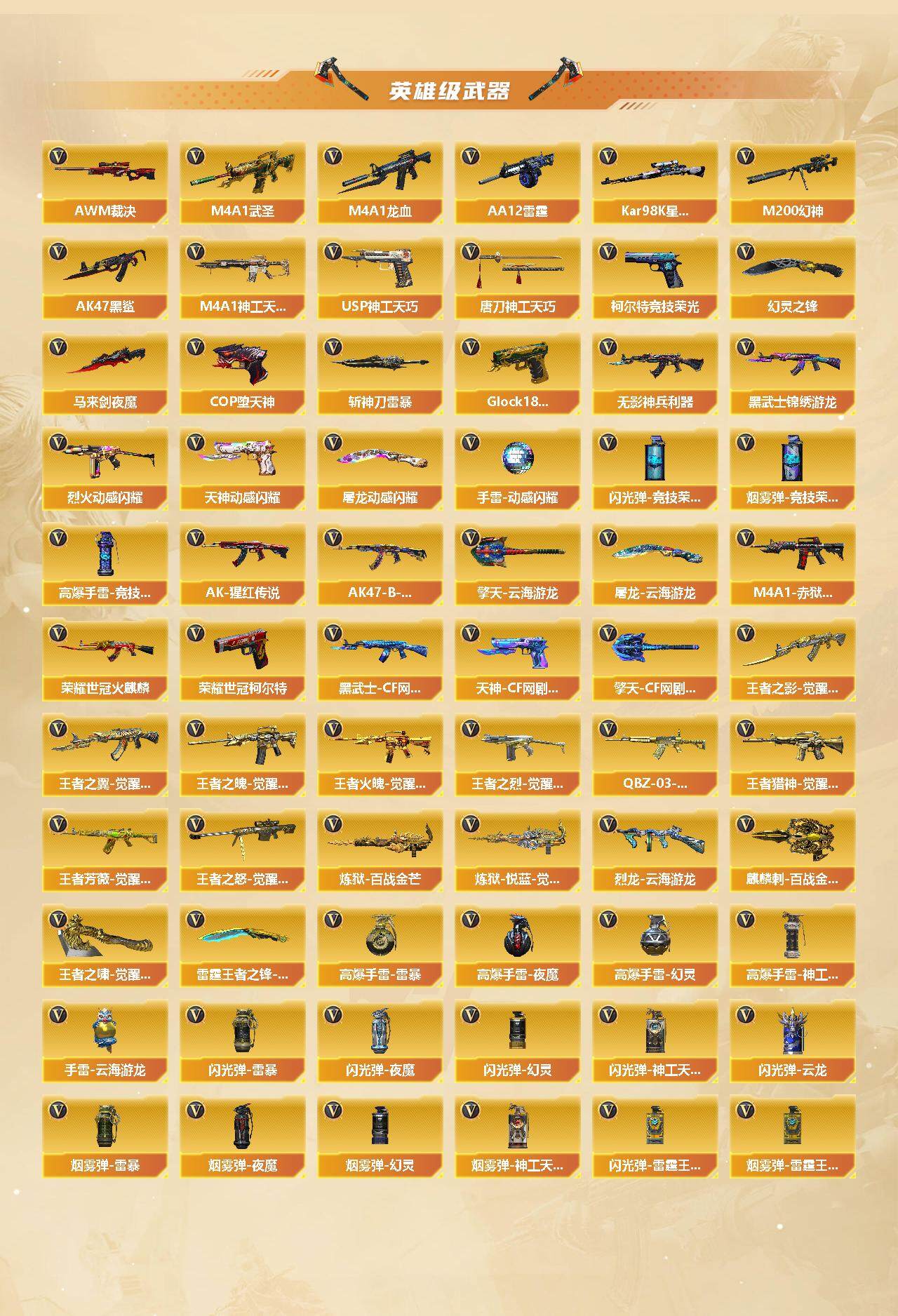 【热门武器】:传说光耀,传说圣灵,QBZ03-金色蔷薇,Scar Light-白虎,HK417-朱雀,M200-幻神,死亡之眼,荣耀世冠-火麒麟,荣耀世冠-柯尔特,Kar98K-星神,金色小号,Cat-刀锋,炼狱-迷你小钢,牛牛-AK47,M4A1-黑骑士*2,汤姆逊-烈龙*6,RPK-盘龙*6,加特林-炼狱,金色蔷薇-空,斯泰尔-蝴蝶,王者M4A1-萌萌金发刀锋,王者AK47-萌萌银发刀锋,毁灭-孙三炮,COP-白鲨,COP-堕天神,沙鹰-修罗*2,Knife-冠军之刃,金刚伞