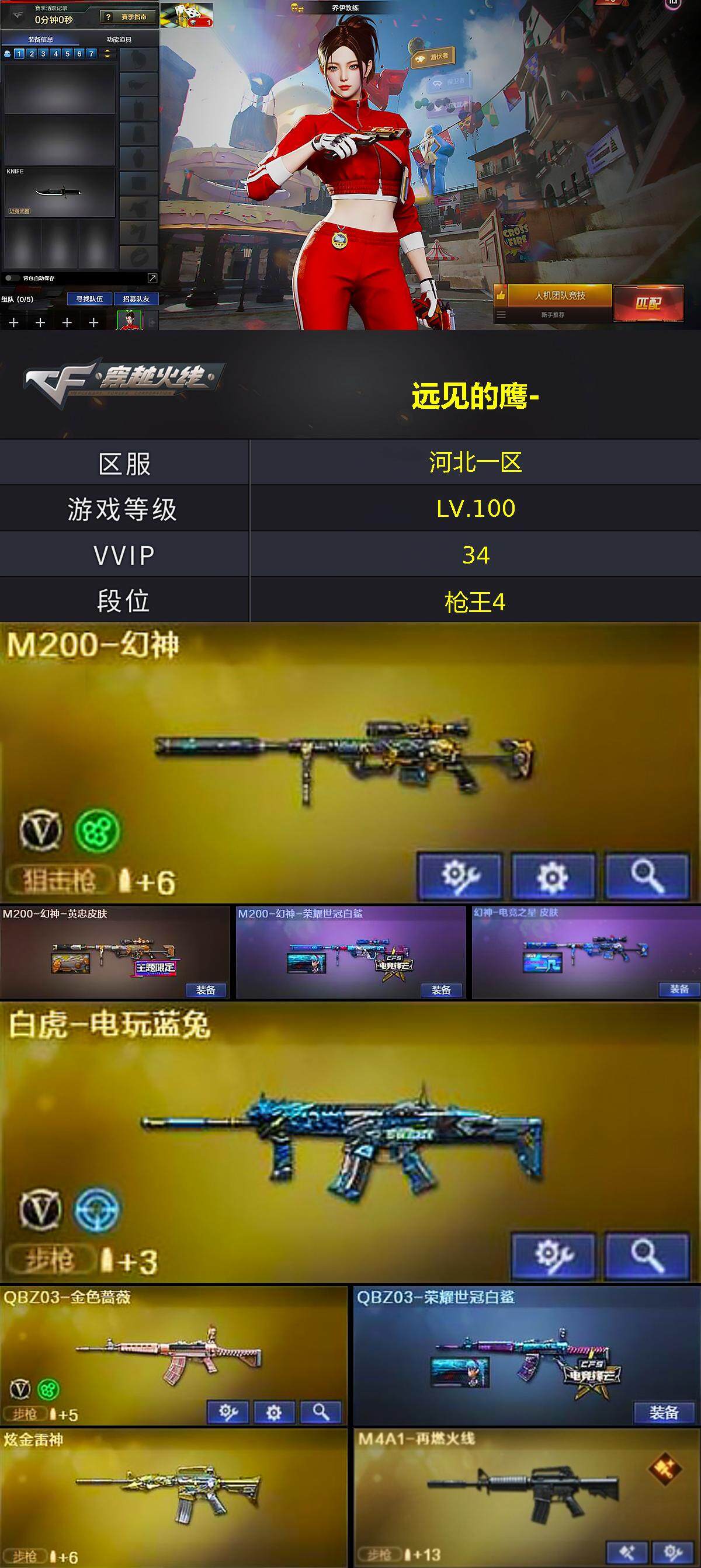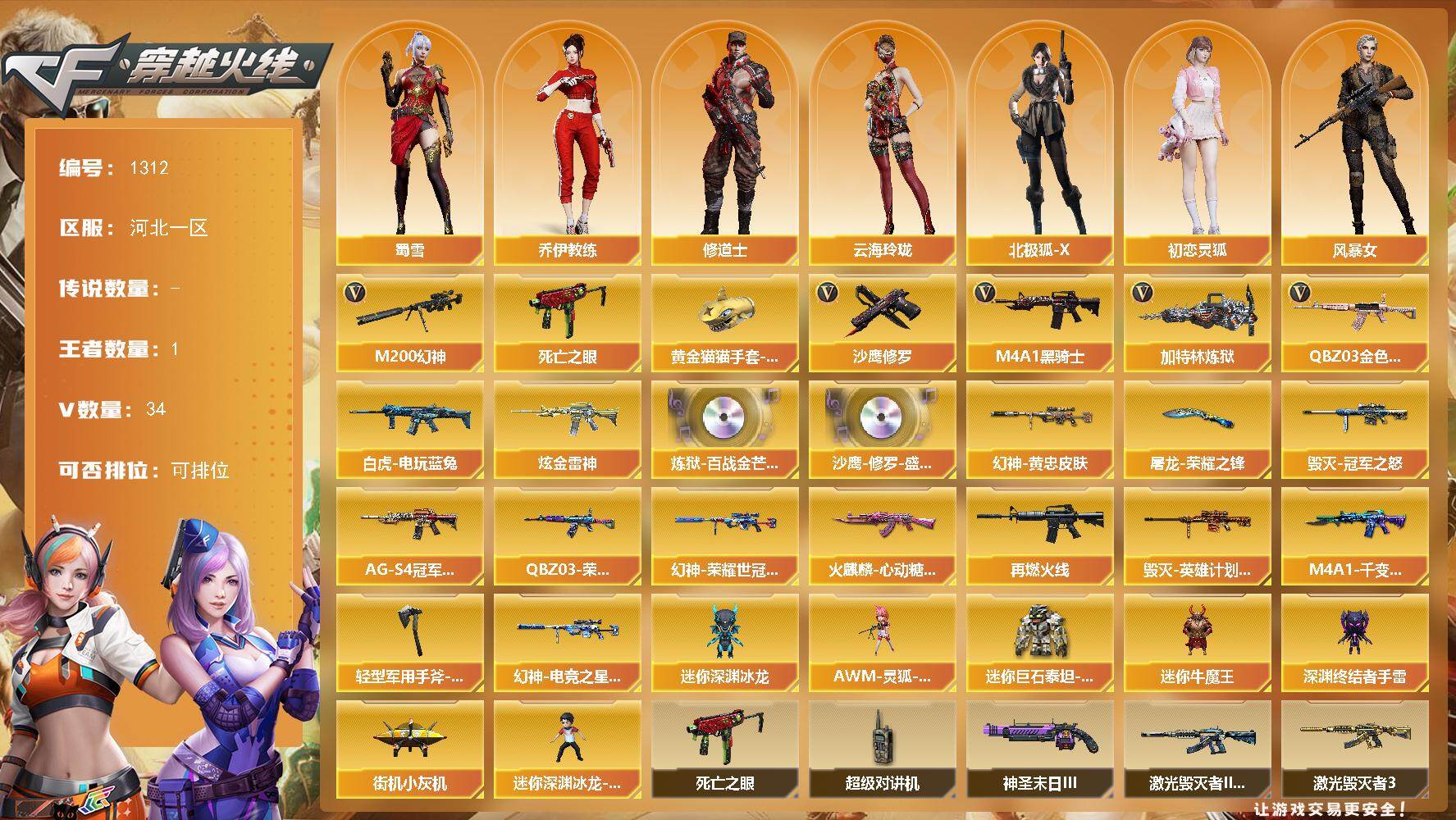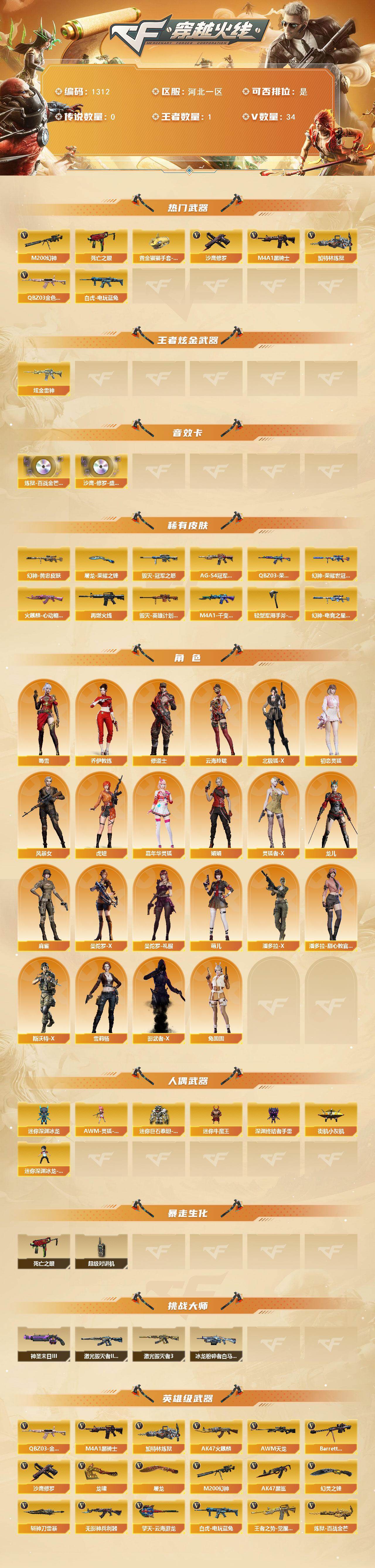 [15208979]河北一区-34V-1王者-1炫金 【热门武器】:QBZ03-金色蔷薇,M200-幻神,死亡之眼,白虎-电玩蓝兔,M4A1-黑骑士,加特林-炼狱,沙鹰-修罗*2,黄金猫猫手套-白鲨 【王者炫金武器】:炫金雷神 【音效卡】:炼狱-百战金芒-庆典舞曲音效卡,沙鹰-修罗-盛典舞曲音效卡 【皮肤】:M200-幻神-黄忠皮肤,M200-幻神-荣耀世冠白鲨,幻神-电竞之星 皮肤,QBZ03-荣耀世冠白鲨,M4A1-再燃火线,火麒麟-心动糖果,毁灭-冠军之怒,毁灭-英雄计划 皮肤,M4A1-千变-孔明皮肤,黑骑士-AG-S4冠军典藏,屠龙-荣耀之锋,轻型军用手斧-再燃火线 【角色】:乔伊教练,修道士,云海玲珑,北极狐-X,初恋灵狐,风暴女,虎妞,嘉年华灵狐,娟娟,灵狐者-X,龙儿,麻雀,曼陀罗-X,曼陀罗-礼服,萌儿,潘多拉-X,潘多拉-甜心教官,斯沃特-X,蜀雪,兔囡囡,雪莉杨,影武者-X 【人偶武器】:街机小灰机,AWM-灵狐-15周年嘉年华,迷你深渊冰龙,迷你牛魔王,深渊终结者手雷,迷你深渊冰龙-王绿豆,迷你巨石泰坦-魔花研究所 【暴走生化】:死亡之眼,超级对讲机 【挑战大师】:冰龙粉碎者-白马银枪,激光毁灭者III-白马银枪,激光毁灭者III*2,神圣爆裂者-末日III 【英雄级武器】:AK47-火麒麟,M4A1-黑骑士,AK47-黑鲨,无影-神兵利器,QBZ03-金色蔷薇,王者之势-觉醒版,白虎-电玩蓝兔,AWM-天龙,Barrett-毁灭,M200-幻神,加特林-炼狱,炼狱-百战金芒,沙鹰-修罗*2,屠龙,龙啸*2,幻灵之锋,擎天-云海游龙,斩神刀-雷暴,麒麟刺-百战金芒,高爆手雷-雷暴,高爆手雷-幻灵,手雷-云海游龙,闪光弹-雷暴,闪光弹-幻灵,烟雾弹-雷暴,烟雾弹-幻灵,Barrett-碧霄极光 【道具】:EP战队炫彩背包,XROCK炫彩背包,全能枪王背包,战舰背包,百战金芒炫彩背包,超级背包,女皇终结者-魔龙之吻,绿色巨人,灵魂忍者*2,迷雾幽灵,夺命之镰,防化服*3,金色流光-枪王排位*2,星辰流光-枪王排位,枪王排位28赛季金色流光,语音特效-盛典烟火,萌萌小葵表情,防弹头盔*8,防弹衣*8,C4工具钳*6,手雷包*8 【特殊枪械】:1黑骑士,1炼狱