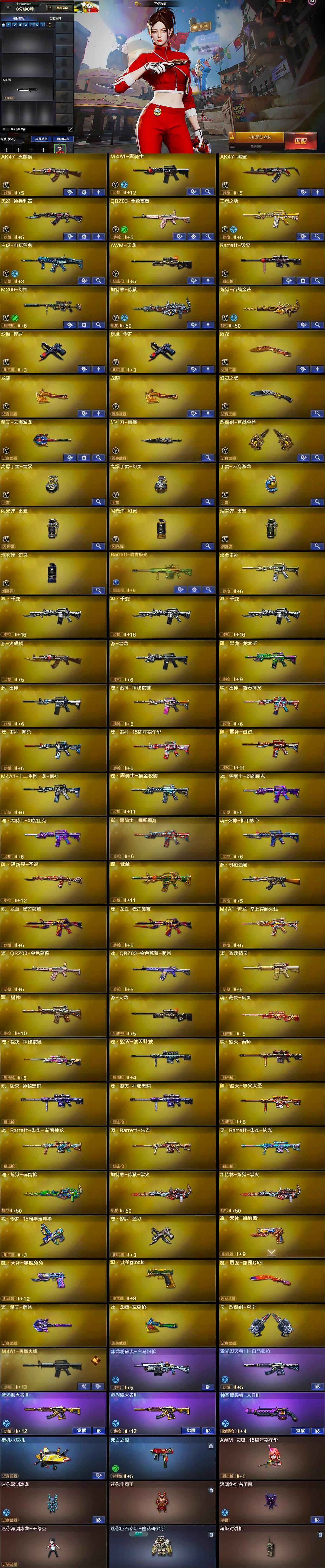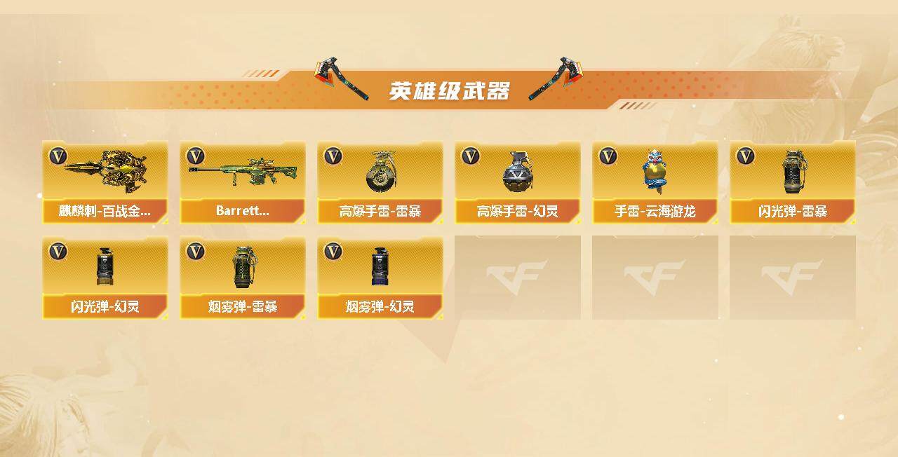 【英雄级武器】:AK47-火麒麟,M4A1-黑骑士,AK47-黑鲨,无影-神兵利器,QBZ03-金色蔷薇,王者之势-觉醒版,白虎-电玩蓝兔,AWM-天龙,Barrett-毁灭,M200-幻神,加特林-炼狱,炼狱-百战金芒,沙鹰-修罗*2,屠龙,龙啸*2,幻灵之锋,擎天-云海游龙,斩神刀-雷暴,麒麟刺-百战金芒,高爆手雷-雷暴,高爆手雷-幻灵,手雷-云海游龙,闪光弹-雷暴,闪光弹-幻灵,烟雾弹-雷暴,烟雾弹-幻灵,Barrett-碧霄极光
